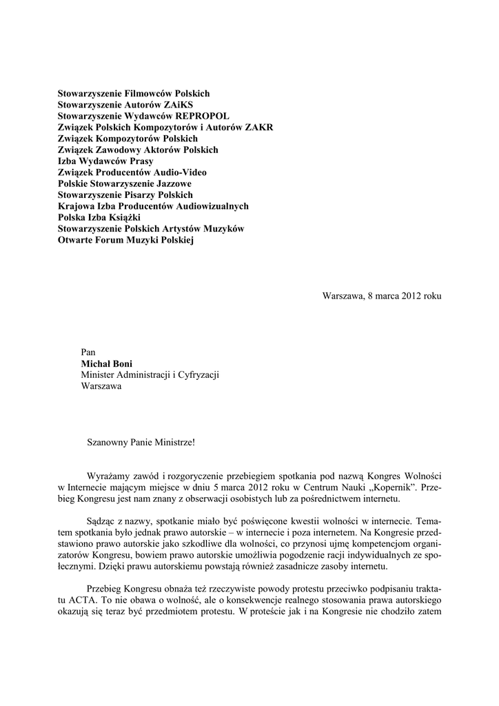 Stowarzyszenie Filmowców Polskich Stowarzyszenie Autorów ZAiKS Stowarzyszenie Wydawców REPROPOL Związek Polskich Kompozytorów i Autorów ZAKR Związek Kompozytorów Polskich Związek Zawodowy Aktorów Polskich Izba Wydawców Prasy Związek Producentów Audio-Video Polskie Stowarzyszenie Jazzowe Stowarzyszenie Pisarzy Polskich Krajowa Izba Producentów Audiowizualnych Polska Izba KsiąŜki Stowarzyszenie Polskich Artystów Muzyków Otwarte Forum Muzyki Polskiej Warszawa, 8 marca 2012 roku Pan Michał Boni Minister Administracji i Cyfryzacji Warszawa Szanowny Panie Ministrze! WyraŜamy zawód i rozgoryczenie przebiegiem spotkania pod nazwą Kongres Wolności w Internecie mającym miejsce w dniu 5 marca 2012 roku w Centrum Nauki „Kopernik”. Przebieg Kongresu jest nam znany z obserwacji osobistych lub za pośrednictwem internetu. Sądząc z nazwy, spotkanie miało być poświęcone kwestii wolności w internecie. Tematem spotkania było jednak prawo autorskie – w internecie i poza internetem. Na Kongresie przedstawiono prawo autorskie jako szkodliwe dla wolności, co przynosi ujmę kompetencjom organizatorów Kongresu, bowiem prawo autorskie umoŜliwia pogodzenie racji indywidualnych ze społecznymi. Dzięki prawu autorskiemu powstają równieŜ zasadnicze zasoby internetu. Przebieg Kongresu obnaŜa teŜ rzeczywiste powody protestu przeciwko podpisaniu traktatu ACTA. To nie obawa o wolność, ale o konsekwencje realnego stosowania prawa autorskiego okazują się teraz być przedmiotem protestu. W proteście jak i na Kongresie nie chodziło zatem 2 o nieuzasadnioną inwigilację obywateli, nieadekwatność przewidzianych kar za naduŜycia w internecie czy szkodliwe skutki walki z podróbkami. Chodziło tylko o to, aby nie płacić za ściąganie plików i za obracanie nimi w internecie. Nie zawahano się przy tym napiętnować autorów, producentów i wydawców, czyniąc z ich przeciwników wolności. Stwierdzamy z ubolewaniem, Ŝe podobnie jak ruch sprzeciwu, przebieg Kongresu trywializuje pojęcie wolności i obraŜa ludzi z poświęceniem o wolność zabiegających. W świetle Kongresu ruch okrzyknięty obywatelskim okazuje się roszczeniowym. W dodatku nie spontanicznym, nie oddolnym, ale – wydaje się – po części sprowokowanym. Fałszywe nazewnictwo przynosi złe skutki w sferze języka i etyki. Zwiększa napięcia i podziały społeczne. WyraŜamy zawód instrumentalizacją i naduŜywaniem pojęcia wolności dla korzyści grupowych. WyraŜamy sprzeciw wobec: formuły Kongresu, nieobecności na nim w roli panelistów przedstawicieli twórców, producentów, wydawców, ich prawnych oraz społecznych reprezentantów; tematów paneli z zawartą w nich tezą. Prowadzący panele lobbowali na rzecz portali oferujących treści ewidentnie nielegalne i zarabiających na ich dystrybucji. Zawód przyniosło dopuszczenie przez Pana Ministra do jednostronnej wypowiedzi działacza na rzecz tzw. wolnego internetu na zakończenie inauguracji Kongresu. Wypowiedź ta została odebrana jako pogardliwa dla kręgów tworzących wartości intelektualne i agitująca do zaboru owoców ich pracy. Przebieg Kongresu nie wróŜy dobrze zapowiadanej w czasie Kongresu dyskusji o prawie autorskim. Obawiamy się, Ŝe w obecnej surrealistycznej atmosferze, w czasie trwającej nagonki na właścicieli praw do dóbr kultury i nauki, wsparcia musimy szukać nie u Pana Ministra, ale poza Rządem RP, równieŜ w gwarantujących kulturę prawną instytucjach zagranicznych. Polska – jak wynika to z Pańskiej prezentacji – znajduje się na odległym 41 miejscu na świecie pod względem kreatywności i innowacyjności. Wprowadzenie w Ŝycie postulatu nieodpłatnego obrotu zasobami w internecie i takiego do zasobów tych dostępu spowoduje zuboŜenie oferty internetowej. Przestrzegamy przed walką z innowacyjnym zacofaniem przez degradowanie środowisk innowacyjnych. Tak waŜne dla nas wszystkich upowszechnienie kultury nie moŜe odbywać się kosztem rozwoju zasobów kulturowych i naukowych w internecie i poza nim. Prawo autorskie słuŜy temu rozwojowi. Wszelkie jego zmiany nie mogą przynosić negatywnych skutków w stale niedoinwestowanej sferze kreatywnej. KaŜda regulacja uwalniająca część zasobu kulturowego od płatności musi być wyrównana w jej skutkach ekonomicznych dla kultury i nauki przez inne regulacje o charakterze kompensującym. Cięcia bez rekompensat doprowadzą do degradacji zasobów internetowych, nie posłuŜą rzeszy internautów, nie zaspokoją ich postaw poznawczych. W końcu osłabią polską kreatywność w konfrontacji z zagraniczną. Przestrzeganie powyŜszego jako zasady postępowania umoŜliwi sensowny dialog z udziałem środowisk innowacyjnych i kreatywnych. Nie powierzajmy walki z polskim zacofaniem innowacyjnym zdeklarowanym przeciwnikom środowisk innowacyjnych. „Państwo ... musi poszukiwać równowagi pomiędzy interesem właścicieli praw autorskich a dobrem publicznym. Bezkrytyczne faworyzowanie którejkolwiek ze stron jest niedopuszczalne” (Obiegi Kultury. Centrum cyfrowe – Projekt Polska). 3 Z wyrazami szacunku, (w kolejności alfabetycznej) Jacek Bromski – Prezes Stowarzyszenia Filmowców Polskich Janusz Fogler – Prezes Stowarzyszenia Autorów ZAiKS Maciej Hoffman – Prezes Stowarzyszenia Wydawców REPROPOL Jacek Korczakowski – Prezes Związku Polskich Kompozytorów i Autorów ZAKR Jerzy Kornowicz – Prezes Związku Kompozytorów Polskich Janusz R. Nowicki – Prezes Związku Zawodowego Aktorów Polskich Wiesław Podkański – Prezes Izby Wydawców Prasy Andrzej Puczyński – Przewodniczący Zarządu Związku Producentów Audio-Video Krzysztof Sadowski – Prezes Polskiego Stowarzyszenia Jazzowego Sergiusz Sterna-Wachowiak – Prezes Stowarzyszenia Pisarzy Polskich Maciej Strzembosz – Prezes Krajowej Izby Producentów Audiowizualnych GraŜyna Szarszewska – Prezes Polskiej Izby KsiąŜki Antoni Wicherek – Prezes Stowarzyszenia Polskich Art