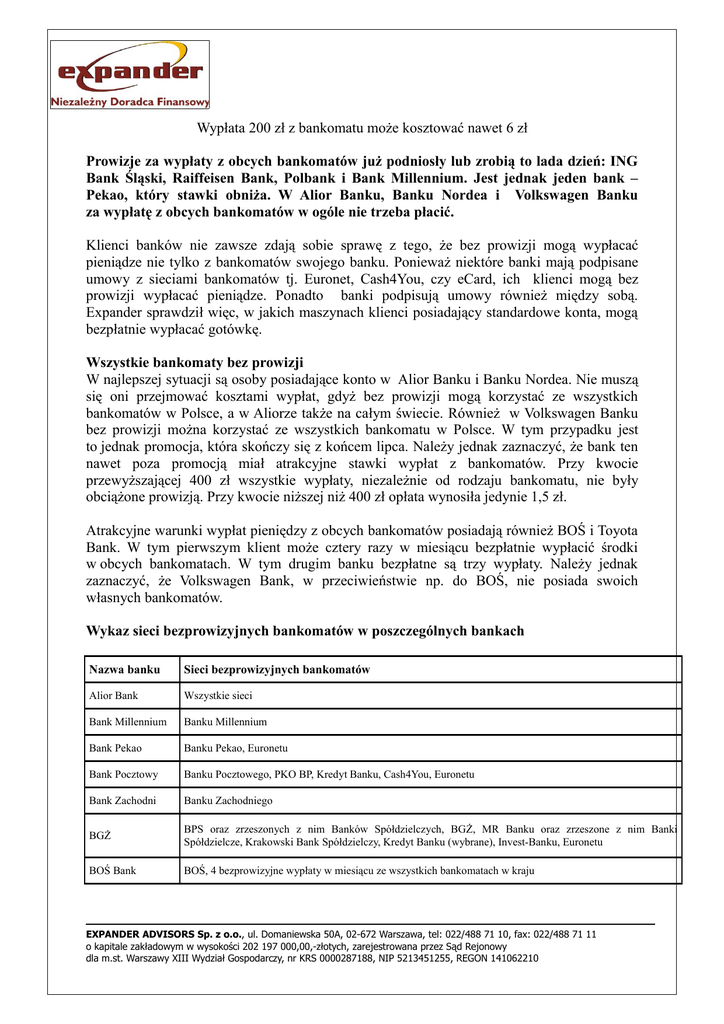 Wypłata 200 zł z bankomatu może kosztować nawet 6 zł Prowizje za wypłaty z obcych bankomatów już podniosły lub zrobią to lada dzień: ING Bank Śląski, Raiffeisen Bank, Polbank i Bank Millennium. Jest jednak jeden bank – Pekao, który stawki obniża. W Alior Banku, Banku Nordea i Volkswagen Banku za wypłatę z obcych bankomatów w ogóle nie trzeba płacić. Klienci banków nie zawsze zdają sobie sprawę z tego, że bez prowizji mogą wypłacać pieniądze nie tylko z bankomatów swojego banku. Ponieważ niektóre banki mają podpisane umowy z sieciami bankomatów tj. Euronet, Cash4You, czy eCard, ich klienci mogą bez prowizji wypłacać pieniądze. Ponadto banki podpisują umowy również między sobą. Expander sprawdził więc, w jakich maszynach klienci posiadający standardowe konta, mogą bezpłatnie wypłacać gotówkę. Wszystkie bankomaty bez prowizji W najlepszej sytuacji są osoby posiadające konto w Alior Banku i Banku Nordea. Nie muszą się oni przejmować kosztami wypłat, gdyż bez prowizji mogą korzystać ze wszystkich bankomatów w Polsce, a w Aliorze także na całym świecie. Również w Volkswagen Banku bez prowizji można korzystać ze wszystkich bankomatu w Polsce. W tym przypadku jest to jednak promocja, która skończy się z końcem lipca. Należy jednak zaznaczyć, że bank ten nawet poza promocją miał atrakcyjne stawki wypłat z bankomatów. Przy kwocie przewyższającej 400 zł wszystkie wypłaty, niezależnie od rodzaju bankomatu, nie były obciążone prowizją. Przy kwocie niższej niż 400 zł opłata wynosiła jedynie 1,5 zł. Atrakcyjne warunki wypłat pieniędzy z obcych bankomatów posiadają również BOŚ i Toyota Bank. W tym pierwszym klient może cztery razy w miesiącu bezpłatnie wypłacić środki w obcych bankomatach. W tym drugim banku bezpłatne są trzy wypłaty. Należy jednak zaznaczyć, że Volkswagen Bank, w przeciwieństwie np. do BOŚ, nie posiada swoich własnych bankomatów. Wykaz sieci bezprowizyjnych bankomatów w poszczególnych bankach Nazwa banku Sieci bezprowizyjnych bankomatów Alior Bank Wszystkie sieci Bank Millennium Banku Millennium Bank Pekao Banku Pekao, Euronetu Bank Pocztowy Banku Pocztowego, PKO BP, Kredyt Banku, Cash4You, Euronetu Bank Zachodni Banku Zachodniego BGŻ BPS oraz zrzeszonych z nim Banków Spółdzielczych, BGŻ, MR Banku oraz zrzeszone z nim Banki Spółdzielcze, Krakowski Bank Spółdzielczy, Kredyt Banku (wybrane), Invest-Banku, Euronetu BOŚ Bank BOŚ, 4 bezprowizyjne wypłaty w miesiącu ze wszystkich bankomatach w kraju EXPANDER ADVISORS Sp. z o.o., ul. Domaniewska 50A, 02-672 Warszawa, tel: 022/488 71 10, fax: 022/488 71 11 o kapitale zakładowym w wysokości 202 197 000,00,-złotych, zarejestrowana przez Sąd Rejonowy dla m.st. Warszawy XIII Wydział Gospodarczy, nr KRS 0000287188, NIP 5213451255, REGON 141062210 Deutsche Bank Deutsche Bank, Euronetu Dominet Bank Dominet Banku, Euronetu Fortis Bank Fortis Banku, Dominet Banku Getin Bank Euronetu, Getin Banku, BZ WBK, eCard ING Bank Śląski ING BŚ Invest-Bank Invest-Banku, BGŻ (wybrane), Kredyt Banku (wybrane) Kredyt Bank Cash4you, Euronetu, Global Cash, Zrzeszenie BPS i zrzeszone z nimi „Twoja Sieć” Lukas Bank Lukas Banku, BZ WBK mBank BZ WBK, Cash4You, eCard, Euronetu. Multibank Euronetu, BZ WBK, eCard, Cash4You Nordea Wszystkie sieci PKO BP PKO BP Polbank Polbank, Euronetu Raiffeisen Bank Euronetu, Raiffesien Banku Toyota Bank 3 bezprowizyjne wypłaty w miesiącu ze wszystkich bankomatach w kraju Volkswagen Bank wszystkie sieci*** Invest Banku, Krakowski Bank Spółdzielczy *** promocja w okresie 2.2.2009 – 31.7.2009 Nie wszystkie, ale dużo bezpłatnych bankomatów W dobrej sytuacji są również klienci Banku Pocztowego, BGŻ i Kredyt Banku. Banki te mają podpisanych wiele umów z innymi bankami i sieciami bankomatów, dzięki czemu klienci mają bardzo dobry dostęp do swoich pieniędzy. Nie mogą narzekać również klienci PKO BP i Pekao. Co prawda ten pierwszy bez prowizji pozwala wypłacać środki tylko z własnych bankomatów, a Pekao podpisał umowę jedynie z Euronetem. Nie można jednak zapomnieć o tym, że banki te posiadają bardzo dużo własnych bankomatów, z czego wiele także w mniejszych miejscowościach. Wyższe opłaty w czterech bankach Expander przyjrzał się również ofertom pod względem opłat jakie są naliczane, w przypadku wypłaty środków z obcych bankomatów i porównał je z poziomem z ubiegłego roku. Z zebranych danych wynika, że od maja 2008 r. większość banków nie zmieniła badanej opłaty. Cztery banki – ING Bank Śląski, Polbank, Millennium i Raiffeisen Bank – zdecydowały się na podwyżkę. Ten pierwszy przed rokiem naliczał prowizję wynoszącą 5 zł. Od 29 kwietnia 2009 r. zmieniona została jednak tabela opłat i obecnie prowizja wynosi już 3% wypłacanej kwoty, jednak nie mniej niż 5 zł. w rezultacie wypłacając 200 zł opłata EXPANDER ADVISORS Sp. z o.o., ul. Domaniewska 50A, 02-672 Warszawa, tel: 022/488 71 10, fax: 022/488 71 11 o kapitale zakładowym w wysokości 202 197 000,00,-złotych, zarejestrowana przez Sąd Rejonowy dla m.st. Warszawy XIII Wydział Gospodarczy, nr KRS 0000287188, NIP 5213451255, REGON 141062210 wzrosła z 5 zł do 6 zł. Polbank podniósł prowizję z 4 zł do 5 zł. W Najgorszej sytuacji już niedługo znajdą się natomiast klienci Raiffeisen Banku. Są oni bowiem przyzwyczajeni do bezprowizyjnego wypłacania gotówki ze wszystkich bankomatów. Od 1 czerwca bank zmieni jednak swoją tabelę opłat i prowizji i wprowadzi prowizję za wypłaty z bankomatów w kwocie 3,99 zł. Uważać powinni również klienci Banku Millennium. Bank ten nie zmienił prowizji za wypłatę środków z ze wszystkich obcych bankomatów. Podwyższeniu uległa jednak wysokość prowizji za wypłaty z bankomatów Euronetu – z 1 zł do 5 zł. Stawki prowizji za wypłatę środków z obcego bankomatu Nazwa banku Stan na maj 2009 Stan na maj 200