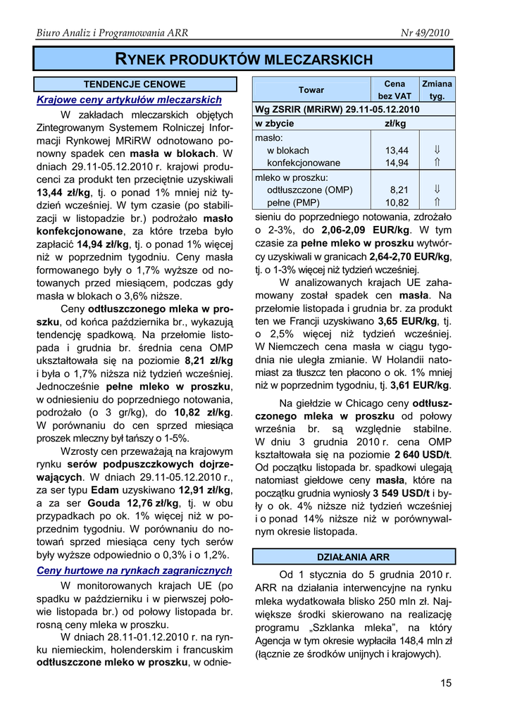 Biuro Analiz i Programowania ARR Nr 49/2010 RYNEK PRODUKTÓW MLECZARSKICH TENDENCJE CENOWE Krajowe ceny artykułów mleczarskich W zakładach mleczarskich objętych Zintegrowanym Systemem Rolniczej Informacji Rynkowej MRiRW odnotowano ponowny spadek cen masła w blokach. W dniach 29.11-05.12.2010 r. krajowi producenci za produkt ten przeciętnie uzyskiwali 13,44 zł/kg, tj. o ponad 1% mniej niŜ tydzień wcześniej. W tym czasie (po stabilizacji w listopadzie br.) podroŜało masło konfekcjonowane, za które trzeba było zapłacić 14,94 zł/kg, tj. o ponad 1% więcej niŜ w poprzednim tygodniu. Ceny masła formowanego były o 1,7% wyŜsze od notowanych przed miesiącem, podczas gdy masła w blokach o 3,6% niŜsze. Ceny odtłuszczonego mleka w proszku, od końca października br., wykazują tendencję spadkową. Na przełomie listopada i grudnia br. średnia cena OMP ukształtowała się na poziomie 8,21 zł/kg i była o 1,7% niŜsza niŜ tydzień wcześniej. Jednocześnie pełne mleko w proszku, w odniesieniu do poprzedniego notowania, podroŜało (o 3 gr/kg), do 10,82 zł/kg. W porównaniu do cen sprzed miesiąca proszek mleczny był tańszy o 1-5%. Wzrosty cen przewaŜają na krajowym rynku serów podpuszczkowych dojrzewających. W dniach 29.11-05.12.2010 r., za ser typu Edam uzyskiwano 12,91 zł/kg, a za ser Gouda 12,76 zł/kg, tj. w obu przypadkach po ok. 1% więcej niŜ w poprzednim tygodniu. W porównaniu do notowań sprzed miesiąca ceny tych serów były wyŜsze odpowiednio o 0,3% i o 1,2%. Ceny hurtowe na rynkach zagranicznych W monitorowanych krajach UE (po spadku w październiku i w pierwszej połowie listopada br.) od połowy listopada br. rosną ceny mleka w proszku. W dniach 28.11-01.12.2010 r. na rynku niemieckim, holenderskim i francuskim odtłuszczone mleko w proszku, w odnie- Towar Cena bez VAT Zmiana tyg. Wg ZSRIR (MRiRW) 29.11-05.12.2010 w zbycie zł/kg masło: w blokach konfekcjonowane 13,44 14,94 ⇓ ⇑ mleko w proszku: odtłuszczone (OMP) pełne (PMP) 8,21 10,82 ⇓ ⇑ sieniu do poprzedniego notowania, zdroŜało o 2-3%, do 2,06-2,09 EUR/kg. W tym czasie za pełne mleko w proszku wytwórcy uzyskiwali w granicach 2,64-2,70 EUR/kg, tj. o 1-3% więcej niŜ tydzień wcześniej. W analizowanych krajach UE zahamowany został spadek cen masła. Na przełomie listopada i grudnia br. za produkt ten we Francji uzyskiwano 3,65 EUR/kg, tj. o 2,5% więcej niŜ tydzień wcześniej. W Niemczech cena masła w ciągu tygodnia nie uległa zmianie. W Holandii natomiast za tłuszcz ten płacono o ok. 1% mniej niŜ w poprzednim tygodniu, tj. 3,61 EUR/kg. Na giełdzie w Chicago ceny odtłuszczonego mleka w proszku od połowy września br. są względnie stabilne. W dniu 3 grudnia 2010 r. cena OMP kształtowała się na poziomie 2 640 USD/t. Od początku listopada br. spadkowi ulegają natomiast giełdowe ceny masła, które na początku grudnia wyniosły 3 549 USD/t i były o ok. 4% niŜsze niŜ tydzień wcześniej i o ponad 14% niŜsze niŜ w porównywalnym okresie listopada. DZIAŁANIA ARR Od 1 stycznia do 5 grudnia 2010 r. ARR na działania interwencyjne na rynku mleka wydatkowała blisko 250 mln zł. Największe środki skierowano na realizację programu „Szklanka mleka”, na który Agencja w tym okresie wypłaciła 148,4 mln zł (łącznie ze środków unijnych i krajowych). 15 Biuro Analiz i Programowania ARR Nr 49/2010 Ceny zbytu (netto) masła i odtłuszczonego mleka w proszku (wg ZSRIR MRiRW) Masło ekstra konfekcjonowane zł/kg tygodniowa zmiana 1) w% 11-17.10.10 14,83 0,4 18-24.10.10 14,64 25-31.10.10 Masło ekstra w blokach zł/kg tygodniowa zmiana 1) w% 3,76 14,16 -1,4 -1,3 3,71 13,99 14,79 1,0 3,74 01-07.11.10 14,70 -0,6 08-14.11.10 14,68 15-21.11.10 Odtłuszczone mleko w proszku zł/kg tygodniowa zmiana 1) w% 3,59 8,86 0,7 2,25 -1,2 3,54 8,94 1,0 2,27 13,86 -0,9 3,51 8,86 -0,9 2,24 3,74 13,94 0,5 3,54 8,65 -2,4 2,20 -0,1 3,75 13,61 -2,3 3,48 8,65 0,0 2,21 14,68 0,0 3,73 13,58 -0,2 3,45 8,51 -1,6 2,16 22-28.11.10 14,74 0,4 3,71 13,59 0,0 3,42 8,35 -1,9 2,10 29.11-05.12.10 14,94 1,3 3,71 13,44 -1,1 3,34 8,21 -1,7 2,04 x 1,7 x x -3,6 x x -5,1 x x 3,5 x x -3,8 x x 3,2 x Tydzień Miesięczna zmiana cen w% Roczna zmiana cen w% 1) % zmiany cen odnoszą się do cen prezentowanych w zł/kg 2) wg średniego kursu walut w danym tygodniu (wg EBC): 1 EUR = EUR/kg 2) EUR/kg 2) EUR/kg 2) 4,0275 PLN (29.11-05.12.10) 16 Biuro Analiz i Programowania ARR Nr 49/2010 Ceny zbytu (netto) mleka spoŜywczego pasteryzowanego i mleka UHT (wg ZSRIR MRiRW) Mleko spoŜywcze pasteryzowane 2% Tydzień Mleko spoŜywcze UHT 3,2% zł/kg tygodniowa zmiana w% 11-17.10.10 1,63 18-24.10.10 Ogółem* zł/kg tygodniowa zmiana w% 0,4 1,64 1,64 0,2 25-31.10.10 1,65 01-07.11.10 2% zł/kg tygodniowa zmiana w% 0,0 1,64 1,65 0,1 0,5 1,65 1,64 -0,1 08-14.11.10 1,65 15-21.11.10 3,2% zł/kg tygodniowa zmiana w% 0,2 1,82 1,64 0,2 0,3 1,65 1,67 0,8 0,2 1,67 1,64 -0,6 22-28.11.10 1,65 29.11-05.12.10 Ogółem* zł/kg tygodniowa zmiana w% zł/kg tygodniowa zmiana w% 0,0 1,75 0,7 1,74 0,5 1,80 -1,0 1,76 0,6 1,74 -0,5 0,5 1,82 1,1 1,76 0,1 1,75 0,8 1,65 0,3 1,82 0,1 1,79 1,6 1,76 0,4 0,4 1,66 0,3 1,82 -0,1 1,77 -1,1 1,76 0,0 1,67 -0,4 1,65 -0,5 1,81 -0,7 1,75 -0,9 1,74 -1,0 0,5 1,67 0,0 1,65 0,3 1,82 0,7 1,75 -0,4 1,75 0,4 1,67 1,3 1,69 1,3 1,68 1,2 1,84 0,9 1,77 1,5 1,76 1,0 Miesięczna zmiana ceny w% x 1,4 x 1,3 x 1,3 x 0,9 x -0,9 x 0,4 Roczna zmiana ceny w% x 3,9 x 3,3 x 3,9 x 1,0 x 6,0 x 5,3 * cena średnia dla produktów o zawartości tłuszczu od 0,5% do pow. 3,5% 17 Biuro Analiz i Programowania ARR Nr 49/2010 Ceny przetworów mleczarskich na rynkach zagranicznych % zmiana średniej ceny Towar/Kraj Jednostka miary Średnia cena w zł/kg* Średnia cena Tygodniowa Miesięczna Roczna Ceny na rynkach wewnętrznych UE w okresie 28.11-01.12.10. masło w blokach Niemcy Francja Holandia odtłuszczone mleko w proszku Niemcy Francja Holandia pełne mleko w proszku Niemcy Francja Holandia EUR/kg EUR/kg EUR/kg EUR/kg EUR/kg EU
