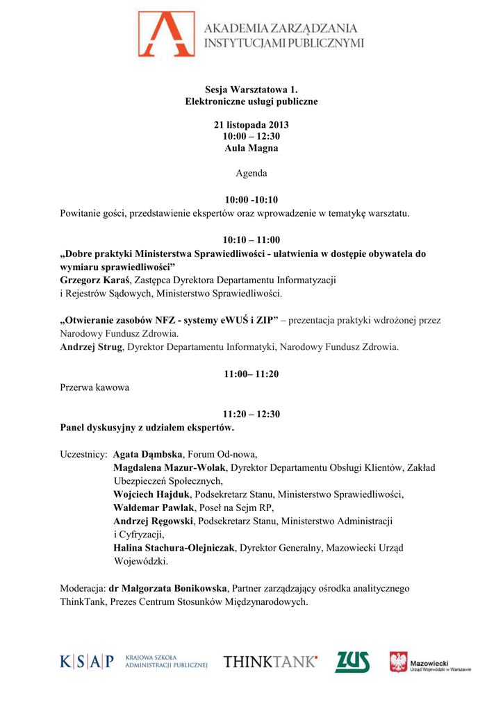 Sesja Warsztatowa 1. Elektroniczne usługi publiczne 21 listopada 2013 10:00 – 12:30 Aula Magna Agenda 10:00 -10:10 Powitanie gości, przedstawienie ekspertów oraz wprowadzenie w tematykę warsztatu. 10:10 – 11:00 „Dobre praktyki Ministerstwa Sprawiedliwości - ułatwienia w dostępie obywatela do wymiaru sprawiedliwości” Grzegorz Karaś, Zastępca Dyrektora Departamentu Informatyzacji i Rejestrów Sądowych, Ministerstwo Sprawiedliwości. „Otwieranie zasobów NFZ - systemy eWUŚ i ZIP” – prezentacja praktyki wdrożonej przez Narodowy Fundusz Zdrowia. Andrzej Strug, Dyrektor Departamentu Informatyki, Narodowy Fundusz Zdrowia. 11:00– 11:20 Przerwa kawowa 11:20 – 12:30 Panel dyskusyjny z udziałem ekspertów. Uczestnicy: Agata Dąmbska, Forum Od-nowa, Magdalena Mazur-Wolak, Dyrektor Departamentu Obsługi Klientów, Zakład Ubezpieczeń Społecznych, Wojciech Hajduk, Podsekretarz Stanu, Ministerstwo Sprawiedliwości, Waldemar Pawlak, Poseł na Sejm RP, Andrzej Ręgowski, Podsekretarz Stanu, Ministerstwo Administracji i Cyfryzacji, Halina Stachura-Olejniczak, Dyrektor Generalny, Mazowiecki Urząd Wojewódzki. Moderacja: dr Małgorzata Bonikowska, Partner zarządzający ośrodka analitycznego ThinkTank, Prezes Centrum Stosunków Międzynarodowych.