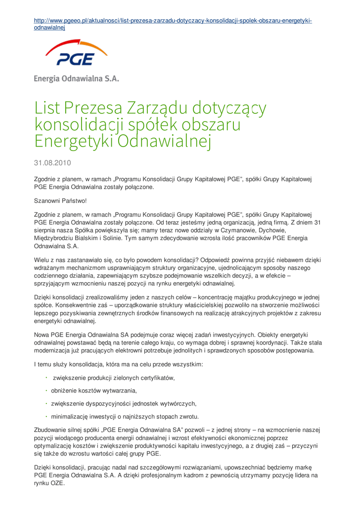 http://www.pgeeo.pl/aktualnosci/list-prezesa-zarzadu-dotyczacy-konsolidacji-spolek-obszaru-energetykiodnawialnej List Prezesa Zarządu dotyczący konsolidacji spółek obszaru Energetyki Odnawialnej 31.08.2010 Zgodnie z planem, w ramach „Programu Konsolidacji Grupy Kapitałowej PGE”, spółki Grupy Kapitałowej PGE Energia Odnawialna zostały połączone. Szanowni Państwo! Zgodnie z planem, w ramach „Programu Konsolidacji Grupy Kapitałowej PGE”, spółki Grupy Kapitałowej PGE Energia Odnawialna zostały połączone. Od teraz jesteśmy jedną organizacją, jedną firmą. Z dniem 31 sierpnia nasza Spółka powiększyła się; mamy teraz nowe oddziały w Czymanowie, Dychowie, Międzybrodziu Bialskim i Solinie. Tym samym zdecydowanie wzrosła ilość pracowników PGE Energia Odnawialna S.A. Wielu z nas zastanawiało się, co było powodem konsolidacji? Odpowiedź powinna przyjść niebawem dzięki wdrażanym mechanizmom usprawniającym struktury organizacyjne, ujednolicającym sposoby naszego codziennego działania, zapewniającym szybsze podejmowanie wszelkich decyzji, a w efekcie – sprzyjającym wzmocnieniu naszej pozycji na rynku energetyki odnawialnej. Dzięki konsolidacji zrealizowaliśmy jeden z naszych celów – koncentrację majątku produkcyjnego w jednej spółce. Konsekwentnie zaś – uporządkowanie struktury właścicielskiej pozwoliło na stworzenie możliwości lepszego pozyskiwania zewnętrznych środków finansowych na realizację atrakcyjnych projektów z zakresu energetyki odnawialnej. Nowa PGE Energia Odnawialna SA podejmuje coraz więcej zadań inwestycyjnych. Obiekty energetyki odnawialnej powstawać będą na terenie całego kraju, co wymaga dobrej i sprawnej koordynacji. Także stała modernizacja już pracujących elektrowni potrzebuje jednolitych i sprawdzonych sposobów postępowania. I temu służy konsolidacja, która ma na celu przede wszystkim: • zwiększenie produkcji zielonych certyfikatów, • obniżenie kosztów wytwarzania, • zwiększenie dyspozycyjności jednostek wytwórczych, • minimalizację inwestycji o najniższych stopach zwrotu. Zbudowanie silnej spółki „PGE Energia Odnawialna SA” pozwoli – z jednej strony – na wzmocnienie naszej pozycji wiodącego producenta energii odnawialnej i wzrost efektywności ekonomicznej poprzez optymalizację kosztów i zwiększenie produktywności kapitału inwestycyjnego, a z drugiej zaś – przyczyni się także do wzrostu wartości całej grupy PGE. Dzięki konsolidacji, pracując nadal nad szczegółowymi rozwiązaniami, upowszechniać będziemy markę PGE Energia Odnawialna S.A. A dzięki profesjonalnym kadrom z pewnością utrzymamy pozycję lidera na rynku OZE. Z pozdrowieniem, Krzysztof Konaszewski Prezes Zarządu PGE Energia Odnawialna S.A.