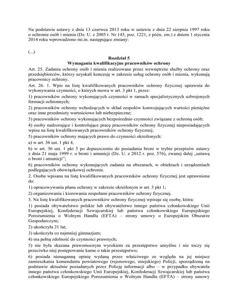 Na podstawie ustawy z dnia 13 czerwca 2013 roku w ustawie z dnia 22 sierpnia 1997 roku o ochronie osób i mienia (Dz. U. z 2005 r. Nr 145, poz. 1221, z późn. zm.) z dniem 1 stycznia 2014 roku wprowadzono mi.in. następujące zmiany: (...) Rozdział 5 Wymagania kwalifikacyjne pracowników ochrony Art. 25. Zadania ochrony osób i mienia realizowane przez wewnętrzne służby ochrony oraz przedsiębiorców, którzy uzyskali koncesję w zakresie usług ochrony osób i mienia, wykonują pracownicy ochrony. Art. 26. 1. Wpis na listę kwalifikowanych pracowników ochrony fizycznej uprawnia do wykonywania czynności, o których mowa w art. 3 pkt 1, przez: 1) pracowników ochrony wykonujących czynności w ramach specjalistycznych uzbrojonych formacji ochronnych; 2) pracowników ochrony wchodzących w skład zespołów konwojujących wartości pieniężne oraz inne przedmioty wartościowe lub niebezpieczne; 3) pracowników ochrony wykonujących bezpośrednio czynności związane z ochroną osób; 4) osoby nadzorujące i kontrolujące pracę pracowników ochrony fizycznej nieposiadających wpisu na listę kwalifikowanych pracowników ochrony fizycznej; 5) pracowników ochrony mających prawo do czynności określonych: a) w art. 36 ust. 1 pkt 4, b) w art. 36 ust. 1 pkt 5 po dopuszczeniu do posiadania broni w trybie przepisów ustawy z dnia 21 maja 1999 r. o broni i amunicji (Dz. U. z 2012 r. poz. 576), zwanej dalej „ustawą o broni i amunicji”; 6) pracowników ochrony wykonujących zadania na obszarach, w obiektach i urządzeniach podlegających obowiązkowej ochronie. 2. Osoba wpisana na listę kwalifikowanych pracowników ochrony fizycznej jest uprawniona do: 1) opracowywania planu ochrony w zakresie określonym w art. 3 pkt 1; 2) organizowania i kierowania zespołami pracowników ochrony fizycznej. 3. Na listę kwalifikowanych pracowników ochrony fizycznej wpisuje się osobę, która: 1) posiada obywatelstwo polskie lub obywatelstwo innego państwa członkowskiego Unii Europejskiej, Konfederacji Szwajcarskiej lub państwa członkowskiego Europejskiego Porozumienia o Wolnym Handlu (EFTA) – strony umowy o Europejskim Obszarze Gospodarczym; 2) ukończyła 21 lat; 3) ukończyła co najmniej gimnazjum; 4) ma pełną zdolność do czynności prawnych; 5) nie była skazana prawomocnym wyrokiem za przestępstwo umyślne i nie toczy się przeciwko niej postępowanie karne o takie przestępstwo; 6) posiada nienaganną opinię wydaną przez właściwego ze względu na jej miejsce zamieszkania komendanta powiatowego (rejonowego, miejskiego) Policji, sporządzoną na podstawie aktualnie posiadanych przez Policję informacji albo – w przypadku obywatela innego państwa członkowskiego Unii Europejskiej, Konfederacji Szwajcarskiej lub państwa członkowskiego Europejskiego Porozumienia o Wolnym Handlu (EFTA) – strony umowy o Europejskim Obszarze Gospodarczym oraz obywatela polskiego zamieszkałego na terenie tych państw – przez organ odpowiedniego szczebla i kompetencji tych państw, właściwy ze względu na miejsce zamieszkania tej osoby; 7) posiada zdolność fizyczną i psychiczną do wykonywania zadań, stwierdzoną orzeczeniami lekarskim i psychologicznym, których ważność nie upłynęła; 8) posiada przygotowanie teoretyczne i praktyczne w zakresie wyszkolenia strzeleckiego, samoobrony, technik interwencyjnych oraz znajomość przepisów prawa związanych z wykonywaniem ochrony osób i mienia. 4. Na listę kwalifikowanych pracowników ochrony fizycznej wpisuje się również osobę, której uznano kwalifikacje do wykonywania zawodu pracownika ochrony fizycznej na podstawie ustawy z dnia 18 marca 2008 r. o zasadach uznawania kwalifikacji zawodowych nabytych w państwach członkowskich Unii Europejskiej (Dz. U. Nr 63, poz. 394). 5. Opinię, o której mowa w ust. 3 pkt 6, wydaje się nie rzadziej niż co 3 lata, w formie postanowienia, na które służy zażalenie, a w przypadku opinii dotyczącej obywatela innego państwa członkowskiego Unii Europejskiej, Konfederacji Szwajcarskiej lub państwa członkowskiego Europejskiego Porozumienia o Wolnym Handlu (EFTA) – strony umowy o Europejskim Obszarze Gospodarczym oraz obywatela polskiego zamieszkałego na terenie tych państw, w formie przyjętej w tym państwie. 6. Spełnienie wymogów określonych w ust. 3 pkt 4 i 5 pracownik ochrony potwierdza własnym oświadczeniem złożonym pod rygorem odpowiedzialności karnej za składanie fałszywych zeznań. 7. Spełnienie wymogu określonego w ust. 3 pkt 8 potwierdzają: 1) dyplomy potwierdzające kwalifikacje zawodowe w zawodzie technika ochrony fizycznej osób i mienia lub świadectwa potwierdzające kwalifikacje w zawodzie technika ochrony fizycznej osób i mienia; 2) dyplomy lub świadectwa uczelni, szkół oficerskich lub podoficerskich Policji lub Straży Granicznej; 3) świadectwo szkolenia zawodowego zakończonego złożeniem egzaminu na pierwszy stopień podoficerski, chorążego lub oficerski Służby Więziennej wraz ze świadectwem szkolenia specjalistycznego w zakresie specjalizacji ochronnej w Służbie Więziennej; 4) zaświadczenia o ukończeniu kursów organizowanych przez ośrodki szkolenia Policji, Straży Granicznej, Służby Więziennej lub Biura Ochrony Rządu, o ile kursy te spełniają wymagania określone w przepisach wydanych na podstawie ust. 9; 5) zaświadczenie o ukończeniu kwalifikacyjnego kursu zawodowego lub kursu umiejętności zawodowych, potwierdzających przygotowanie teoretyczne i praktyczne w zakresie wyszkolenia strzeleckiego, samoobrony, technik interwencyjnych oraz znajomości przepisów prawa związanych z wykonywaniem ochrony osób i mienia, realizowanych zgodnie z przepisami wydanymi na podstawie art. 68a ust. 5 ustawy z dnia 7 września 1991 r. o systemie oświaty (Dz. U. z 2004 r. Nr 256, poz. 2572, z późn. zm.); 6) zaświadczenia o ukończeniu innych kursów potwierdzających przygotowanie teoretyczne i praktyczne w zakresie wyszkolenia strze
