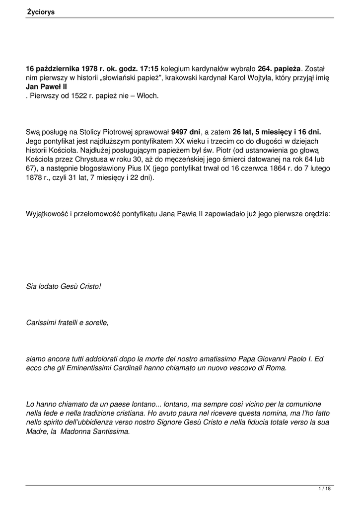 Życiorys 16 października 1978 r. ok. godz. 17:15 kolegium kardynałów wybrało 264. papieża. Został nim pierwszy w historii „słowiański papież”, krakowski kardynał Karol Wojtyła, który przyjął imię Jan Paweł II . Pierwszy od 1522 r. papież nie – Włoch. Swą posługę na Stolicy Piotrowej sprawował 9497 dni, a zatem 26 lat, 5 miesięcy i 16 dni. Jego pontyfikat jest najdłuższym pontyfikatem XX wieku i trzecim co do długości w dziejach historii Kościoła. Najdłużej posługującym papieżem był św. Piotr (od ustanowienia go głową Kościoła przez Chrystusa w roku 30, aż do męczeńskiej jego śmierci datowanej na rok 64 lub 67), a następnie błogosławiony Pius IX (jego pontyfikat trwał od 16 czerwca 1864 r. do 7 lutego 1878 r., czyli 31 lat, 7 miesięcy i 22 dni). Wyjątkowość i przełomowość pontyfikatu Jana Pawła II zapowiadało już jego pierwsze orędzie: Sia lodato Gesù Cristo! Carissimi fratelli e sorelle, siamo ancora tutti addolorati dopo la morte del nostro amatissimo Papa Giovanni Paolo I. Ed ecco che gli Eminentissimi Cardinali hanno chiamato un nuovo vescovo di Roma. Lo hanno chiamato da un paese lontano... lontano, ma sempre così vicino per la comunione nella fede e nella tradizione cristiana. Ho avuto paura nel ricevere questa nomina, ma l’ho fatto nello spirito dell’ubbidienza verso nostro Signore Gesù Cristo e nella fiducia totale verso la sua Madre, la Madonna Santissima. 1 / 18 Życiorys Non so se posso bene spiegarmi nella vostra... nostra lingua italiana. Se mi sbaglio mi correggerete. E così mi presento a voi tutti, per confessare la nostra fede comune, la nostra speranza, la nostra fiducia nella Madre di Cristo e della Chiesa, e anche per incominciare di nuovo su questa strada della storia e della Chiesa, con l’aiuto di Dio e con l’aiuto degli uomini. Niech będzie pochwalony Jezus Chrystus! Najdrożsi Bracia i Siostry, jeszcze przeżywamy wielki smutek z powodu śmierci naszego ukochanego papieża Jana Pawia I, a oto najdostojniejsi kardynałowie już powołali nowego Biskupa Rzymu. Powołali go z dalekiego kraju... z dalekiego, lecz zawsze tak bliskiego przez łączność w wierze i tradycji chrześcijańskiej. Bałem się przyjąć ten wybór, jednak przyjąłem go w duchu posłuszeństwa dla Pana naszego Jezusa Chrystusa i w duchu całkowitego zaufania Jego Matce, Najświętszej Maryi Pannie. Nie wiem, czy potrafię rozmawiać waszym... naszym językiem włoskim. Jeżeli się pomylę, to mnie poprawicie. Przedstawiam się wam wszystkim dzisiaj, by wyznać naszą wspólną wiarę, naszą nadzieję, naszą ufność pokładaną w Matce Chrystusa i Kościoła z pomocą Pana Boga i z pomocą ludzi. Jan Paweł II przyjmując z pokorą i głębokim zaufaniem posługę pasterzowania całemu Kościołowi, stał się sługą sług. Każdy dzień jego pontyfikatu wytacza drogę wiodącą do konkretnego człowieka, po to aby on, człowiek „na oścież otworzył drzwi Chrystusowi”. Jan Paweł II zmienił serca milionów ludzi i zmienił oblicze świata. Pontyfikat jego nazywany jest 2 / 18 Życiorys niezwykłym, wyjątkowym, wielkim. Mapę jego wielkości m. in. obrazują następujące wyznaczniki. Błogosławieni i święci Pontyfikat Jana Pawła II jest niezwykły pod względem liczby beatyfikacji i kanonizacji. Od 1588 r., kiedy papież Sykstus V ustanowił procedurę procesu kanonizacyjnego, aż do 1978 r., do czasu wyboru na Stolicę Piotrową Jana Pawła II, Kościół kanonizował 302 świętych. Jan Paweł II w czasie swego pontyfikatu, podczas 148 beatyfikacji ogłosił 1338 błogosławionych, w tym 160 Polaków i dwóch papieży, Jana XXIII i Piusa IX. Podczas 51 kanonizacji ogłosił 482 świętych, w tym 11 Polaków. Jan Paweł II jako pierwszy w dziejach papież beatyfikował małżeństwo, Marię i Luigi Beltrame Quattrocchi. Dokonując beatyfikacji i kanonizacji Jan Paweł II ukazywał nie tylko, że świętość dostępna jest dla każdego z nas, ale przede wszystkim przypominał, iż jest ona każdemu z nas zadana. Szafarz sakramentów Jan Paweł II jest pierwszym papieżem, który w praktyce łączył spoczywające na nim, jak na każdym biskupie, różne funkcje duszpasterskie. Jako pierwszy w historii biskup Rzymu regularnie odwiedzał parafie swojej diecezji i spotykał się ze swymi diecezjanami. Pierwszą zwizytowaną parafią była parafia p.w. św. Franciszka Ksawerego do której przybył 3 grudnia 1978 r., a zatem już ok. 7 tygodni po wyborze. Do końca 2004 r. nawiedził 317 parafii z 333 istniejących w Wiecznym Mieście. Od 2003 r., w związku z coraz większymi dolegliwościami 3 / 18 Życiorys utrudniającymi poruszanie się, Jan Paweł II nie nawiedzał kościołów, ale do Watykanu przybywały delegacje poszczególnych parafii. Nie tylko jako biskup, ale także jako „proboszcz całego świata” Jan Paweł II udzielał wiernym sakramentów. W ciągu swego pontyfikatu, podczas 67 obrzędów chrztu, które zazwyczaj sprawował w Niedzielę Chrztu Pańskiego w Kaplicy Sykstyńskiej, Jan Paweł II osobiście udzielił tego sakramentu 1501 osobom, w tym 687 dzieciom i 814 dorosłym . Także tego sakramentu udzielał podczas swych zagranicznych podróży m.in. w Akrze (Ghana), Nagasaki (Japonia), Onitshy (Nigeria), Wilnie i wielu innych miejscach. Po raz pierwszy Jan Paweł II udzielił sakramentu chrztu św., komunii św. i bierzmowania 11 petentom w Wielką Sobotę, 14 kwietnia 1979 r. w Bazylice św. Piotra. Każdego roku w Wielki Piątek Jan Paweł II zasiadał w konfesjonale Bazyliki św. Piotra i spowiadał wiernych. Błogosławił także nowożeńcom podczas uroczystości zaślubin. Każdego roku w Niedzielę Dobrego Pasterza Jan Paweł II udzielał diakonom święceń prezbiteratu. W sumie wyświęcił ponad 2800 kapłanów. 6 stycznia każdego roku, w uroczystość Objawienia Pańskiego udzielał natomiast święceń biskupich. Jan Paweł II konsekrował 321 mianowanych przez sieb