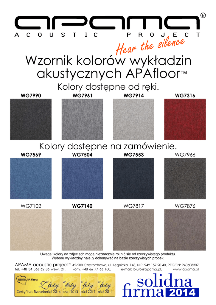 Wzornik kolorów wykładzin akustycznych APAfloor TM Kolory dostępne od ręki. WG7990 WG7961 WG7914 WG7316 Kolory dostępne na zamówienie. WG7569 WG7504 WG7553 WG7966 WG7102 WG7140 WG7817 WG7876 Uwaga: kolory na zdjęciach mogą nieznacznie różnić się od rzeczywistego produktu. Wyboru wykładziny należy dokonywać na bazie rzeczywistych próbek. APAMA acoustic project ® tel. +48 34 366 62 86 wew. 21, 42-200 Częstochowa, ul. Legnicka 148, NIP: 949 157 20 40, REGON: 240608307 kom. +48 66 77 66 100, e-mail: [email protected], www.apama.pl Kolory dostępne na zamówienie. Kolory w paski są kompatybilne z kolorami gładkimi. WG7213 WG7313 WG7823 WG7129 WG7807 WG7601 WG7616 WG7684 WG7830 WG7811 WG7181 WG7176 Uwaga: kolory na zdjęciach mogą nieznacznie różnić się od rzeczywistego produktu. Wyboru wykładziny należy dokonywać na bazie rzeczywistych próbek. APAMA acoustic project ® tel. +48 34 366 62 86 wew. 21, 42-200 Częstochowa, ul. Legnicka 148, NIP: 949 157 20 40, REGON: 240608307 kom. +48 66 77 66 100, e-mail: [email protected], www.apama.pl Kolory dostępne na zamówienie. Kolory w paski są kompatybilne z kolorami gładkimi. WG7966 WG7971 WG7916 WG7921 WG7996 WG7901 WG7541 WG7546 WG7576 WG7581 WG7556 WG7571 Uwaga: kolory na zdjęciach mogą nieznacznie różnić się od rzeczywistego produktu. Wyboru wykładziny należy dokonywać na bazie rzeczywistych próbek. APAMA acoustic project ® tel. +48 34 366 62 86 wew. 21, 42-200 Częstochowa, ul. Legnicka 148, NIP: 949 157 20 40, REGON: 240608307 kom. +48 66 77 66 100, e-mail: [email protected], www.apama.pl Spis kolorów kompatybilnych. 1. WG990 ---> WG971 ---> WG966 2. WG961 ---> WG916 ---> WG921 3. WG914 ---> WG901 ---> WG996 4. WG553 ---> WG546 ---> WG541 5. WG102 ---> WG181 ---> WG176 6. WG823 ---> WG811 APAMA acoustic project ® tel. +48 34 366 62 86 wew. 21, 42-200 Częstochowa, ul. Legnicka 148, NIP: 949 157 20 40, REGON: 240608307 kom. +48 66 77 66 100, e-mail: [email protected], www.apama.pl