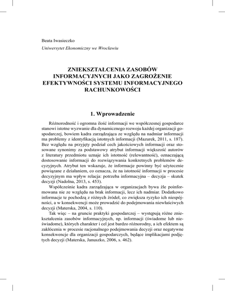 Beata Iwasieczko Uniwersytet Ekonomiczny we Wrocławiu ZNIEKSZTAŁCENIA ZASOBÓW INFORMACYJNYCH JAKO ZAGROŻENIE EFEKTYWNOŚCI SYSTEMU INFORMACYJNEGO RACHUNKOWOŚCI 1. Wprowadzenie Różnorodność i ogromna ilość informacji we współczesnej gospodarce stanowi istotne wyzwanie dla dynamicznego rozwoju każdej organizacji gospodarczej, bowiem kadra zarządzająca ze względu na nadmiar informacji ma problemy z identyfikacją istotnych informacji (Mazurek, 2011, s. 187). Bez względu na przyjęty podział cech jakościowych informacji oraz stosowane synonimy za podstawowy atrybut informacji większość autorów z literatury przedmiotu uznaje ich istotność (relewantność), oznaczającą dostosowanie informacji do rozwiązywania konkretnych problemów decyzyjnych. Atrybut ten wskazuje, że informacje powinny być użytecznie powiązane z działaniem, co oznacza, że na istotność informacji w procesie decyzyjnym ma wpływ relacja: potrzeba informacyjna – decyzja – skutek decyzji (Nadolna, 2013, s. 453). Współcześnie kadra zarządzająca w organizacjach bywa źle poinformowana nie ze względu na brak informacji, lecz ich nadmiar. Dodatkowo informacje te pochodzą z różnych źródeł, co zwiększa ryzyko ich niespójności, a w konsekwencji może prowadzić do podejmowania niewłaściwych decyzji (Materska, 2004, s. 110). Tak więc – na gruncie praktyki gospodarczej – występują różne zniekształcenia zasobów informacyjnych, np. informacji (świadome lub nieświadome), których charakter i cel jest bardzo różnorodny, a ich efektem są zakłócenia w procesie racjonalnego podejmowania decyzji oraz negatywne konsekwencje dla organizacji gospodarczych, będące implikacjami podjętych decyzji (Materska, Januszko, 2006, s. 462). 196 Beata Iwasieczko Na tym tle powstaje pytanie: za pomocą jakich metod można ograniczyć wpływ zniekształceń zasobów informacyjnych na efektywność systemu informacyjnego rachunkowości? 2. Zasoby informacyjne i ich zniekształcenia Zarządzanie zasobami informacyjnymi jest pojęciem, które ma różne znaczenia i interpretacje i często jest utożsamiane z zarządzaniem informacjami, gospodarką technologii informacyjnej lub zarządzaniem polityką informacyjną itp. (Wojciechowska-Filipek, 2013, s. 200). Według jednej z definicji zarządzanie zasobami informacyjnymi można określić jako zbiór zasad, technik, systemów oraz urządzeń, które określają informacyjno-komunikacyjną strukturę organizacji, będącą podstawą procesów podejmowania decyzji. O użyteczności podstawowego składnika zasobów informacyjnych, tzn. informacji, decyduje przypisanie jej znaczenia, czyli informacja, która tworzy wartość, to informacja użyteczna, adekwatna do decyzji, problemu, kompletna, wiarygodna, dostarczona we właściwym czasie i przez odpowiedni kanał komunikacyjny (Wojciechowska-Filipek, 2013, s. 200). Współczesnie obok braku informacji w organizacji gospodarczej mogą wystapić bariery informacyjne takie jak (Galewski, 2012, s. 465–468): – niedoskonałości generowania informacji – problem zależny od rodzaju źródła informacji (np. źródła pierwotne – selekcja obiektów do obserwacji, źródła wtórne – możliwość manipulacji generowaną informacją), – niska jakość informacji – jakość rozumiana jako stopień użyteczności informacji dla odbiorcy, – „klatka wiedzy” (pojęcie wprowadzone przez J. Oleńskiego), która oznacza (Oleński, 2001, s. 43) ograniczenia w procesie generowania informacji z punktu widzenia wiedzy posiadanej przez odbiorcę informacji, – subiektywizm interpretacji informacji – która zależy od: ilości otrzymywanych informacji, poziomu redundancji, posiadnej przez odbiorcę wiedzy itp., – nadmiar informacji, czyli otrzymywanie ilości informacji, których odbiorca nie jest w stanie przyswoić, przetworzyć, zinterpretować itp., – szumy informacyjne w kanałach informacyjnych, gdzie może dojść do zniekształcania informacji (np. szumy informacyjne: techniczne, organizacyjne, osobowościowe itp.). Informacja jako produkt może podlegać dolegliwościom takim jak: nadmiar, dwuznaczność, „anemia”, niespójność itp. W odniesieniu do informacji jako procesu wyróżniamy takie dolegliwości informacji jak: nie- Zniekształcenia zasobów informacyjnych jako zagrożenie… 197 wiarygodność, dystorsja, brak sprzężenia zwrotnego i „zawał informacyjny” (Włodarski, 2011, s. 44). Zniekształcenia pojawiające się w zasobach informacyjnych organizacji są spowodowane celowymi lub nieświadomymi zachowaniami nadawców, dostawców informacji (Materska, Januszko, 2006, s. 463). Na przykład do najczęstszych zniekształceń nieświadomych należą: dezaktualizacja informacji, przeładowanie informacjami, pomyłki, wypowiedzi wieloznaczne, informacja nieustrukturalizowana oraz pseudoinformacja (Materska, Januszko, 2006, s. 463–470). Wśród sposobów manipulowania informacją można wymienić między innymi (Materska, Januszko, 2006, s. 468–470): „przekazywanie danych nieprawdziwych, preparowanie i przesyłanie danych nieważnych lub mało ważnych z pominięciem najważniejszych; przekazywanie danych o dużym znaczeniu jako marginalnych, udostępnianie danych preparowanych w celu wywołania określonych reakcji, przesyłanie danych wieloznacznych, utrudniających zrozumienie; generowanie nadmiaru informacji itp.”. Często stosowaną techniką manipulacji informacją jest dezinformacja, która polega na celowym przekazywaniu fałszywej informacji, wprowadzającej w błąd odbiorcę (Materska, Januszko, 2006, s. 463–470; Januszko-Szakiel, 2010, s. 212). W manipulowaniu i dezinformowaniu celem jest tworzenie fałszywego obrazu otoczenia gospodarczego organizacji przez: pozorowanie mające na celu wprowadzenie odbiorcy w błąd, ograniczenie wpływu informacj prawdziwych, działania prowadzące do zaniku informacji pożądanej, jej deformacji lub wprowad