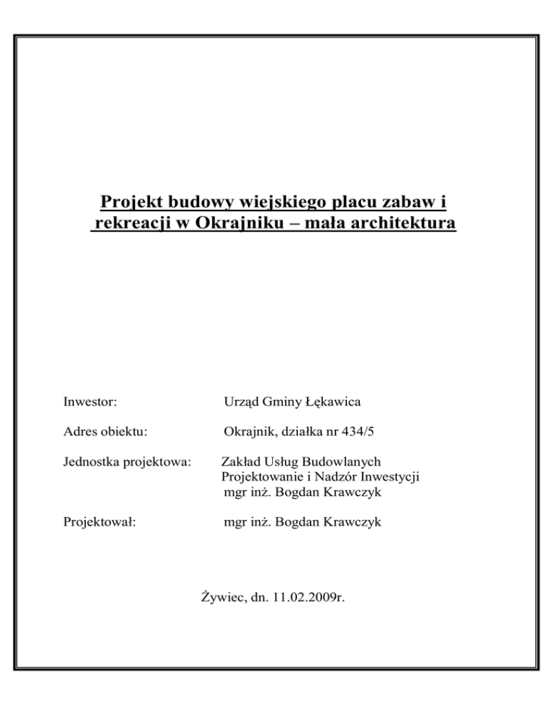 Projekt budowy wiejskiego placu zabaw i rekreacji w Okrajniku – mała architektura Inwestor: Urząd Gminy Łękawica Adres obiektu: Okrajnik, działka nr 434/5 Jednostka projektowa: Zakład Usług Budowlanych Projektowanie i Nadzór Inwestycji mgr inż. Bogdan Krawczyk Projektował: mgr inż. Bogdan Krawczyk Żywiec, dn. 11.02.2009r. ZAWARTOŚĆ OPRACOWANIA: 1. Część opisowa 1.1. Opis projektu 1.2. Przedmiar robót 2. Część rysunkowa 2.1. Rysunek 1 - Projekt zagospodarowania terenu - sytuacja skala 1:250 2.2. Rysunek 1a - Projekt zagospodarowania terenu skala 1:100 2.3. Rysunek 2 – Przekrój A-A skala 1:100 2.4. Rysunek 3 – detal 1 piaskownica skala 1:20 2.5. Rysunek 4 – detal 2 huśtawka dwuosobowa skala 1:20 2.6. Rysunek 5 – detal 3 zestaw wieżowy ‘GERWAZY’ skala 1:50 2.7. Rysunek 6 – detal 4 altana drewniana skala 1:20 2.8. Rysunek 7 – detal 5 przekrój chodnika skala 1:10 3. Załączniki Opis projektu 1. Przedmiot opracowania: Projekt budowy wiejskiego placu zabaw i rekreacji w Okrajniku – mała architektura 2. Dane ogólne: Inwestor – Urząd Gminy Łękawica Adres obiektu – Okrajnik, działka nr 434/5 Jednostka projektowa – Zakład Usług Budowlanych Projektowanie i Nadzór Inwestycji mgr inż. Bogdan Krawczyk Żywiec, ul. Jodłowa 26 Projektował – mgr inż. Bogdan Krawczyk 3. Zakres opracowania: Projekt zagospodarowania terenu ze szczegółowym opracowaniem elementów małej architektury oraz z zaprojektowaniem zieleni. 4. Stan istniejący: Teren niezabudowany, nieogrodzony z trzech stron, bez zadrzewień. 5. Projekt: Projekt zawiera plan zagospodarowania terenu z przeznaczeniem na plac zabaw i rekreacji z naniesionymi urządzeniami zabawowymi oraz projektowaną zielenią. 5.1. Ogrodzenie Projektowane ogrodzenie ma wysokość 70cm, z dwoma wejściami na teren placu zabaw: od strony szkoły oraz od strony utwardzonego placu (od północy). Słupki ze stalowych rur są zakotwione w fundamencie betonowym o wymiarach 20x20x80(H)cm. Słupki stalowe 60mm. co 2 m. zabetonowane betonem B-20 o wys. 70+80cm = 150cm. Firma wybrana do współpracy: BENDEX Sp. z o.o. Siedziba i zakład Biuro handlowe 16 - 010 Wasilków http://www.niskieogrodzenia.pl/ 5.2. Utwardzony plac Plac znajdujący się powyżej projektowanego placu zabaw zostanie utwardzony i nabierze postać placu wielofunkcyjnego. Z terenu o powierzchni 283m2 zostanie wybrany na głębokość 35cm grunt, a następnie teren zostanie zasypany warstwą pospółki rzecznej o grubości 25cm oraz przykryty warstwą klińca drobnego szarego (5-30mm) o grubości 10cm. 5.3. Chodnik Zaprojektowany chodnik ma szerokość 100cm, płyty chodnikowe szare 35x35x5cm oraz krawężnik betonowy szary, na dziesięciocentymetrowej warstwie piasku. 5.4. Piaskownica Piaskownica wykonana z kantówek sklejanych wzdłużnie, blaty ze sklejki antypoślizgowej, wymiary 280x280cm. Teren piaskownicy nie jest ogrodzony, gdyż cały teren placu zabaw jest ogrodzony i posiada zamykane wejścia, a regulamin placu zabrania wprowadzania na jego teren psów. 5.5. Huśtawka dwuosobowa Huśtawka z drewna klejonego wzmocniona belką metalową, siedziska gumowe podwieszone na łańcuchach - łożyskowana. Wymiary: Wys.2,5m. dł.3m. Belki montowane na metalowych kotwach, fundamentowane. Fundament betonowy prefabrykowany z marką stalową 300x40x8, beton B20. UWAGI: PRZYKRĘCIĆ MARKĘ ZE SŁUPKIEM ŚRUBĄ M12 5.6. Zestaw wieżowy ‘GERWAZY’ Rozbudowany zestaw wykonany z drewna klejonego. Zawiera zjeżdżalnię, mostek wiszący, ściankę wspinaczkową, drabinkę poziomą, tablicę do rysowania. Montowany na metalowych kotwach, fundamentowany. Fundament betonowy prefabrykowany z marką stalową 300x40x8, beton B20. UWAGI: PRZYKRĘCIĆ MARKĘ ZE SŁUPKIEM ŚRUBĄ M12 5.7. Altana Altana drewniana, skonstruowana z belek o przekroju 10cm, zadaszona, fundamentowana. Wymiary: dł.2,5m. szer.2m. wys.2,5m. Fundament betonowy prefabrykowany z marką stalową 300x40x8, beton B20. UWAGI: PRZYKRĘCIĆ MARKĘ ZE SŁUPKIEM ŚRUBĄ M12 6. Urządzenia zabawowe: Wszystkie urządzenia zabawowe występujące w projekcie są zgodne z zarówno polskimi jak i europejskimi normami oraz posiadają certyfikaty wydane przez Instytut Sportu /www.insp.pl/ Firmy wybrane do współpracy: - - BonderToys Henryk Bander ul. Kortowa 15 05-830 Wolica http://www.bondertoys.pl/ Akant Jacek Sławiński Rafał Chudzyński ul. Partyzantów 24 A 05-155 Leoncin http://www.akant.waw.pl/ UWAGA: Dopuszcza się stosowanie urządzeń równoważnych do zaproponowanych w projekcie z innych firm pod warunkiem, że posiadają certyfikaty wydane przez instytut sportu Przedmiar robót: I. Dostawa i montaż urządzeń poz. 1-7 1. Piaskownica 2. Huśtawka dwuosobowa 3. Ławka z oparciem 4. Kosz na śmieci 5. Tablica regulamin 6. Altanka 7. Zestaw Gerwazy Cj. 1 szt. 1 szt. 4 szt. 2 szt. 1 szt. 1 szt. 1 szt. II.Robocizna, materiał, sprzęt dla poz. 8-13 8. Ogrodzenie drewniane wys. 70cm. Na słupkach z rur stalowych 60 co 2 m . ` 9.Beton B-20 (0,2x0,2x0,8x 43) = 10.kliniec drobny szary 11.płyty chodnikowe 35/35/5 (31m2) 12.piasek na podsypkę chodnika 13.krawężnik chodnikowy 100/25/6 III. Zieleń: materiał i robocizna dla poz. 14-21 Wkład własny mieszkańców 14.Forsycja pośrednia 15.Krzewuszka cudowna 16.Pęchęrznica kalinolistna 17.Śliwa czerwonolistna 18.Ligustr pospolity 19.Bez lilak 20.Trawnik 21.Plac utwardzony Pospółka z transportem i robocizną 75 mb 1,376 m3 28,3m3 253szt. 5m3 65 szt. 6 szt. 6 szt. 7 szt. 4 szt. 150szt. 12 szt. 84 m2 84,9m3 Wartość pozycji