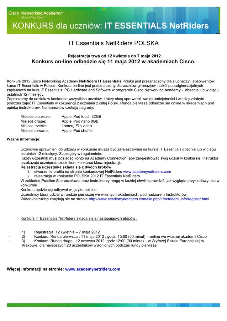 KONKURS dla uczniów: IT ESSENTIALS NetRiders IT Essentials NetRiders POLSKA Rejestracja trwa od 12 kwietnia do 7 maja 2012 Konkurs on-line odbędzie się 11 maja 2012 w akademiach Cisco. Konkurs 2012 Cisco Networking Academy NetRiders IT Essentials Polska uchaczy i absolwentów kursu IT Essentials w Polsce. Konkurs on-line jest przeznaczony dla uczniów gimnazjów i s zapisanych na kurs IT Essentials: PC Hardware and Software w programie Cisco Networking Academy - Essentials instruktorów. Na laureatow op Miejsce pierwsze: Miejsce drugie: Miejsce trzecie: Miejsce czwarte: Apple iPod touch 32GB Apple iPod nano 8GB Apple iPod shuffle Ważne informacje: Ucz , aby zarejestrowa sie. Instruktor przekazuje uczniom/uczestnikom konkursu klucz rejestracji. Rejestracja uczestnika składa się z dwóch kroków: 1. stworzenie profilu na stronie konkursowej NetRiders www.academynetriders.com 2. rejestracja w konkursie POLSKA 2012 IT Essentials NetRiders Practice Site uczniowie oraz konkursie Konkurs Uczestnicy udzi ierwszej . Wideohttp://www.academynetriders.com/file.php/1/netriders_info/register.html Konkurs IT Essentials NetRiders · · · : 1) Rejestracja: 12 kwietnia 7 maja 2012 2) Konkurs: Runda pierwsza : 11 maja 2012 , godz. 15;00 (50 minut) 3) Konkurs: Runda druga: 12 czerwca 2012, godz 12:00 (90 minut) Krakowie, dla onionych podczas rundy pierwszej Więcej informacji na stronie: www.academynetriders.com snej akademii Cisco