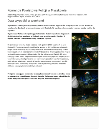 Komenda Powiatowa Policji w Myszkowie Źródło: http://myszkow.slaska.policja.gov.pl/k17/informacje/wiadomosci/46869,Dwa-wypadki-w-weekend.html Wygenerowano: Piątek, 3 marca 2017, 23:31 Dwa wypadki w weekend Myszkowscy Policjanci wyjaśniają okoliczności dwóch wypadków drogowych do jakich doszło w weekend w Żarkach oraz w miejscowości Zabijak. W wyniku zdarzeń cztery ranne osoby trafiły do szpitala. Myszkowscy Policjanci wyjaśniają okoliczności dwóch wypadków drogowych do jakich doszło w weekend w Żarkach oraz w miejscowości Zabijak. W wyniku zdarzeń cztery ranne osoby trafiły do szpitala. Do pierwszego wypadku doszło w sobotę około godziny 14:50 w Żarkach na ulicy Moniuszki. Z wstępnych ustaleń policjantów wynika, że 39- letni kierowca iveco nie ustąpił pierwszeństwa przejazdu i doprowadził do zderzenia z motocyklistą. 29-letni kierowca jednośladu z obrażeniami ciała trafił do szpitala. Drugi wypadek miał miejsce w niedzielę około godziny 0:45 na drodze DK- 1 w miejscowości Zabijak. 25- latek kierujący fiatem panda, najprawdopodobniej nie dostosował prędkości do panujących warunków ruchu, stracił panowanie nad kierowanym pojazdem i zjechał na pobocze, gdzie uderzył w betonowy mostek. W wyniku tego zdarzenia ranne zostały trzy 24letnie pasażerki, które trafiły do szpitala. Teraz myszkowscy policjanci wyjaśniają dokładne przyczyny i okoliczności tych zdarzeń. Policjanci apelują do kierowców o rozsądek oraz ostrożność na drodze, które są gwarantem szczęśliwego dotarcia do celu. Zwłaszcza teraz, gdy zbliża się Dzień Wszystkich Świętych i ruch na drogach jest coraz większy. Ocena: 0/5 (0) Tweetnij