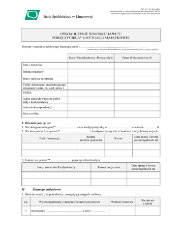 Zał. Nr 2 do Instrukcji kredytowania w zakresie kredytów mieszkaniowych DOM i kredytów hipotecznych udzielanych dla osób fizycznych Bank Spółdzielczy w Limanowej OŚWIADCZENIE WNIOSKODAWCY/ PORĘCZYCIELA* O SYTUACJI MAJĄTKOWEJ Dotyczy wniosku kredytowego łożonego przez :………......…………....……………………………… (wpisać imię i nazwisko Wnioskodawcy, jeżeli oświadczenie dotyczy poręczyciela) Dane Wnioskodawcy /Poręczyciela Dane Wnioskodawcy II Imię i nazwisko Imiona rodziców Data i miejsce urodzenia Cechy dokumentu stwierdzającego tożsamość (seria, nr, wyd. przez ) PESEL Adres zameldowania na pobyt stały i kod pocztowy Adres do korespondencji Stan cywilny I. Oświadczam /y, że: 1. Nie ubiegam /ubiegam**........................... się o kredyt/pożyczkę w …........……..…… w kwocie ………... zł 2. Nie korzystam /korzystam**...................................... z kredytów /pożyczek w bankach i innych instytucjach Bank /instytucja Rodzaj kredytu /pożyczki Data spłaty i kwota poszczególnych rat Kwota 3. Jestem/ nie jestem**........................... poręczycielem kredytu Imię i nazwisko Kredytobiorcy Kwota poręczenia Data spłaty i kwota poszczególnych rat Sytuacja majątkowa II 1. Oświadczam/y*, że posiadam/y* następujący majątek osobisty: Lp. 1 Wyszczególnienie z danymi charakterystycznymi mieszkanie ............................................... o pow.: ………… Wartość rynkowa Obciążenie z tytułu 2 3 4 dom mieszkalny: .................................... rok bud. ………… inne zabudowania: ………………………………………………………...……… gospodarstwo rolne/działka o pow.: ……………………..... samochody, ciągniki, maszyny, sprzęt: 5 …………………………………………………………….... 6 inwentarz żywy: ……………………………………………………………… 7 inne: ………………………..……………………………………… 2. Oświadczam/y*, że uzyskuję /my* miesięczne dochody netto z następujących źródeł: Wnioskodawca /Poręczyciel Wnioskodawca II dochód ze stosunku pracy dochody z prowadzonej działalności gospodarczej dochód z najmu emerytura /renta inne (podać źródła) 3. Moje /Nasze* dochody są /nie są** ...................................... obciążone sądowymi lub administracyjnymi tytułami egzekucyjnymi 4. Ilość osób na utrzymaniu ............................ 5. Imię i nazwisko współmałżonka ............................................................................................ ................................ (wpisać jeżeli oświadczenie dotyczy poręczyciela lub pomiędzy małżonkami istnieje rozdzielność majątkowa) 6. Stosunki majątkowe małżonków: wspólność ustawowa/rozdzielność majątkowa**.................................... 7. Oświadczam, że nie toczy /toczy się** ...................................... w stosunku do mnie postępowanie egzekucyjne 8. Upoważniam/y* Bank do sprawdzenia wiarygodności podanych danych we wniosku i załącznikach. Oświadczam, pod rygorem odpowiedzialności karnej przewidzianej w art. 297 § 1 Kodeksu karnego (Dz. U. Nr 88 poz. 553 z 1997 r. z późn. zmianami), że informacje podane w tym wniosku są zgodne ze stanem faktycznym. Miejscowość Data Podpis wnioskodawcy/ów /poręczyciela* ______________________________________ ______________________________________ */ niepotrzebne skreślić **/ wpisać
