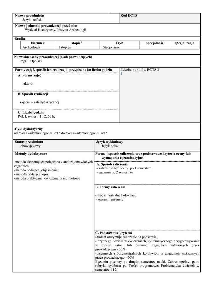 Nazwa przedmiotu Język łaciński Kod ECTS Nazwa jednostki prowadzącej przedmiot Wydział Historyczny/ Instytut Archeologii Studia kierunek Archeologia stopień I stopień Tryb Stacjonarne specjalność specjalizacja Nazwisko osoby prowadzącej (osób prowadzących) mgr J. Opolski Formy zajęć, sposób ich realizacji i przypisana im liczba godzin A. Formy zajęć Liczba punktów ECTS 3 4 lektorat B. Sposób realizacji zajęcia w sali dydaktycznej C. Liczba godzin Rok I, semestr 1 i 2, 60 h; Cykl dydaktyczny od roku akademickiego 2012/13 do roku akademickiego 2014/15 Status przedmiotu obowiązkowy Język wykładowy Język polski Metody dydaktyczne Forma i sposób zaliczenia oraz podstawowe kryteria oceny lub wymagania egzaminacyjne -metoda eksponująca połączona z analizą omawianych zagadnień -metoda podająca: objaśnienia; - metoda podająca: opis -metoda praktyczna: ćwiczenia przedmiotowe A. Sposób zaliczenia - zaliczenie bez oceny po 1 semestrze - egzamin po 2 semestrze B. Formy zaliczenia - śródsemestralne kolokwia; - egzamin pisemny C. Podstawowe kryteria Student otrzymuje zaliczenie na podstawie: - czynnego udziału w ćwiczeniach, systematycznego przygotowywania w formie ustnej lub pisemnej zagadnień wskazanych przez prowadzącego - 30% -pisemnych śródsemestralnych kolokwiów z zagadnień wskazanych przez prowadzącego - 70% Egzamin pisemny po drugim semestrze nauki. Zakres ogólny: patrz rubryka sylabusa pt. Treści programowe: Problematyka ćwiczeń w semestrze 1 i 2. Określenie przedmiotów wprowadzających wraz z wymogami wstępnymi A. Wymagania formalne: brak B. Wymagania wstępne: brak Cele przedmiotu - zapoznanie studentów z łacińską gramatyką, słownictwem i frazeologią umożliwiającą samodzielne tłumaczenie tekstów preparowanych. - zapoznanie studentów z popularnymi zwrotami, sentencjami, powiedzeniami Rzymian i wyrażeniami łacińskimi z czasów poklasycznych funkcjonującymi w języku polskim i w innych językach współczesnych; -zapoznanie studentów z wybranym zagadnieniami historii i kultury antycznej na podstawie tłumaczonych tekstów łacińskich; - wskazywanie śladów kultury antycznej w kulturze współczesnej. Treści programowe Problematyka ćwiczeń: 1 semestr: krótka historia języka łacińskiego, wymowa i akcent, deklinacje I-III, koniugacje I-IV: indicativus praesentis, imperfecti, futuri I activi i passivi; infinitivus praesentis activi i passivi; imperativus praesentis activi; konstrukcje zdaniowe ACI, NCI; dativus possessivus; zaimki osobowe, dzierżawcze, wskazujące, względne; tłumaczenie prostych tekstów; 2 semestr: deklinacje IV-V; liczebniki główne i porządkowe; stopniowanie przymiotników, tworzenie i stopniowanie przysłówków, participia; koniugacje: indicativus perfecti, plusquamperfecti, futuri II activi i passivi; konstrukcje zdaniowe, Ablativus Absolutus, Coniugatio periphrastica activa i passiva; tłumaczenie tekstów preparowanych i sentencji ilustrujących zagadnienia gramatyczne. Wykaz literatury A. Literatura wymagana do ostatecznego zaliczenia zajęć: A.1. wykorzystywana podczas zajęć: J. Czyżma, E. Roguszczak, Język łaciński, Gdańsk 2006; N. Grigorian, Disco linquam Latinam, Gdańsk 2004; B. Awianowicz, Język łaciński z elementami epigrafiki i numizmatyki rzymskiej, Toruń 2007; S. Wilczyński, T. Zarych, Rudimenta Latinitatis, Wrocław 1998, cz. 1 i 2. A.2. studiowana samodzielnie przez studenta: J. Czyżma, E. Roguszczak, Język łaciński, Gdańsk 2006. B. Literatura uzupełniająca: B.1 Podręczniki: J. Wikarjak, Gramatyka opisowa języka łacińskiego, Warszawa 1978; M. Wielewski, Krótka gramatyka języka łacińskiego, Warszawa 1986; M. Chudzikowska, Libellus exercitionum, Olsztyn 2004. B.2 Słowniki: K. Kumaniecki, Słownik łacińsko-polski, Warszawa 1986; J. Korpanty, Słownik łacińsko-polski, t. 1 -2, Warszawa 2001. Efekty uczenia się H1A_W02 H1A_W07 H1A_U01 H1A_U04 H1A_K01 H1A_K03 Wiedza K_W02 Ma uporządkowaną, podstawową wiedzę, obejmującą terminologię, teorie, metodologie i narzędzia opisu, z zakresu nauk humanistycznych i pokrewnych, właściwych dla kierunku archeologia K_W12 Zdaje sobie sprawę z różnorodności źródeł informacji. Rozumie ich przydatność w badaniach prahistorycznych. Umiejętności K_U01 Potrafi zdobywać, selekcjonować, analizować i utrwalać wiedzę z wykorzystaniem różnych źródeł w sposób uporządkowany i systematyczny K_U04 umie samodzielnie zdobywać wiedzę i rozwijać swoje umiejętności badawcze kierując się wskazówkami opiekuna naukowego Kompetencje społeczne (postawy) K_K01 Ma świadomość zakresu swojej wiedzy i umiejętności profesjonalnych, a także rozumie potrzebę dalszego, ciągłego rozwoju kompetencji w zakresie wybranej specjalności oraz ogólnohumanistycznym, jak też kompetencji personalnych i społecznych K_K05 Potrafi odpowiednio określić priorytety służące realizacji określonego przez siebie lub innych zadania Kontakt [email protected]