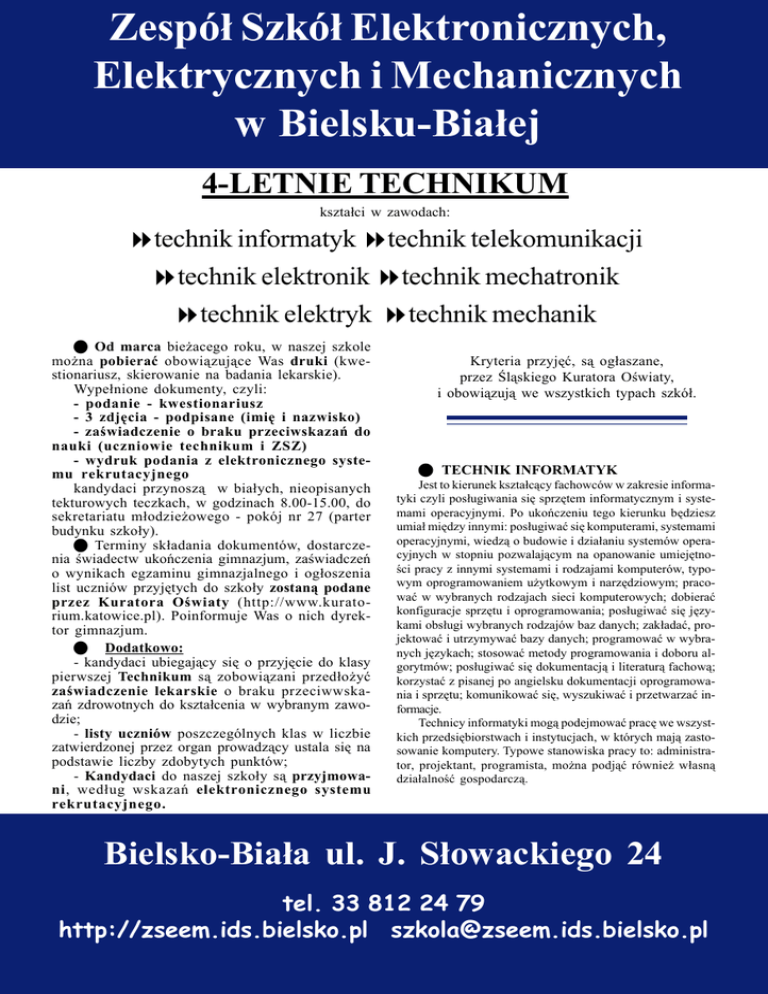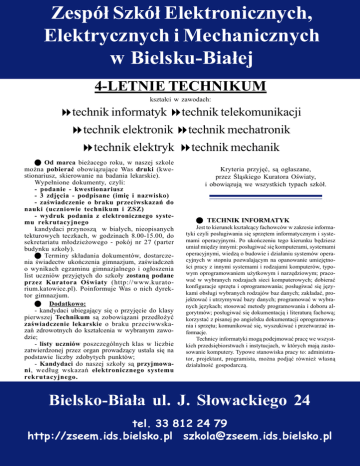 Zespó³ Szkó³ Elektronicznych, Elektrycznych i Mechanicznych w Bielsku-Bia³ej 4-LETNIE TECHNIKUM kszta³ci w zawodach: technik informatyk technik elektronik technik elektryk Od marca bie¿acego roku, w naszej szkole mo¿na pobieraæ obowi¹zuj¹ce Was druki (kwestionariusz, skierowanie na badania lekarskie). Wype³nione dokumenty, czyli: - podanie - kwestionariusz - 3 zdjêcia - podpisane (imiê i nazwisko) - zaœwiadczenie o braku przeciwskazañ do nauki (uczniowie technikum i ZSZ) - wydruk podania z elektronicznego systemu rekrutacyjnego kandydaci przynosz¹ w bia³ych, nieopisanych tekturowych teczkach, w godzinach 8.00-15.00, do sekretariatu m³odzie¿owego - pokój nr 27 (parter budynku szko³y). Terminy sk³adania dokumentów, dostarczenia œwiadectw ukoñczenia gimnazjum, zaœwiadczeñ o wynikach egzaminu gimnazjalnego i og³oszenia list uczniów przyjêtych do szko³y zostan¹ podane przez Kuratora Oœwiaty (http://www.kuratorium.katowice.pl). Poinformuje Was o nich dyrektor gimnazjum. Dodatkowo: - kandydaci ubiegaj¹cy siê o przyjêcie do klasy pierwszej Technikum s¹ zobowi¹zani przed³o¿yæ zaœwiadczenie lekarskie o braku przeciwwskazañ zdrowotnych do kszta³cenia w wybranym zawodzie; - listy uczniów poszczególnych klas w liczbie zatwierdzonej przez organ prowadz¹cy ustala siê na podstawie liczby zdobytych punktów; - Kandydaci do naszej szko³y s¹ przyjmowani, wed³ug wskazañ elektronicznego systemu rekrutacyjnego. technik telekomunikacji technik mechatronik technik mechanik Kryteria przyjêæ, s¹ og³aszane, przez Œl¹skiego Kuratora Oœwiaty, i obowi¹zuj¹ we wszystkich typach szkó³. TECHNIK INFORMATYK Jest to kierunek kszta³c¹cy fachowców w zakresie informatyki czyli pos³ugiwania siê sprzêtem informatycznym i systemami operacyjnymi. Po ukoñczeniu tego kierunku bêdziesz umia³ miêdzy innymi: pos³ugiwaæ siê komputerami, systemami operacyjnymi, wiedz¹ o budowie i dzia³aniu systemów operacyjnych w stopniu pozwalaj¹cym na opanowanie umiejêtnoœci pracy z innymi systemami i rodzajami komputerów, typowym oprogramowaniem u¿ytkowym i narzêdziowym; pracowaæ w wybranych rodzajach sieci komputerowych; dobieraæ konfiguracje sprzêtu i oprogramowania; pos³ugiwaæ siê jêzykami obs³ugi wybranych rodzajów baz danych; zak³adaæ, projektowaæ i utrzymywaæ bazy danych; programowaæ w wybranych jêzykach; stosowaæ metody programowania i doboru algorytmów; pos³ugiwaæ siê dokumentacj¹ i literatur¹ fachow¹; korzystaæ z pisanej po angielsku dokumentacji oprogramowania i sprzêtu; komunikowaæ siê, wyszukiwaæ i przetwarzaæ informacje. Technicy informatyki mog¹ podejmowaæ pracê we wszystkich przedsiêbiorstwach i instytucjach, w których maj¹ zastosowanie komputery. Typowe stanowiska pracy to: administrator, projektant, programista, mo¿na podj¹æ równie¿ w³asn¹ dzia³alnoœæ gospodarcz¹. Bielsko-Bia³a ul. J. S³owackiego 24 tel. 33 812 24 79 http://zseem.ids.bielsko.pl [email protected] Wybieraj¹c technikum, bêdziesz uczy³ siê przedmiotów ogólnokszta³c¹cych oraz przedmiotów zawodowych. Nauka trwa cztery lata, koñczy siê matur¹ i egzaminem zawodowym, po zdaniu którego uzyskasz tytu³ i dyplom technika w wybranym przez Ciebie zawodzie. cyjnej, eksploatacji urz¹dzeñ koñcowych, eksploatacji urz¹dzeñ i sieci komputerowych, systemów pomiarowych, administratora sysJest to kierunek kszta³c¹cy fachowców w zakresie elektroniki temów komutacyjnych, dyspozytora sieci telekomunikacyjnej, asyprzemys³owej i u¿ytkowej. Po ukoñczeniu tego kierunku bêdziesz stenta projektów w biurach projektowych i konstrukcyjnych itp. umia³ miêdzy innymi: zaprojektowaæ proste uk³ady elektroniczne i obwody drukowane; zestroiæ i wyregulowaæ uk³ady elektroniczne; TECHNIK MECHANIK obs³u¿yæ aparaturê pomiarow¹; zmontowaæ uruchomiæ i przetestoJest to kierunek kszta³c¹cy fachowców w zakresie podstaw mewaæ uk³ady i urz¹dzenia elektroniczne, naprawiæ urz¹dzenia i uk³a- chaniki po³¹czonej z elektronik¹ i automatyk¹. Po ukoñczeniu tego dy elektroniczne; napisaæ proste programy w jednym z jêzyków pro- kierunku bêdziesz umia³ miêdzy innymi: konstruowaæ proste obiekgramowania; obs³ugiwaæ komputer typu PC; itp. Szko³a posiada no- ty mechaniczne; pos³ugiwaæ siê narzêdziami i oprzyrz¹dowaniem woczesne pracownie do realizacji tego programu. Absolwenci mog¹ technologicznym; oceniaæ stan techniczny obiektów mechanicznych znaleŸæ zatrudnienie w charakterze technika w zak³adach przemys³o- i dokonywaæ napraw urz¹dzeñ mechanicznych i silników spalinowych, w których s¹ produkowane lub stosowane urz¹dzenia elek- wych; pos³ugiwaæ siê dokumentacj¹ techniczn¹, korzystaæ z oprotroniczne; w placówkach badawczo-rozwojowych; w pracowniach gramowania komputerowego; obs³ugiwaæ komputer typu PC. Abprojektowania urz¹dzeñ elektronicznych; w warsztatach napraw- solwenci mog¹ znaleŸæ zatrudnienie g³ównie na stanowiskach nadczych urz¹dzeñ elektronicznych, serwisach komputerowych itp. zoru technicznego niemal we wszystkich dzia³ach gospodarki jako: organizatorzy i nadzór przebiegu procesów wytwarzania maszyn i urz¹dzeñ; w stacjach obs³ugi pojazdów samochodowych; w zak³aTECHNIK ELEKTRYK Jest to kierunek kszta³c¹cy ca³oœciowo fachowców dziedzin elek- dach produkuj¹cych samochody; jako kontrolerzy jakoœci maszyn i trycznych. Po ukoñczeniu tego kierunku bêdziesz umia³ miêdzy in- us³ug, instalatorzy i wprowadzaj¹cy do eksploatacji maszyny i urz¹nymi: zaprojektowaæ proste uk³ady elektryczne; wykonaæ instala- dzenia mechaniczne, dozoruj¹cy pracê maszyn i urz¹dzeñ, konserwacje elektryczne i elektroniczne; zainstalowaæ i obs³u¿yæ maszyny i torzy maszyn i urz¹dzeñ itp. urz¹dzenia elektryczne oraz uk³ady energoelektroniczne; dokonywaæ napraw urz¹dzeñ zasilanych pr¹dem; pos³u¿yæ siê komputeroTECHNIK MECHATRONIK wym oprogramowaniem niezbêdnym do wykonywania pracy; obJ