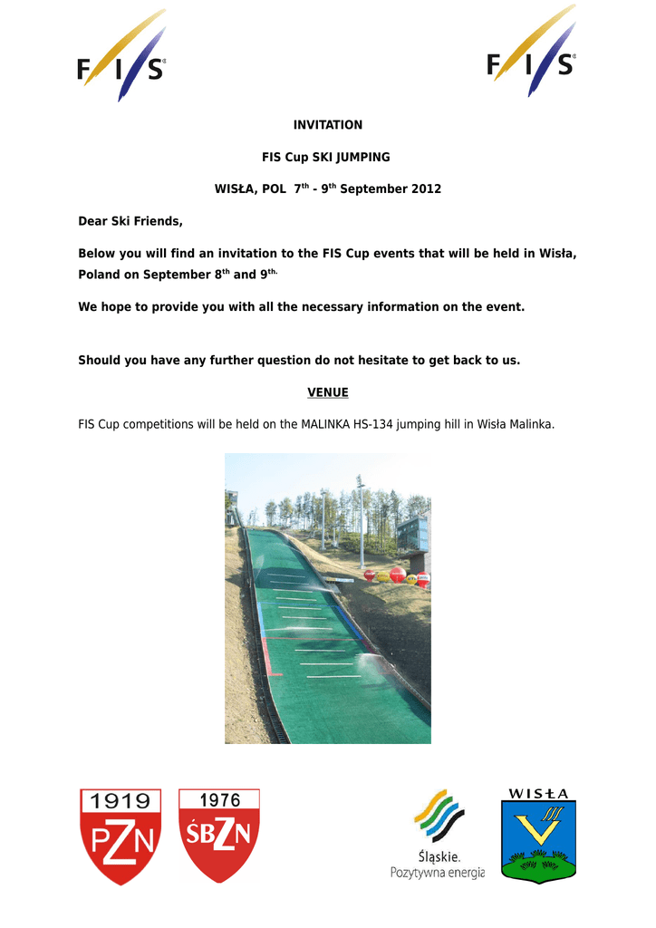 INVITATION FIS Cup SKI JUMPING WISŁA, POL 7th - 9th September 2012 Dear Ski Friends, Below you will find an invitation to the FIS Cup events that will be held in Wisła, Poland on September 8th and 9th. We hope to provide you with all the necessary information on the event. Should you have any further question do not hesitate to get back to us. VENUE FIS Cup competitions will be held on the MALINKA HS-134 jumping hill in Wisła Malinka. ORGANISING COMMITTEE Śląsko-Beskidzki Związek Narciarski ul. Wyzwolenia 67 Wisła, Poland contact person: Aga Baczkowska mobile +48 606 65 41 14 fax +48 18 20 141 29 E-mail: [email protected] Race Office GEOVITA Hotel os. Bajcary 14, Wisła TCM meeting room GEOVITA Hotel os. Bajcary 14, Wisła DEADLINES Entries by numbers: August, 29th Entries by names: September, 5th Organising Committee OC President Andrzej Wąsowicz OC Treasurer Grzegorz Ziółkowski Chief of Race Office Aga Baczkowska Chief of hill Jerzy Poloczek Chief of fore-jumpers Jan Szturc Chief of Distance Measurers Jerzy Pilch Competition Management Chief of Competition Piotr Kruczek Race Secretary Faustyna Malik FIS OFFICIALS FIS Cup Coordinator Ueli Forrer FIS TD Renata Nadarkiewicz POL TD Assistant Nikolay Korobov KAZ Jumping Judges Długopolski Kazimierz POL Pilch Jerzy POL Galica Andrzej POL Siderek Marek POL Bafia Kazimierz POL ACCOMMODATION The FIS Cup Ski Jumping Wisła 2012 Organizing Committee takes care of the full board accommodation for the athletes and officials, thus all the bookings and accommodation request shall be sent directly to the LOC of Wisła address. The bookings for national teams are organized by the OC according to the teams' requests and sent entries. The official hotels are − GEOVITA Hotel in Wisła Bajcary 14 (www.geovita.pl/obiekt/Wisla.6.html) − START Hotel in Olimpijska 1 in Wisla (www.osstart.com.pl) The price for the daily full board accommodation is − 35 Euro per person FB (START hotel) − 40 Euro per person FB (GEOVITA hotel) Cash and credit cards are accepted. Please contact Aga Baczkowska for further offers and quotations. If there are any NSF who had made their own accommodation arrangements, these are obliged to inform the LOC about the fact not later than August, 29th The LOC does not guarantee the availability of accommodation for requests and entries sent later than August, 29th However, if there are vacant rooms left at the OC's disposal these will be provided to teams on request. TRANSFERS Airport pick-ups will be provided on the teams’ requests. All team cars will get special parking labels to park in the reserved areas. ARRIVALS By plane: Warszawa (380 km) Katowice (90 km) Kraków (160 km) Ostrava (CZE) (70 km) By train: WISŁA By car: PL / SVK or CZE boarder Ujsoły (SVK) 45 km Korbielów (SVK) 60 km Cieszyn (CZE) 25 km Zwardoń (SVK) 30 km Istebna (SVK) 15 km All the airport pick-ups will be provided by the LOC provided that they are requested for in advance. COMPETITION PROGRAMME 6th September, Thursday teams' arrival / przyjazd ekip 7th September, Friday 10.00 team captains' meeting / odprawa techniczna 12.00 official training – 2 rounds / oficjalny trening – 2 serie 8th September, Saturday 11.00 trial round / seria próbna 12.00 1st competition round / 1-sza seria konkursowa seria finałowa / final round prize-giving ceremony / rozdanie nagród 9th September, Sunday 9.00 trial round / seria próbna 10.00 1st competition round / 1-sza seria konkursowa seria finałowa / final round prize-giving ceremony / rozdanie nagród 10th September, Monday teams' departure / wyjazd ekip SKI WAXING and SERVICE AREA There will be limited ski-waxing rooms available at the hotels. Ski wax cabins will be located at the Malinka HS-134 hills. DOPING CONTROL According to FIS standards and rules. FIS LICENCE To be eligible for participation in the FIS Cup all jumpers must possess a valid FIS Code. INSURANCE All athletes need the insurance arranged by their National Ski Associations. The Organizing Committee is not responsible for any injuries of the athletes neither for the damage or lost property. LANGUAGE The official language is English. ADDITIONAL PROGRAMME Ceremonies according to official programme and FIS guidelines. PRESS CENTER Accreditation requests for journalists and media representatives can be sent to [email protected] VISA INFORMATION This invitation should be enough to get visas. In case you will need assistance with getting these, do not hesitate to contact us.