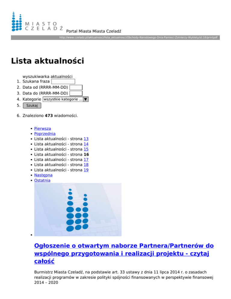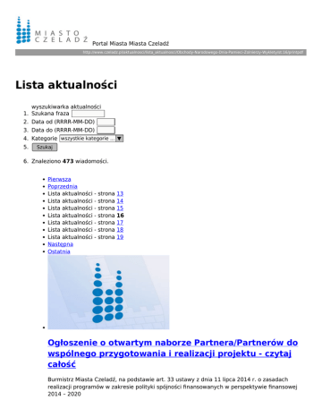 Portal Miasta Miasta Czeladź http://www.czeladz.pl/aktualnosci/lista_aktualnosci/Obchody-Narodowego-Dnia-Pamieci-Zolnierzy-Wyklety/st:16/printpdf Lista aktualności wyszukiwarka aktualności 1. Szukana fraza 2. Data od (RRRR-MM-DD) 3. Data do (RRRR-MM-DD) 4. Kategorie wszystkie kategorie ... ▼ 5. Szukaj 6. Znaleziono 473 wiadomości. Pierwsza Poprzednia Lista aktualności - strona 13 Lista aktualności - strona 14 Lista aktualności - strona 15 Lista aktualności - strona 16 Lista aktualności - strona 17 Lista aktualności - strona 18 Lista aktualności - strona 19 Następna Ostatnia Ogłoszenie o otwartym naborze Partnera/Partnerów do wspólnego przygotowania i realizacji projektu - czytaj całość Burmistrz Miasta Czeladź, na podstawie art. 33 ustawy z dnia 11 lipca 2014 r. o zasadach realizacji programów w zakresie polityki spójności finansowanych w perspektywie finansowej 2014 – 2020 03 listopada 2016 Ogłoszenie o otwartym naborze Partnera/Partnerów do wspólnego przygotowania i realizacji projektu - czytaj całość Udana kwesta na ratowanie zabytkowych nagrobków czytaj całość 30 października i 1 listopada cmentarzach przy ulicach Nowopogońskiej oraz Wojkowickiej odbyła się publiczna zbiórka pieniężna na rzecz ratowania zabytkowych nagrobków, zorganizowana przez Społeczny Komitet Odnowy Czeladzkich Nagrobków PRO MEMORIA. 03 listopada 2016 Udana kwesta na ratowanie zabytkowych nagrobków - czytaj całość Środki unijne wsparciem dla uczniów o specjalnych potrzebach edukacyjnych - czytaj całość Od sierpnia 2016 r. w Szkole Podstawowej nr 3 im. Janusza Korczaka realizowany jest projekt współfinansowany ze środków Unii Europejskiej w ramach Regionalnego Programu Operacyjnego Województwa Śląskiego na lata 2014-2020 „STYMULACJA ZMYSŁÓW SZANSĄ DLA LEPSZEGO ROZWOJU DZIECKA”. Z tej okazji 25 października 2016 r. odbyła się w naszej szkole uroczysta prezentacja projektu oraz otwarcie Sali Doświadczania Świata. 02 listopada 2016 Środki unijne wsparciem dla uczniów o specjalnych potrzebach edukacyjnych - czytaj całość Ratujmy czeladzkie „Powązki” - czytaj całość W ubiegłym roku, z inicjatywy Towarzystwa Powszechnego „Czeladź”, Czeladzkiej Inicjatywy Samorządowej oraz Muzeum Saturn, po raz pierwszy na cmentarzu parafialnym przy ul. Nowopogońskiej zorganizowana została przez Społeczny Komitet Odnowy Czeladzkich Nagrobków PRO MEMORIA kwesta na rzecz renowacji zniszczonych przez upływający czas i nie mających już 27 października 2016 Ratujmy czeladzkie „Powązki” - czytaj całość I Turniej Grand Prix Czeladzi w Badmintonie 2016/2017 czytaj całość 23 października 2016 r. w hali MOSiR w Czeladzi odbył się pierwszy turniej Grand Prix Czeladzi w badmintonie 2016/2017. W turnieju rywalizowało 76 zawodników w 5 kategoriach wiekowych. 27 października 2016 I Turniej Grand Prix Czeladzi w Badmintonie 2016/2017 - czytaj całość II Jarmark Bożonarodzeniowy w Czeladzi - czytaj całość Zapraszamy wystawców do wzięcia udziału w tegorocznym Jarmarku Bożonarodzeniowym w naszym mieście! 24 października 2016 II Jarmark Bożonarodzeniowy w Czeladzi - czytaj całość Bieg w ciemności - czytaj całość 16 listopada 2016 r. z Parku Kościuszki w Katowicach wystartuje, objęty patronatami: Rotary Club, Niepełnosprawni.pl, Telewizji Polskiej S.A. Oddział w Katowicach, pierwszy w Polsce Bieg w ciemności. 21 października 2016 Bieg w ciemności - czytaj całość Świętowali młodzi filateliści - czytaj całość 30-lecie istnienia oraz 95. urodziny swojego patrona obchodziło wczoraj, 20 października, Młodzieżowe Koło Filatelistyczne im. Czesława Słani działające przy Szkole Podstawowej nr 1. 21 października 2016 Świętowali młodzi filateliści - czytaj całość II Nieograniczony konkurs ofert na najem lokalu do remontu - czytaj całość Burmistrz Miasta Czeladź ogłasza II NIEOGRANICZONY KONKURS OFERT NA NAJEM LOKALU DO REMONTU 21 października 2016 II Nieograniczony konkurs ofert na najem lokalu do remontu - czytaj całość Puchar Śląskiego Kuratora Oświaty dla Czeladzi - czytaj całość W dniu dzisiejszym w Zawierciu odbyła się Wojewódzka Inauguracja Sportowego Roku Szkolnego 2016/17. Podczas tej uroczystości Miejski Zespół Szkół - Szkoła Podstawowa nr 2 nagrodzona została Pucharem Śląskiego Kuratora Oświaty w Katowicach 19 października 2016 Puchar Śląskiego Kuratora Oświaty dla Czeladzi - czytaj całość Pierwsza Poprzednia Lista aktualności - strona 13 Lista aktualności - strona 14 Lista aktualności - strona 15 Lista aktualności - strona 16 Lista aktualności - strona 17 Lista aktualności - strona 18 Lista aktualności - strona 19 Następna Ostatnia