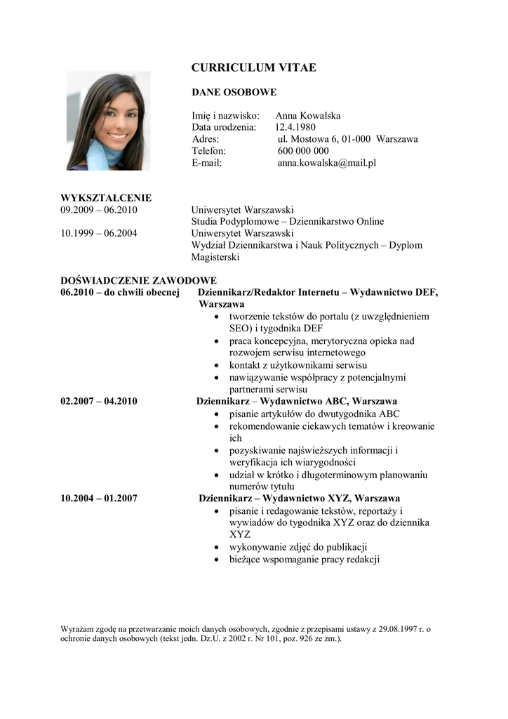 CURRICULUM VITAE DANE OSOBOWE Imię i nazwisko: Data urodzenia: Adres: Telefon: E-mail: WYKSZTAŁCENIE 09.2009 – 06.2010 10.1999 – 06.2004 Anna Kowalska 12.4.1980 ul. Mostowa 6, 01-000 Warszawa 600 000 000 [email protected] Uniwersytet Warszawski Studia Podyplomowe – Dziennikarstwo Online Uniwersytet Warszawski Wydział Dziennikarstwa i Nauk Politycznych – Dyplom Magisterski DOŚWIADCZENIE ZAWODOWE 06.2010 – do chwili obecnej Dziennikarz/Redaktor Internetu – Wydawnictwo DEF, Warszawa tworzenie tekstów do portalu (z uwzględnieniem SEO) i tygodnika DEF praca koncepcyjna, merytoryczna opieka nad rozwojem serwisu internetowego kontakt z użytkownikami serwisu nawiązywanie współpracy z potencjalnymi partnerami serwisu 02.2007 – 04.2010 Dziennikarz – Wydawnictwo ABC, Warszawa pisanie artykułów do dwutygodnika ABC rekomendowanie ciekawych tematów i kreowanie ich pozyskiwanie najświeższych informacji i weryfikacja ich wiarygodności udział w krótko i długoterminowym planowaniu numerów tytułu 10.2004 – 01.2007 Dziennikarz – Wydawnictwo XYZ, Warszawa pisanie i redagowanie tekstów, reportaży i wywiadów do tygodnika XYZ oraz do dziennika XYZ wykonywanie zdjęć do publikacji bieżące wspomaganie pracy redakcji Wyrażam zgodę na przetwarzanie moich danych osobowych, zgodnie z przepisami ustawy z 29.08.1997 r. o ochronie danych osobowych (tekst jedn. Dz.U. z 2002 r. Nr 101, poz. 926 ze zm.). KURSY I SZKOLENIA Szkolenie „Marketing w Internecie” Kurs „Sekret skutecznego pisania” Szkolenie „Wizerunek dziennikarza w Internecie” DODATKOWA DZIAŁALNOŚĆ Prowadzanie autorskiego bloga XYZ ZNAJOMOŚĆ JĘZYKÓW OBCYCH Angielski – poziom zaawansowany Niemiecki – poziom podstawowy UMIEJĘTNOŚCI Obsługa komputera: MS Office (Word, Exel, Power Point) Obsługa programów: Wordpress, Joomla Prawo jazdy kat. B DODATKOWE INFORMACJE Nagroda: Druga nagroda w Ogólnopolskim Konkursie Dziennikarskim (2007 r.) Cechy osobowościowe: elokwencja, odpowiedzialność, komunikatywność, odporność psychiczna, kreatywność Zainteresowania: moda, fitness, film polski Wyrażam zgodę na przetwarzanie moich danych osobowych, zgodnie z przepisami ustawy z 29.08.1997 r. o ochronie danych osobowych (tekst jedn. Dz.U. z 2002 r. Nr 101, poz. 926 ze zm.).
