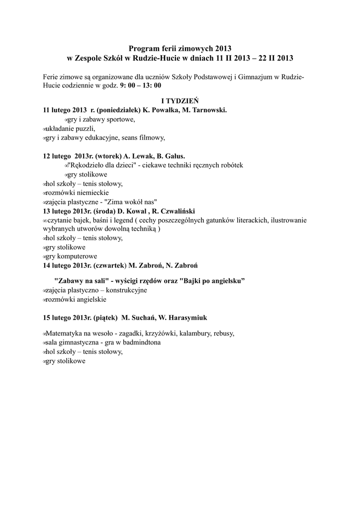Program ferii zimowych 2013 - Gmina Ruda-Huta