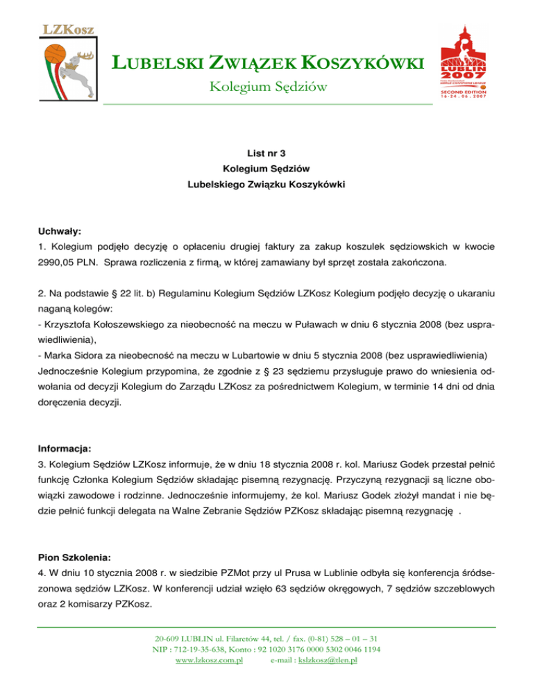 LUBELSKI ZWIĄZEK KOSZYKÓWKI Kolegium Sędziów List nr 3 Kolegium Sędziów Lubelskiego Związku Koszykówki Uchwały: 1. Kolegium podjęło decyzję o opłaceniu drugiej faktury za zakup koszulek sędziowskich w kwocie 2990,05 PLN. Sprawa rozliczenia z firmą, w której zamawiany był sprzęt została zakończona. 2. Na podstawie § 22 lit. b) Regulaminu Kolegium Sędziów LZKosz Kolegium podjęło decyzję o ukaraniu naganą kolegów: - Krzysztofa Kołoszewskiego za nieobecność na meczu w Puławach w dniu 6 stycznia 2008 (bez usprawiedliwienia), - Marka Sidora za nieobecność na meczu w Lubartowie w dniu 5 stycznia 2008 (bez usprawiedliwienia) Jednocześnie Kolegium przypomina, że zgodnie z § 23 sędziemu przysługuje prawo do wniesienia odwołania od decyzji Kolegium do Zarządu LZKosz za pośrednictwem Kolegium, w terminie 14 dni od dnia doręczenia decyzji. Informacja: 3. Kolegium Sędziów LZKosz informuje, że w dniu 18 stycznia 2008 r. kol. Mariusz Godek przestał pełnić funkcję Członka Kolegium Sędziów składając pisemną rezygnację. Przyczyną rezygnacji są liczne obowiązki zawodowe i rodzinne. Jednocześnie informujemy, że kol. Mariusz Godek złożył mandat i nie będzie pełnić funkcji delegata na Walne Zebranie Sędziów PZKosz składając pisemną rezygnację . Pion Szkolenia: 4. W dniu 10 stycznia 2008 r. w siedzibie PZMot przy ul Prusa w Lublinie odbyła się konferencja śródsezonowa sędziów LZKosz. W konferencji udział wzięło 63 sędziów okręgowych, 7 sędziów szczeblowych oraz 2 komisarzy PZKosz. 20-609 LUBLIN ul. Filaretów 44, tel. / fax. (0-81) 528 – 01 – 31 NIP : 712-19-35-638, Konto : 92 1020 3176 0000 5302 0046 1194 www.lzkosz.com.pl e-mail : [email protected] LUBELSKI ZWIĄZEK KOSZYKÓWKI Kolegium Sędziów W części szkoleniowej, która podzielona była na dwa bloki tematyczne: I - mechanika sędziowania, sędzia postępujący, II - faul niesportowy. Szef Pionu Szkolenia kol. Karol Nowak przedstawił najnowsze interpretacje i zwrócił uwagę na najczęściej popełniane przez sędziów błędy. Prezentacja wzbogacona została klipami multimedialnymi, które zostały przygotowane na podstawie meczy sędziowanych przez sędziów w naszym okręgu. Przeprowadzony został test teoretyczny, którego wyniki prezentujemy poniżej: Imię i nazwisko: Ilość błędów 1 Banasiewicz Ireneusz 0 2 Banaszek Hubert 0 3 Baran Janusz 0 4 Baran Robert 0 5 Boryc Marcin 0 6 Bożek Daniel 0 7 Chwedoruk Andrzej 1 8 Denis Urszula 1 9 Fit Krzysztof 0 10 Gajewski Grzegorz 0 11 Jarecki Ryszard 0 12 Jaszczuk Bartosz 1 13 Jaszczuk Piotr 0 14 Klimaszewski Kamil 1 15 Klimaszewski Karol 1 16 Klisowski Andrzej 0 17 Kołoszewski Adam 0 18 Kopel Rafał 1 19 Kosowski Jakub 0 20 Kostyra Krzysztof 0 21 Kostyra Marcin 1 22 Krupa Wojciech 1 23 Krzemiński Dariusz 0 24 Kurman Dariusz 0 25 Lembrych Wojciech 0 26 Leszczuk Michał 0 20-609 LUBLIN ul. Filaretów 44, tel. / fax. (0-81) 528 – 01 – 31 NIP : 712-19-35-638, Konto : 92 1020 3176 0000 5302 0046 1194 www.lzkosz.com.pl e-mail : [email protected] LUBELSKI ZWIĄZEK KOSZYKÓWKI Kolegium Sędziów 27 Lipiec Marcin 1 28 Lis Mateusz 2 29 Mazurek Krzysztof 0 30 Mazurek Paweł 0 31 Mazurewicz Magdalena 0 32 Mierzwiński Ireneusz 0 33 Mikulski Mateusz 0 34 Opolski Marcin 0 35 Pazur Wiesław 0 36 Piwiński Adam 1 37 Plażuk Wojciech 1 38 Półtorak Mariusz 0 39 Prus Adam 1 40 Przepiórka Michał 2 41 Pszczoła Tadeusz 0 42 Ptasiński Grzegorz 1 43 Rojowski Krzysztof 1 44 Rutkowska Anna 1 45 Sadło Luiza 1 46 Sampolska Dorota 1 47 Sawulska Anna 0 48 Sidor Marek 1 49 Solan Łukasz 1 50 Smala Tomasz 0 51 Stalewski Andrzej 0 52 Szajnocha Juliusz 0 53 Szczurewski Tomasz 0 54 Szulakowski Tomasz 0 55 Śliwa Karol 0 56 Warda Piotr 0 57 Wołosz Paweł 1 58 Wzorek Władysław 1 59 Zbroński Mariusz 1 60 Zbroński Zbigniew 0 61 Zygadło Damian 0 20-609 LUBLIN ul. Filaretów 44, tel. / fax. (0-81) 528 – 01 – 31 NIP : 712-19-35-638, Konto : 92 1020 3176 0000 5302 0046 1194 www.lzkosz.com.pl e-mail : [email protected] LUBELSKI ZWIĄZEK KOSZYKÓWKI Kolegium Sędziów Uprawnienia do sędziowania w drugiej części sezonu 2007/2008 otrzymało 72 sędziów: 1. Adameczek Mariusz 2. Aleksandrowicz Robert 3. Banasiewicz Ireneusz 4. Banaszek Hubert 5. Baran Janusz 6. Baran Robert 7. Boryc Marcin 8. Bożek Daniel 9. Brysiewicz Jerzy 10. Chwedoruk Andrzej 11. Denis Urszula 12. Fit Krzysztof 13. Gajewski Grzegorz 14. Godek Mariusz 15. Jarecki Ryszard 16. Jaszczuk Bartosz 17. Jaszczuk Piotr 18. Klimaszewski Kamil 19. Klimaszewski Karol 20. Klisowski Andrzej 21. Kołoszewski Adam 22. Kołoszewski Krzysztof 23. Kopel Rafał 24. Kosowski Jakub 25. Kostyra Krzysztof 26. Kostyra Marcin 27. Krupa Wojciech 28. Krzemiński Dariusz 29. Kurman Dariusz 30. Lembrych Marek 31. Lembrych Wojciech 32. Leszczuk Michał 33. Lipiec Marcin 34. Lis Mateusz 35. Łata Grzegorz 36. Mazurek Krzysztof 37. Mazurek Paweł 20-609 LUBLIN ul. Filaretów 44, tel. / fax. (0-81) 528 – 01 – 31 NIP : 712-19-35-638, Konto : 92 1020 3176 0000 5302 0046 1194 www.lzkosz.com.pl e-mail : [email protected] LUBELSKI ZWIĄZEK KOSZYKÓWKI Kolegium Sędziów 38. Mazurewicz Magdalena 39. Mierzwiński Ireneusz 40. Mikulski Mateusz 41. Nawrocki Mariusz 42. Nieradko Dariusz 43. Nowak Karol 44. Opolski Marcin 45. Pazur Wiesław 46. Piwiński Adam 47. Plażuk Wojciech 48. Półtorak Mariusz 49. Prus Adam 50. Przepiórka Michał 51. Pszczoła Tadeusz 52. Ptasiński Grzegorz 53. Rojowski Krzysztof 54. Rutkowska Anna 55. Sadło Luiza 56. Sampolska Dorota 57. Sawulska Anna 58. Sidor Marek 59. Smala Tomasz 60. Solan Łukasz 61. Stalewski Andrzej 62. Szajnocha Juliusz 63. Szczotka Adrian 64. Szczurewski Tomasz 65. Szulakowski Tomasz 66. Śliwa Karol 67. Warda Piotr 68. Wołosz Paweł 69. Wzorek Władysław 70. Zbroński Mariusz 71. Zbroński Zbigniew 72. Zygadło Damian 20-609 LUBLIN ul. Filaretów 44, tel. / fax. (0-81) 528 – 01 – 31 NIP : 712-19-35-638, Konto : 92 1020 3176 0000 5302 004