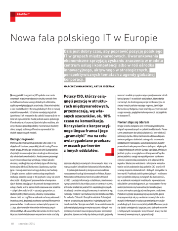 BRANŻA IT USŁUGI Nowa fala polskiego IT w Europie Dziś jest dobry czas, aby poprawić pozycję polskiego IT w grupach międzynarodowych. Uwarunkowania ekonomiczne sprzyjają zyskaniu znaczenia w modelu centrum usług i kompetencji albo w roli ośrodka innowacyjnego, aktywnego w strategicznych, perspektywicznych tematach z agendy globalnej korporacji. MARCIN ZYGMANOWSKI, ARTUR JÓZEFIAK zereg polskich organizacji IT zyskało znaczenie w ramach międzynarodowych struktur swoich firm na fali boomu biznesowego lokalnych oddziałów, szybko powiększających przychody. Obecnie trudniej o taki model kariery. Biznesy globalnych firm w naszej części Europy od ok. 10 lat nie rozwijają się już tak żywiołowo i ich znaczenie dla całości korporacji nie rośnie tak dynamicznie. Nadal jednak awans polskiego IT w strukturach korporacji jest nie tylko możliwy, ale wręcz bardzo prawdopodobny. Scenariusze budowy silnej pozycji polskiego IT można sprowadzić do dwóch zasadniczych modeli. Budując na jakości Pierwsza ścieżka kariery polskiego CIO i jego IT to objęcie roli dostawcy wysokiej jakości usług IT w ramach grupy. Polska po wejściu do Unii Europejskiej chętniej traktowana jest jako atrakcyjna alternatywa dla ofert dalekowschodnich. Podstawowe przewagi naszych centrów usług wynikają z relacji jakości do ceny, atrakcyjniejszej od oferty typu off-shoring. Istotna jest bliskość kulturowa i językowa, wynikająca z naszej obecności w kręgu kultury zachodniej. Z drugiej strony, polskie centra usług wspólnych realizują obecnie usługi w 34 językach. Liczy się także obecność i dostępność pracowników o kompetencjach dobrze pasujących do potrzeb danego centrum usług. Zaletą jest ta sama strefa czasowa oraz stabilna – dzięki obecności w UE – sytuacja gospodarcza. Atutem jest system prawny, zbieżny z prawodawstwem Unii, szczególnie w zakresie ochrony własności intelektualnej. Stale też przybywa wykwalifikowanych pracowników; co roku nasze uniwersytety opuszcza 11 tys. absolwentów kierunków informatycznych i blisko 80 tys. absolwentów kierunków technicznych. W przyszłości dodatkowym wsparciem może stać się 48 czerwiec 2014 Polscy CIO, którzy osiągnęli pozycję w strukturach międzynarodowych, przeznaczają, wg własnych szacunków, ok. 10% czasu na komunikację. Korzystanie z korporacyjnego lingua franca i jego „gramatyki” ma na celu uwiarygadniane przekazu w oczach partnerów z innych oddziałów. szersza adaptacja rozwiązań chmurowych. Nasz kraj ma szansę być ośrodkiem lokowania infrastruktury. O potencjale świadczy tempo wzrostu sektora nowoczesnych usług biznesowych w Polsce. Raport Association of Business Service Leaders Poland z 2013 r. podaje informację o stabilnym, średniorocznym przyroście liczby miejsc pracy w centrach o 20%, a Kraków znalazł się wśród 10. najatrakcyjniejszych lokalizacji centrów usług biznesowych na świecie wg rankingu Tholons Top Outsourcing Destinations 2013. Po Indiach, Chinach i Brazylii to właśnie Polska jest krajem o największej dynamice i największej liczbie takich centrów. Sprzyja nam fakt, że w ostatnim czasie dokonał się też postęp w wykorzystaniu różnych rozproszonych modeli sourcingowych przez korporacje globalne. Upowszechniły się dobre praktyki, pojawiły wzorce i modele przyspieszające przejmowanie takich funkcji przez IT w polskich oddziałach. Warto także zaznaczyć, że dostrzegana presja konkurencyjna ze strony innych państw naszego regionu, takich jak Rumunia czy Bułgaria, może stać się zaczynem do dalszego rozwoju, pogłębiania kompetencji, szczególnie w obszarze IT. Pionier staje się liderem Druga ścieżka związana jest z innowacyjnością rozwiązań wprowadzanych w polskich oddziałach. Pierwszym pretekstem do takiej działalności jest wielkość polskiego rynku, który rozmiarami odpowiada parametrom poligonu doświadczalnego dla testowania pilotażowych rozwiązań, usług i produktów. Koszty prowadzenia eksperymentów na jednym z większych i nadal młodszych rynków Europy są niższe. Mniejsze jest też ryzyko, ze względu na niższą wartość rynku. Jednocześnie z uwagi na wysoki poziom konkurencyjności poprzeczka postawiona jest odpowiednio wysoko. Skuteczne wdrożenia i efektywne wnioskowanie na ich podstawie dają polskim CIO oraz ich IT szansę eksportu doświadczeń i dobrych pomysłów na inne rynki. Przykłady takich potencjalnych i realizowanych projektów dotyczą rozwiązań dla bankowości, np. w zakresie rozwiązań mobilnych, wprowadzania oddziałów samoobsługowych, po nowoczesne formy uwierzytelnienia czy komunikacji marketingowej skutecznie wykorzystującej media społecznościowe. Podobne sygnały pojawiają się w przemyśle, gdzie eksperymentuje się np. w obszarze związków automatyki i informatyki w celu usprawnienia procesów produkcyjnych. Jeszcze częściej polskie IT emancypuje się dzięki umiejętności zapożyczania dobrych wzorów i efektywnych rozwiązań z innych branż, a więc na fali innowacji wewnętrznych, optymalizacji. Obie ścieżki mają wspólne elementy, grupę czynników i uwarunkowań, które podnoszą prawdopodobieństwo wzrostu znaczenia w grupie. Wyposażanie zespołów IT w odpowiednie cechy, umożliwianie zdobycia konkretnych kompetencji i umiejętności, profilowanie adekwatnego modelu menedżerów w dziale i samego CIO mają zasadnicze znaczenie. Memento mori, CIO Najważniejszym dominującym trendem jest coraz szersze wykorzystanie technik cyfrowych w całej gospodarce światowej – każdy biznes staje się biznesem cyfrowym. Kolejne raporty Accenture z cyklu Technology Vision potwierdzają i uszczegóławiają tę prognozę. Coraz wyraźniej widać też, że zawiera ona w sobie także zapowiedź zmiany roli IT i CIO. Przygotowując się do międzynarodowej kariery, należy mieć to na względzie. Obok funkcji CIO pojawiły się nowe role, dostosowane do cyfrowego biznesu. Najleps