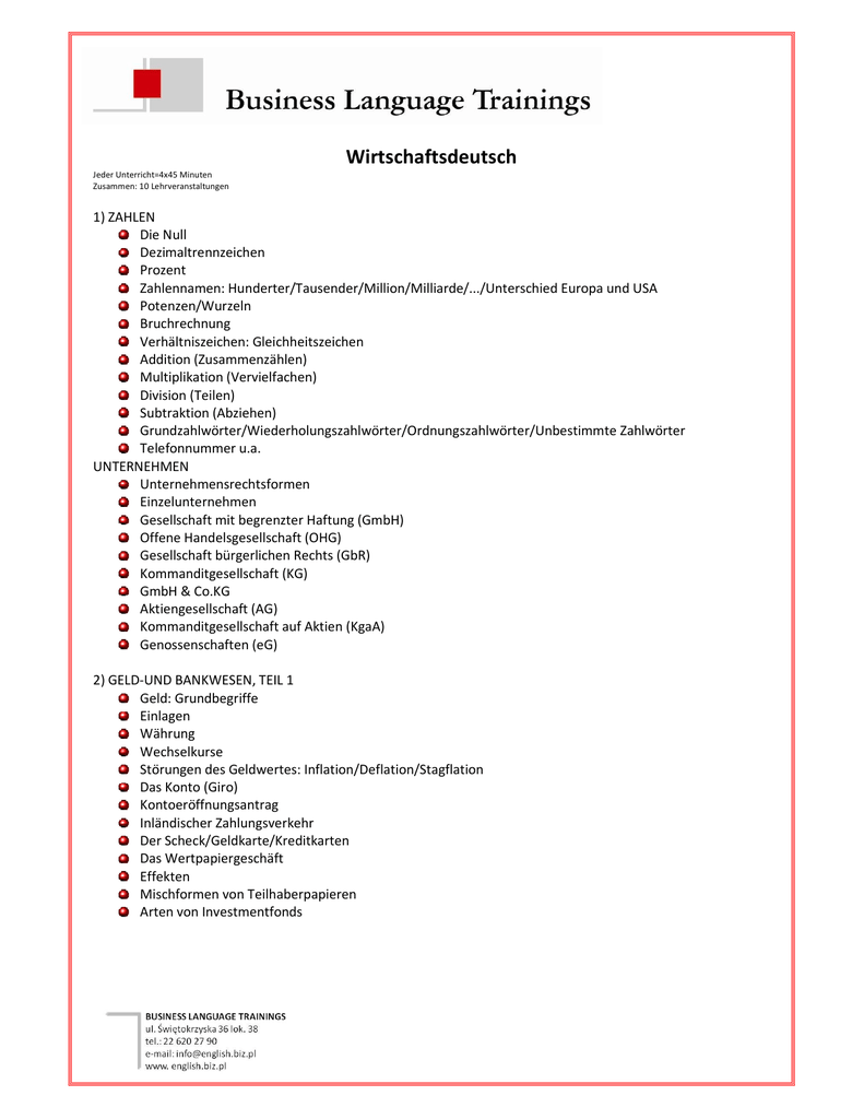 Wirtschaftsdeutsch Jeder Unterricht=4x45 Minuten Zusammen: 10 Lehrveranstaltungen 1) ZAHLEN Die Null Dezimaltrennzeichen Prozent Zahlennamen: Hunderter/Tausender/Million/Milliarde/.../Unterschied Europa und USA Potenzen/Wurzeln Bruchrechnung Verhältniszeichen: Gleichheitszeichen Addition (Zusammenzählen) Multiplikation (Vervielfachen) Division (Teilen) Subtraktion (Abziehen) Grundzahlwörter/Wiederholungszahlwörter/Ordnungszahlwörter/Unbestimmte Zahlwörter Telefonnummer u.a. UNTERNEHMEN Unternehmensrechtsformen Einzelunternehmen Gesellschaft mit begrenzter Haftung (GmbH) Offene Handelsgesellschaft (OHG) Gesellschaft bürgerlichen Rechts (GbR) Kommanditgesellschaft (KG) GmbH & Co.KG Aktiengesellschaft (AG) Kommanditgesellschaft auf Aktien (KgaA) Genossenschaften (eG) 2) GELD-UND BANKWESEN, TEIL 1 Geld: Grundbegriffe Einlagen Währung Wechselkurse Störungen des Geldwertes: Inflation/Deflation/Stagflation Das Konto (Giro) Kontoeröffnungsantrag Inländischer Zahlungsverkehr Der Scheck/Geldkarte/Kreditkarten Das Wertpapiergeschäft Effekten Mischformen von Teilhaberpapieren Arten von Investmentfonds 3) GELD-UND BANKWESEN, TEIL II Termingeschäfte Optionsgeschäft an der DTB Börsen Kreditgeschäft Bausparen Versicherungen Arten von Banken SCHUFA Bankauskunft Dauerauftrag Lastschrift/Gutschrift Kredite/Laufzeiten Geldwäsche Kreditantrag Ablösen/Tilgungsaussetzung/Zinssatze 4) GELD- UND BANKWESEN, TEIL III Finanzierung Innenfinanzierung Außenfinanzierung Spezialfinanzierung Fremdfinanzierung Langfristige Kredite Darlehen Aktien Obligationen Wandelanleihen Optionsanleihen Schuldscheindarlehen Kurzfristige Kredite Lieferantenkredit Kundenkredit Kontokorrentkredit Wechsel Diskontkredit Lombardkredit Rembourskredit Leasing/Factoring 5) FINANZAUSWEISE Die Bilanz – Allgemeines Bilanzarten Aufbau der Bilanz (Aktiv- und Passivseite) Die Gewinn- und Verlustrechnung (GuV oder GVR) Kapitalflussrechnung Anhang (Jahresabschluss) Gewinnvortrag Verlustvortrag EBIT/ EBITDA Rechnungsabgrenzung AGIO/DISAGIO 6) BETRIEBSWIRTSCHAFTLICHE KENNZAHL Arten von Kennzahlen Funktionen von Kennzahlen Entscheidungsfunktion Kontrollfunktion Koordinationsfunktion Verhaltenssteuerungsfunktion Gliederung von Kennzahlen Erfolgskennzahlen Liquiditätskennzahlen Rentabilitätskennzahlen Kennzahlen zur Kapitalstruktur Kennzahlen zur Umschlagshäufigkeit 7) STEUERN Die Grundsätze der Besteuerung Steuergruppen nach volkswirtschaftlicher Anwendung Steuergruppen nach Steuerart Steuergruppen nach Steuergegenstand Praktikabilität der Steuer Steuererhebung Entstehungstatbestand Zweck der Steuererhebung Einkommenssteuer Unternehmensbesteuerung Steueroase Steuerhinterziehung Steuerprogression Umsatzsteuer Verbrauchsteuer 8) MARKETING Vielfalt der Marketing-Definitionen Marketingziele Strategische Marketingziele Operative Marketingziele Duales Führungskonzept Corporate Identity Klassischer Marketing-Mix der American Marketing Association (4 Ps) Marketingsausrichtungen 9) UNTERNEHMENSFUSION/UNTERNEHMENSÜBERNAHME Asset Deal Management Buy-In/ Buy-Out Chief Merging and Acquisitions Officer Corporate Raider Feindliche Übernahme Fremdfinanzierte Übernahme (LBO) Fusion Giftpille (Aktien) Goldener Fallschirm Schwarzer Ritter Weißer Ritter Share Deal Squeeze-Out Reverse Takeover Institutioneller Buy-Out Übernahmerichtlinie 10) WIRTSCHAFTS- UND FINANZKRIMINALITÄT Geldwäsche Schattenwirtschaft Schwarzarbeit Grauer Markt FATF (Geldwäsche) Smurfing Luftbuchung Placement stage Layering stage Integration stage Bestechung Unterschlagung Kreative Buchhaltung
