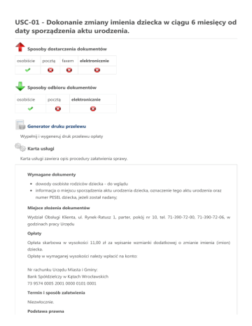 USC‐01 ‐ Dokonanie zmiany imienia dziecka w ciągu 6 miesięcy od daty sporządzenia aktu urodzenia. Sposoby dostarczenia dokumentów osobiście pocztą faxem elektronicznie Sposoby odbioru dokumentów osobiście pocztą elektronicznie Generator druku przelewu Wypełnij i wygeneruj druk przelewu opłaty Karta usługi Karta usługi zawiera opis procedury załatwienia sprawy. Wymagane dokumenty dowody osobiste rodziców dziecka ‐ do wglądu informacja o miejscu sporządzenia aktu urodzenia dziecka, oznaczenie tego aktu urodzenia oraz numer PESEL dziecka, jeżeli został nadany; Miejsce złożenia dokumentów Wydział Obsługi Klienta, ul. Rynek‐Ratusz 1, parter, pokój nr 10, tel. 71‐390‐72‐00, 71‐390‐72‐06, w godzinach pracy Urzędu Opłaty Opłata skarbowa w wysokości 11,00 zł za wpisanie wzmianki dodatkowej o zmianie imienia ﴾imion﴿ dziecka. Opłatę w wymaganej wysokości należy wpłacić na konto: Nr rachunku Urzędu Miasta i Gminy: Bank Spółdzielczy w Kątach Wrocławskich 73 9574 0005 2001 0000 0101 0001 Termin i sposób załatwienia Niezwłocznie. Podstawa prawna ustawa z dnia 28 listopada 2014 r. Prawo o aktach stanu cywilnego ﴾Dz.U.z 2014r., poz.1741﴿, ustawa z dnia 16 listopada 2006 r. o opłacie skarbowej ﴾t.j. Dz. U. z 2014r., poz. 1628 ze zm.﴿. Tryb odwoławczy Nie przysługuje. Dodatkowe informacje, uwagi 1. Rodzice mogą złożyć przed wybranym kierownikiem urzędu stanu cywilnego albo przed konsulem oświadczenie o zmianie imienia lub imion dziecka zamieszczonych w akcie urodzenia w terminie 6 miesięcy od dnia jego sporządzenia. 2. Zmiana imienia może polegać na zastąpieniu wybranego imienia innym imieniem, zastąpieniu dwóch imion jednym imieniem lub odwrotnie, dodaniu drugiego imienia, zmianie pisowni imienia lub imion lub zmianie kolejności imion dziecka. 3. Do oświadczeń o wyborze imienia stosuje się następujące zasady: a﴿ Osoba zgłaszająca urodzenie składa oświadczenie o wyborze nie więcej niż dwóch imion dla dziecka. b﴿ Wybrane imię lub imiona nie mogą być zamieszczone w akcie urodzenia w formie zdrobniałej oraz nie mogą mieć charakteru ośmieszającego lub nieprzyzwoitego. c﴿ Niezależnie od obywatelstwa i narodowości rodziców dziecka wybrane imię lub imiona mogą być imionami obcymi. Można wybrać imię, które nie wskazuje na płeć dziecka, ale w powszechnym znaczeniu jest przypisane do danej płci. d﴿ Kierownik urzędu stanu cywilnego odmawia przyjęcia oświadczenia o wyborze imienia lub imion dziecka, jeżeli wybrane imię lub imiona są w formie zdrobniałej lub mają charakter ośmieszający lub nieprzyzwoity lub nie wskazują na płeć dziecka, kierując się powszechnym znaczeniem imienia, i wybiera dziecku imię z urzędu, w formie decyzji administracyjnej podlegającej natychmiastowemu wykonaniu, z adnotacją zamieszczoną w akcie urodzenia o wyborze imienia z urzędu. Kierownik urzędu stanu cywilnego odmawia przyjęcia oświadczenia, jeżeli nie został zachowany termin do jego złożenia. 4. Oświadczenie o zmianie imienia lub imion dokumentuje się w formie protokołu, który podpisują rodzice dziecka i kierownik urzędu stanu cywilnego albo konsul. 5. Kierownik urzędu stanu cywilnego, który przyjął oświadczenie rodziców dziecka o zmianie imienia lub imion dziecka zamieszczonych w akcie urodzenia, przesyła protokół kierownikowi urzędu stanu cywilnego właściwemu do sporządzenia aktu urodzenia, w terminie jednego dnia roboczego od dnia sporządzenia tego protokołu, w celu dołączenia do aktu urodzenia wzmianki dodatkowej o zmianie imienia lub imion dziecka. 6. Konsul, który przyjął oświadczenie rodziców dziecka o zmianie imienia lub imion dziecka zamieszczonych w akcie urodzenia, przesyła niezwłocznie protokół kierownikowi urzędu stanu cywilnego właściwemu do sporządzenia aktu urodzenia w celu dołączenia do aktu urodzenia wzmianki dodatkowej o zmianie imienia lub imion dziecka. Rejestr zmian: Osoba aktualizująca kartę: Katarzyna Gidzińska Data ostatniej aktualizacji: 2015.03.09