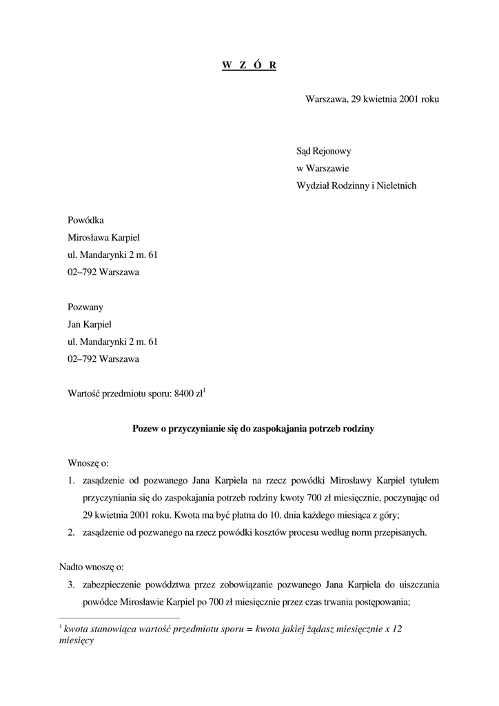 W Z Ó R Warszawa, 29 kwietnia 2001 roku Sąd Rejonowy w Warszawie Wydział Rodzinny i Nieletnich Powódka Mirosława Karpiel ul. Mandarynki 2 m. 61 02–792 Warszawa Pozwany Jan Karpiel ul. Mandarynki 2 m. 61 02–792 Warszawa Wartość przedmiotu sporu: 8400 zł1 Pozew o przyczynianie się do zaspokajania potrzeb rodziny Wnoszę o: 1. zasądzenie od pozwanego Jana Karpiela na rzecz powódki Mirosławy Karpiel tytułem przyczyniania się do zaspokajania potrzeb rodziny kwoty 700 zł miesięcznie, poczynając od 29 kwietnia 2001 roku. Kwota ma być płatna do 10. dnia każdego miesiąca z góry; 2. zasądzenie od pozwanego na rzecz powódki kosztów procesu według norm przepisanych. Nadto wnoszę o: 3. zabezpieczenie powództwa przez zobowiązanie pozwanego Jana Karpiela do uiszczania powódce Mirosławie Karpiel po 700 zł miesięcznie przez czas trwania postępowania; 1 kwota stanowiąca wartość przedmiotu sporu = kwota jakiej żądasz miesięcznie x 12 miesięcy 4. wezwanie na rozprawę oraz przesłuchanie świadka: Katarzyny Karpiel, zam. przy ul. Kasprzyckiej 5 m. 7 w Warszawie. Uzasadnienie Strony zawarły małżeństwo 12 października 1995 roku. Dowód: odpis skrócony aktu małżeństwa stron. Z małżeństwa tego w dniu 13 listopada 1996 roku w Warszawie urodziła się córka, Anna Karpiel. Dowód: odpis skrócony aktu urodzenia Anny Karpiel. Powódka pracuje w sklepie spożywczym przy ulicy Lazurowej 6 w Warszawie. Zarabia 1000 zł brutto miesięcznie. Nie ma innych dochodów. Z uwagi na konieczność sprawowania opieki nad córką nie może podjąć dodatkowej pracy. Dowód: zaświadczenie o zarobkach za okres 3 miesięcy. Pozwany jest z zawodu księgowym. Pracuje w prywatnej firmie, gdzie zarabia 2500 zł brutto. Ponadto jest właścicielem domu jednorodzinnego przy ul. Walcowej w Łodzi, który wynajmuje osiągając z tego tytułu dodatkowy dochód wysokości 1500 zł. Dowód: kserokopia umowy najmu domu jednorodzinnego. Od dwóch lat pozwany nadużywa alkoholu, nie przyczynia się do zaspokajania potrzeb rodziny i cały swój dochód przeznacza na swoje potrzeby. Powódka musi z własnych pieniędzy opłacać wszystkie rachunki, łożyć na utrzymanie dziecka. Dowód: zeznania świadka Katarzyny Karpiel , kserokopie rachunków Miesięcznie powódka na utrzymanie domu przeznacza: (opisać wydatki). Dowód: kserokopie rachunków (opłaty stałe, rachunki za wodę i gaz, telefon, telewizję kablową, potwierdzenie opłacenia lekcji angielskiego dziecka, inne dotyczące jego utrzymania i wychowania itp.). przesłuchanie stron Wobec takiego stanu rzeczy żądanie powódki jest uzasadnione. Zasadny jest też wniosek o zabezpieczenie powództwa. Mirosława Karpiel Załączniki: 1. odpis skrócony aktu małżeństwa stron 2. odpis skrócony aktu urodzenia 3. zaświadczenie o zarobkach powódki za okres 3 miesięcy 4. kserokopia umowy najmu domu jednorodzinnego 5. kserokopie rachunków 6. odpis pozwu i załączników.