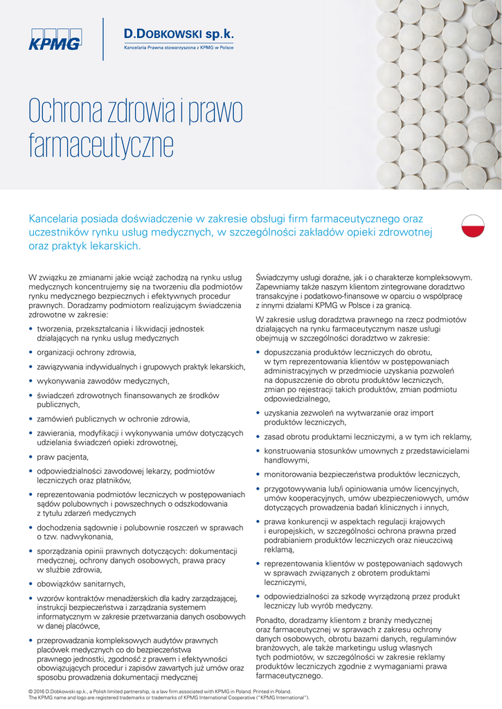 Ochrona zdrowia i prawo farmaceutyczne Kancelaria posiada doświadczenie w zakresie obsługi firm farmaceutycznego oraz uczestników rynku usług medycznych, w szczególności zakładów opieki zdrowotnej oraz praktyk lekarskich. W związku ze zmianami jakie wciąż zachodzą na rynku usług medycznych koncentrujemy się na tworzeniu dla podmiotów rynku medycznego bezpiecznych i efektywnych procedur prawnych. Doradzamy podmiotom realizującym świadczenia zdrowotne w zakresie: • tworzenia, przekształcania i likwidacji jednostek działających na rynku usług medycznych • organizacji ochrony zdrowia, • zawiązywania indywidualnych i grupowych praktyk lekarskich, • wykonywania zawodów medycznych, • świadczeń zdrowotnych finansowanych ze środków publicznych, Świadczymy usługi doraźne, jak i o charakterze kompleksowym. Zapewniamy także naszym klientom zintegrowane doradztwo transakcyjne i podatkowo-finansowe w oparciu o współpracę z innymi działami KPMG w Polsce i za granicą. W zakresie usług doradztwa prawnego na rzecz podmiotów działających na rynku farmaceutycznym nasze usługi obejmują w szczególności doradztwo w zakresie: • dopuszczania produktów leczniczych do obrotu, w tym reprezentowania klientów w postępowaniach administracyjnych w przedmiocie uzyskania pozwoleń na dopuszczenie do obrotu produktów leczniczych, zmian po rejestracji takich produktów, zmian podmiotu odpowiedzialnego, • zamówień publicznych w ochronie zdrowia, • uzyskania zezwoleń na wytwarzanie oraz import produktów leczniczych, • zawierania, modyfikacji i wykonywania umów dotyczących udzielania świadczeń opieki zdrowotnej, • zasad obrotu produktami leczniczymi, a w tym ich reklamy, • praw pacjenta, • konstruowania stosunków umownych z przedstawicielami handlowymi, • odpowiedzialności zawodowej lekarzy, podmiotów leczniczych oraz płatników, • monitorowania bezpieczeństwa produktów leczniczych, • reprezentowania podmiotów leczniczych w postępowaniach sądów polubownych i powszechnych o odszkodowania z tytułu zdarzeń medycznych • dochodzenia sądownie i polubownie roszczeń w sprawach o tzw. nadwykonania, • sporządzania opinii prawnych dotyczących: dokumentacji medycznej, ochrony danych osobowych, prawa pracy w służbie zdrowia, • obowiązków sanitarnych, • wzorów kontraktów menadżerskich dla kadry zarządzającej, instrukcji bezpieczeństwa i zarządzania systemem informatycznym w zakresie przetwarzania danych osobowych w danej placówce, • przeprowadzania kompleksowych audytów prawnych placówek medycznych co do bezpieczeństwa prawnego jednostki, zgodność z prawem i efektywności obowiązujących procedur i zapisów zawartych już umów oraz sposobu prowadzenia dokumentacji medycznej • przygotowywania lub/i opiniowania umów licencyjnych, umów kooperacyjnych, umów ubezpieczeniowych, umów dotyczących prowadzenia badań klinicznych i innych, • prawa konkurencji w aspektach regulacji krajowych i europejskich, w szczególności ochrona prawna przed podrabianiem produktów leczniczych oraz nieuczciwą reklamą, • reprezentowania klientów w postępowaniach sądowych w sprawach związanych z obrotem produktami leczniczymi, • odpowiedzialności za szkodę wyrządzoną przez produkt leczniczy lub wyrób medyczny. Ponadto, doradzamy klientom z branży medycznej oraz farmaceutycznej w sprawach z zakresu ochrony danych osobowych, obrotu bazami danych, regulaminów branżowych, ale także marketingu usług własnych tych podmiotów, w szczególności w zakresie reklamy produktów leczniczych zgodnie z wymaganiami prawa farmaceutycznego. © 2016 D.Dobkowski sp.k., a Polish limited partnership, is a law firm associated with KPMG in Poland. Printed in Poland. The KPMG name and logo are registered trademarks or trademarks of KPMG International Cooperative (“KPMG International”). Pharmaceuticals and Healthcare The Law Firm provides services to pharmaceutical companies and medical market entities, in particular healthcare centres and medical practices. In view of continuous changes in the medical services sector, we focus on providing medical market entities with safe and effective legal solutions. Legal advisory services that we render to entities providing health benefits comprise in particular: We render legal assistance dedicated to certain situations and complex legal advice. Our Law Firm provides our clients with integrated transactional, tax and finance services based on cooperation with other KPMG departments in Poland and worldwide. • creating, transforming and liquidating entities of the medical services market, Legal advisory services that we render to pharmaceutical market entities refer in particular to: • healthcare management, • marketing authorisations for medicinal products, including client representation in administrative proceedings for obtaining marketing authorisations, introducing amendments after the product registration and in the event of change of the marketing authorization holder, • establishing sole and group medical practices, • practising medical professions, • health benefits financed out of public funds, • public procurements in healthcare sector, • obtaining permits for manufacturing and import of medicinal products, • concluding, amending and performing agreements for granting health benefits, • principles of trading in and advertising medicinal products, • patients’ rights, • constructing contractual relationships with commercial representatives, • professional liability of medical doctors, healthcare entities and payers, • monitoring medicinal products safety, • representing healthcare entities before courts of conciliation and common courts in proceedings for medical compensation, • drafting and/or giving opinion on licence agreements, cooperation contracts, insurance agreements, clinical study site agreements and other, • seeking claims in court an