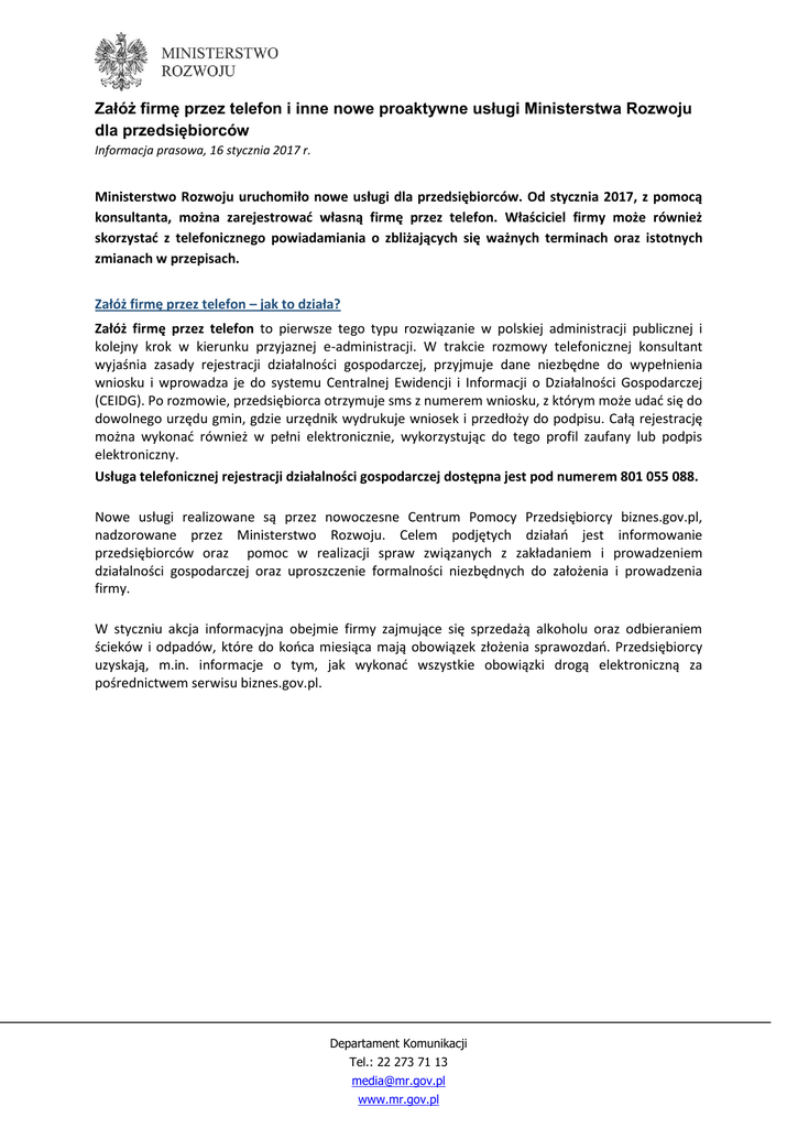 Załóż firmę przez telefon i inne nowe proaktywne usługi Ministerstwa Rozwoju dla przedsiębiorców Informacja prasowa, 16 stycznia 2017 r. Ministerstwo Rozwoju uruchomiło nowe usługi dla przedsiębiorców. Od stycznia 2017, z pomocą konsultanta, można zarejestrować własną firmę przez telefon. Właściciel firmy może również skorzystać z telefonicznego powiadamiania o zbliżających się ważnych terminach oraz istotnych zmianach w przepisach. Załóż firmę przez telefon – jak to działa? Załóż firmę przez telefon to pierwsze tego typu rozwiązanie w polskiej administracji publicznej i kolejny krok w kierunku przyjaznej e-administracji. W trakcie rozmowy telefonicznej konsultant wyjaśnia zasady rejestracji działalności gospodarczej, przyjmuje dane niezbędne do wypełnienia wniosku i wprowadza je do systemu Centralnej Ewidencji i Informacji o Działalności Gospodarczej (CEIDG). Po rozmowie, przedsiębiorca otrzymuje sms z numerem wniosku, z którym może udać się do dowolnego urzędu gmin, gdzie urzędnik wydrukuje wniosek i przedłoży do podpisu. Całą rejestrację można wykonać również w pełni elektronicznie, wykorzystując do tego profil zaufany lub podpis elektroniczny. Usługa telefonicznej rejestracji działalności gospodarczej dostępna jest pod numerem 801 055 088. Nowe usługi realizowane są przez nowoczesne Centrum Pomocy Przedsiębiorcy biznes.gov.pl, nadzorowane przez Ministerstwo Rozwoju. Celem podjętych działań jest informowanie przedsiębiorców oraz pomoc w realizacji spraw związanych z zakładaniem i prowadzeniem działalności gospodarczej oraz uproszczenie formalności niezbędnych do założenia i prowadzenia firmy. W styczniu akcja informacyjna obejmie firmy zajmujące się sprzedażą alkoholu oraz odbieraniem ścieków i odpadów, które do końca miesiąca mają obowiązek złożenia sprawozdań. Przedsiębiorcy uzyskają, m.in. informacje o tym, jak wykonać wszystkie obowiązki drogą elektroniczną za pośrednictwem serwisu biznes.gov.pl. Departament Komunikacji Tel.: 22 273 71 13 [email protected] www.mr.gov.pl