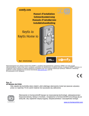 Nieprzestrzeganie tych zaleceń zwalnia firmę SOMFY z wszelkiej odpowiedzialności i gwarancji. SOMFY nie może przyjąć odpowiedzialności z tytułu zmian norm i przepisów zaistniałych po opublikowaniu niniejszej instrukcji. Niniejszym SOMFY deklaruje, że urządzenie (Telis Composio io) spełnia zasadnicze wymagania oraz inne związane dyspozycje dyrektywy 1999/5/CE. Deklaracja zgodności została udostępniona na stronie internetowej www.somfy.com, pole CE. Do stosowania w UE, Szwajcarii. Rys. O WYMIANA BATERII Gdy zapala się kontrolka stanu baterii, pilot zdalnego sterowania może być jeszcze używany przez co najmniej 15 dni zanim bateria nie wyczerpie się całkowicie. Sterowanie io-homecontrol® bazuje na nowoczesnej technologii, zabezpieczonej i bezprzewodowej, łatwej w montażu. Urządzenia io-homecontrol® komunikują się ze sobą tak, aby zapewnić więcej wygody, bezpieczeństwa i oszczędności energii. www.io-homecontrol.com 1 2 3 4 Klawisze sterujące Klawisz STOP ogólny Klawisz ZAMYKANIE ogólne Kontrolka działania 5 6 7 8 Kontrolka wyczerpania baterii Zatrzask Przycisk PROG: programowanie pilota Przycisk KEY: zapamiętywanie klucza systemowego A WKŁADANIE BATERII B PROGRAMOWANIE I ZAPAMIĘTYWANIE KLUCZA SYSTEMOWEGO Czy w systemie istnieje już pilot zdalnego sterowania io-homecontrol? OUI – przejść do etapu C: Zapamiętywanie klucza systemowego. NON - przejść do etapu D lub E: Programowanie pilota zdalnego sterowania. C ZAPAMIĘTYWANIE KLUCZA SYSTEMOWEGO [1]. Istniejący pilot zdalnego sterowania: Keytis, Telis, Impresario, Composio: Naciskać (2 s) przycisk “KEY”. - Inne: patrz instrukcja obsługi danego pilota. [2]. Nacisnąć krótko przycisk “KEY” nowego pilota zdalnego sterowania. Zaczekać na drugi dźwięk “BIP” stanowiący potwierdzenie. D PROGRAMOWANIE PILOTA ZDALNEGO STEROWANIA Z POZIOMU ODBIORNIKA [1]. Naciskać (2 s) przycisk “PROG” odbiornika. [2]. Nacisnąć krótko przycisk “PROG” pilota. Zaczekać na drugi dźwięk “BIP” i szybkie miganie zielonej kontrolki (1 s do 1 min.). [3]. Nacisnąć wybrany klawisz w celu sterowania odbiornikiem. Jeżeli moduł zamykania, użyć obowiązkowo klawisza. E PROGRAMOWANIE PILOTA ZDALNEGO STEROWANIA NA ZASADZIE KOPIOWANIE JUŻ ZAPROGRAMOWANEGO PILOTA ZDALNEGO STEROWANIA KEYTIS [1]. Naciskać (2 s) przycisk “PROG” istniejącego pilota. [2]. Nacisnąć krótko przycisk “PROG” nowego pilota zdalnego sterowania. Zaczekać na drugi dźwięk “BIP” potwierdzenia (kilka sekund). Uwagi odnośnie do operacji c, d, e - etapy d i e: klawisz sterujący można zaprogramować tylko w jednym odbiorniku. - etapy c i e: należy wykonać w miejscu zainstalowania. Istniejący pilot zdalnego sterowania musi być w stanie nawiązać łączność radiową z odbiornikiem, na którym jest programowany. F KASOWANIE ZAPROGRAMOWANIA KLAWISZA Nacisnąć równocześnie przycisk “PROG” i KLAWISZ do skasowania. G OGÓLNE KASOWANIE ZAPROGRAMOWANIA Nacisnąć równocześnie przyciski “PROG” et “KEY”. Powoduje to powrót do domyślnej konfiguracji pilota zdalnego sterowania i zmianę klucza systemowego zapamiętanego przez pilota zdalnego sterowania. ZAŁOŻYĆ KLIPS ZATRZASKU Legenda [ 1 ] – istniejący nadajnik [ 2 ] – Nowy nadajnik Symbole kontrolki: światło ciągłe, przerywane, miga Stan nadajnika: odblokowany, zablokowany PARAMETRYZACJA ZAMYKANIA OGÓLNEGO (TYLKO KEYTIS HOME) Konfiguracja domyślna: wszystkie zaprogramowane odbiorniki sterowane podczas zamykania ogólnego. [1]. Naciskać przycisk “STOP-CODE” aż do zapalenia zielonej kontrolki w sposób ciągły (5s). [2]. Nacisnąć przycisk. [3]. Naciskać przyciski odpowiadające odbiornikom wybranym do zamykania ogólnego. [4]. Nacisnąć przycisk “STOP-CODE” – zielona kontrolka gaśnie. Uwaga: parametryzacja jest nieskuteczna jeżeli klawisz został zaprogramowany na sterowniku zamykania. F WYŁĄCZENIE SYGNAŁÓW DŹWIĘKOWYCH “BIP” Konfiguracja domyślna: sygnały dźwiękowe “BIP” włączone. [1]. Naciskać przycisk “STOP-CODE” aż do zapalenia zielonej kontrolki w sposób ciągły (5s). [2]. Nacisnąć przycisk “STOP-CODE”. [3]. Nacisnąć przycisk. [4]. Nacisnąć przycisk “STOP-CODE” – zielona kontrolka gaśnie. J WŁĄCZENIE SYGNAŁÓW DŹWIĘKOWYCH “BIP” [1]. Naciskać przycisk “STOP-CODE” aż do zapalenia zielonej kontrolki w sposób ciągły (5s). [2]. Nacisnąć przycisk “STOP-CODE”. [3]. Nacisnąć przycisk. [4]. Nacisnąć przycisk “STOP-CODE” – zielona kontrolka gaśnie. K KOD DOSTĘPU 4 KLAWISZOWY Konfiguracja domyślna: bez kodu dostępu. Parametryzacja 4-klawiszowego kodu dostępu. [1]. Naciskać przycisk “STOP-CODE” aż do zapalenia zielonej kontrolki w sposób ciągły (5s). Pilot zdalnego sterowania blokuje się automatycznie po 2-ch minutach. [2]. Skomponować kod dostępu czterema klawiszami. [3]. Nacisnąć przycisk “STOP-CODE”. [4]. Skomponować ponownie kod dostępu czterema klawiszami [5]. Nacisnąć przycisk “STOP-CODE” – zielona kontrolka gaśnie. Używanie kodu dostępu. [1]. Wprowadzić kod dostępu 4-ma klawiszami i zatwierdzić przyciskiem “STOP-CODE”. [2]. Nacisnąć klawisz sterujący odbiornika. Po wprowadzeniu 5-ciu błędnych kodów pilot zdalnego sterowania całkowicie się blokuje. Ogólne kasowanie programowania umożliwia odblokowanie pilota. L KLAWISZ BLOKOWANIA Konfiguracja domyślna: bez klawisza blokowania. Parametryzacja i używanie klawisza blokowania. Postępować jak na etapie K ale komponując kod tylko jednym klawiszem. Po odblokowaniu, pilot zdalnego sterowania blokuje się automatycznie po upływie 30s. M KASOWANIE KODU DOSTĘPU I KLAWISZA BLOKOWANIA [1]. Wprowadzić kod dostępu i zatwierdzić przyciskiem “STOP-CODE”. [2]. Naciskać przycisk “STOP-CODE” aż do zapalenia zielonej kontrolki w sposób ciągły (5s). [3] [4] [5] [6] [7]. Nacisnąć 5 razy przycisk “STOP-CODE” – zielona kontrolka