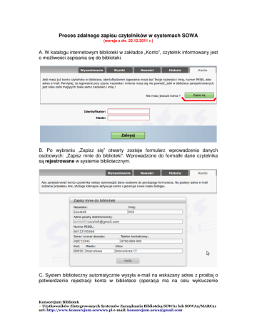 Proces zdalnego zapisu czytelników w systemach SOWA (wersja z dn. 22.12.2011 r.) A. W katalogu internetowym biblioteki w zakładce „Konto”, czytelnik informowany jest o moŜliwości zapisania się do biblioteki. B. Po wybraniu „Zapisz się” otwarty zostaje formularz wprowadzenia danych osobowych: „Zapisz mnie do biblioteki”. Wprowadzone do formatki dane czytelnika są rejestrowane w systemie bibliotecznym. C. System biblioteczny automatycznie wysyła e-mail na wskazany adres z prośbą o potwierdzenie rejestracji konta w bibliotece (operacja ma na celu wykluczenie Konsorcjum Bibliotek – Użytkowników Zintegrowanych Systemów Zarządzania Biblioteką SOWA1 lub SOWA2/MARC21 url: http://www.konsorcjum.sowwwa.pl e-mail: [email protected] internautów, którzy wprowadzili nieprawdziwe dane do formularza). Przychodząca wiadomość informuje czytelnika o numerze IP komputera, z którego dokonano rejestracji oraz o danych osobowych wpisanych do formularza. Aby potwierdzić rejestrację i aktywować konto, konieczne jest kliknięcie na wskazany odnośnik. D. Bibliotekarz w Module WypoŜyczalni w zakładce "do potwierdzenia", ma wgląd w listę dokonanych zapisów czytelników. W przypadku braku potwierdzenia akceptacji przez czytelnika przez dłuŜszy okres czasu, bibliotekarz moŜe skasować niepotwierdzoną rejestrację. Konsorcjum Bibliotek – Użytkowników Zintegrowanych Systemów Zarządzania Biblioteką SOWA1 lub SOWA2/MARC21 url: http://www.konsorcjum.sowwwa.pl e-mail: [email protected] E. Jeśli jednak czytelnik potwierdził aktywację konta, w katalogu internetowym biblioteki, pojawia się komunikat. F. Następnie system generuje hasło dostępu do katalogu i wysyła ponowny mail z informacją nt. temat. W tym momencie czytelnik ma juŜ moŜliwość zmiany hasła po pierwszym logowaniu. G. Po aktywacji konta, czytelnik moŜe juŜ dokonywać operacji zamawiania i rezerwacji zbiorów bibliotecznych, bibliotekarz natomiast monitoruje jego czynności. Konsorcjum Bibliotek – Użytkowników Zintegrowanych Systemów Zarządzania Biblioteką SOWA1 lub SOWA2/MARC21 url: http://www.konsorcjum.sowwwa.pl e-mail: [email protected] H. W trakcie odwiedzin czytelnika w bibliotece, przed odebraniem zarezerwowanych zbiorów, bibliotekarz sprawdza toŜsamość czytelnika oraz nadaje czytelnikowi właściwy kod i wydaje legitymację biblioteczną. I. Internetowy uŜytkownik katalogu internetowego staje się zarejestrowanym czytelnikiem biblioteki. Czytelnik nie pamięta hasła dostępu do katalogu internetowego biblioteki A. Czytelnik próbuje zalogować się do katalogu internetowego wpisując błędne hasło. Konsorcjum Bibliotek – Użytkowników Zintegrowanych Systemów Zarządzania Biblioteką SOWA1 lub SOWA2/MARC21 url: http://www.konsorcjum.sowwwa.pl e-mail: [email protected] B. System zwraca informację „Logowanie się nie powiodło”, a następnie pojawia się komunikat: „Wygeneruj nowe hasło”. C. Czytelnik klikając komendę „Wygeneruj nowe hasło”, zostaje przeniesiony do skróconego formularza edycji danych osobowych i musi podać swoje dane: nazwisko i imię oraz adres poczty elektronicznej. D. Gdy dane się zgadzają, system wysyła e-mail na wskazy adres z prośbą o potwierdzenie Ŝądania. Konsorcjum Bibliotek – Użytkowników Zintegrowanych Systemów Zarządzania Biblioteką SOWA1 lub SOWA2/MARC21 url: http://www.konsorcjum.sowwwa.pl e-mail: [email protected] E. Po akceptacji operacji, system generuje hasło dostępu do katalogu i wysyła ponowny mail z informacją nt. temat. Konsorcjum Bibliotek – Użytkowników Zintegrowanych Systemów Zarządzania Biblioteką SOWA1 lub SOWA2/MARC21 url: http://www.konsorcjum.sowwwa.pl e-mail: [email protected]