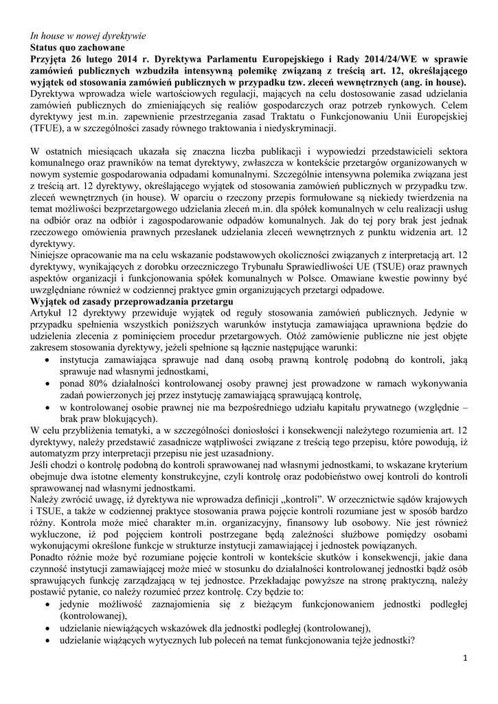 In house w nowej dyrektywie Status quo zachowane Przyjęta 26