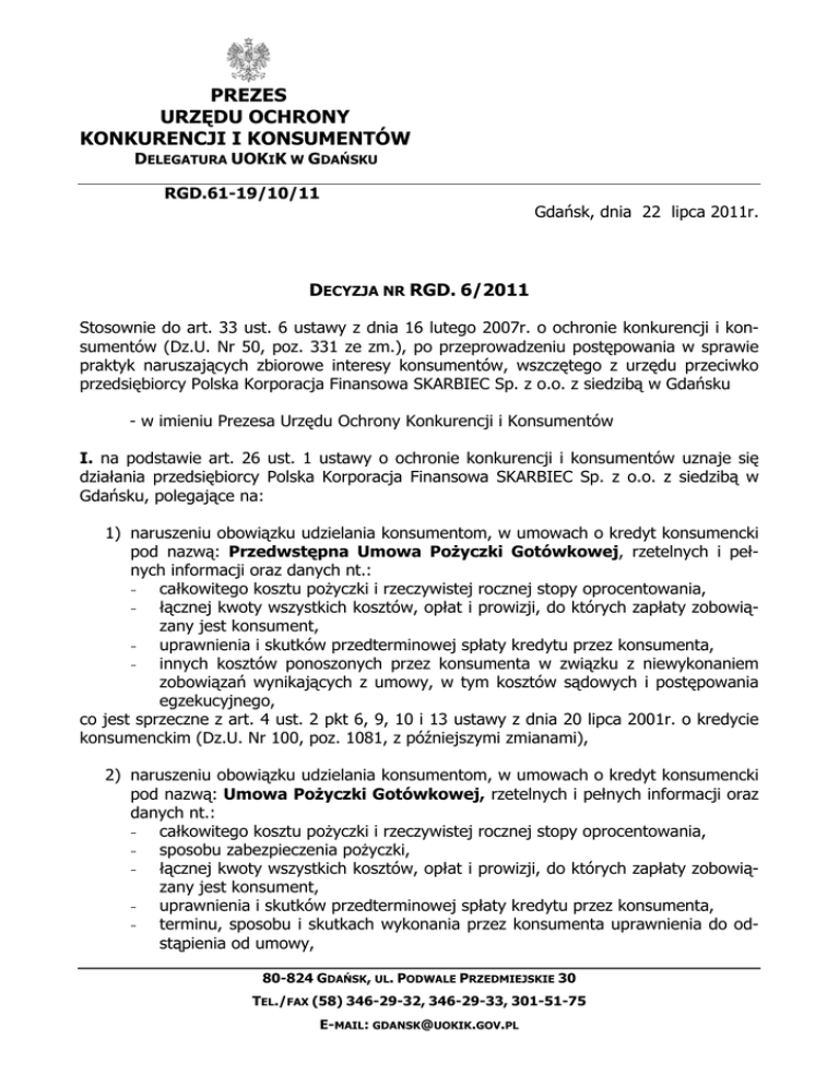 PREZES URZĘDU OCHRONY KONKURENCJI I KONSUMENTÓW DELEGATURA UOKIK W GDAŃSKU RGD.61-19/10/11 Gdańsk, dnia 22 lipca 2011r. DECYZJA NR RGD. 6/2011 Stosownie do art. 33 ust. 6 ustawy z dnia 16 lutego 2007r. o ochronie konkurencji i konsumentów (Dz.U. Nr 50, poz. 331 ze zm.), po przeprowadzeniu postępowania w sprawie praktyk naruszających zbiorowe interesy konsumentów, wszczętego z urzędu przeciwko przedsiębiorcy Polska Korporacja Finansowa SKARBIEC Sp. z o.o. z siedzibą w Gdańsku - w imieniu Prezesa Urzędu Ochrony Konkurencji i Konsumentów I. na podstawie art. 26 ust. 1 ustawy o ochronie konkurencji i konsumentów uznaje się działania przedsiębiorcy Polska Korporacja Finansowa SKARBIEC Sp. z o.o. z siedzibą w Gdańsku, polegające na: 1) naruszeniu obowiązku udzielania konsumentom, w umowach o kredyt konsumencki pod nazwą: Przedwstępna Umowa Pożyczki Gotówkowej, rzetelnych i pełnych informacji oraz danych nt.: - całkowitego kosztu pożyczki i rzeczywistej rocznej stopy oprocentowania, - łącznej kwoty wszystkich kosztów, opłat i prowizji, do których zapłaty zobowiązany jest konsument, - uprawnienia i skutków przedterminowej spłaty kredytu przez konsumenta, - innych kosztów ponoszonych przez konsumenta w związku z niewykonaniem zobowiązań wynikających z umowy, w tym kosztów sądowych i postępowania egzekucyjnego, co jest sprzeczne z art. 4 ust. 2 pkt 6, 9, 10 i 13 ustawy z dnia 20 lipca 2001r. o kredycie konsumenckim (Dz.U. Nr 100, poz. 1081, z późniejszymi zmianami), 2) naruszeniu obowiązku udzielania konsumentom, w umowach o kredyt konsumencki pod nazwą: Umowa Pożyczki Gotówkowej, rzetelnych i pełnych informacji oraz danych nt.: - całkowitego kosztu pożyczki i rzeczywistej rocznej stopy oprocentowania, - sposobu zabezpieczenia pożyczki, - łącznej kwoty wszystkich kosztów, opłat i prowizji, do których zapłaty zobowiązany jest konsument, - uprawnienia i skutków przedterminowej spłaty kredytu przez konsumenta, - terminu, sposobu i skutkach wykonania przez konsumenta uprawnienia do odstąpienia od umowy, 80-824 GDAŃSK, UL. PODWALE PRZEDMIEJSKIE 30 TEL./FAX (58) 346-29-32, 346-29-33, 301-51-75 E-MAIL: [email protected] innych kosztów ponoszonych przez konsumenta w związku z niewykonaniem zobowiązań wynikających z umowy, w tym kosztów sądowych i postępowania egzekucyjnego, co jest sprzeczne z art. 4 ust. 2 pkt 6, 7, 9, 10, 11 i 13 ustawy z dnia 20 lipca 2001r. o kredycie konsumenckim (Dz. U. Nr 100, poz.1081, z późniejszymi zmianami), - za praktykę naruszającą zbiorowe interesy konsumentów, określoną w art. 24 ust. 1 i 2 pkt 2 ustawy o ochronie konkurencji i konsumentów i nakazuje się zaniechanie stosowania tej praktyki; II. na podstawie art. 26 ust. 1 ustawy o ochronie konkurencji i konsumentów, uznaje się za praktykę naruszającą zbiorowe interesy konsumentów, określoną art. 24 ust. 1 i 2 pkt 3 ustawy o ochronie konkurencji i konsumentów, działania przedsiębiorcy Polska Korporacja Finansowa SKARBIEC Sp. z o.o. z siedzibą w Gdańsku polegające na zamieszczeniu w umowach o kredyt konsumencki, pod nazwą: Przedwstępna Umowa Pożyczki Gotówkowej, nieprawdziwych i wprowadzających w błąd informacji o wysokości rzeczywistej rocznej stopy oprocentowania i całkowitego kosztu pożyczki, co stanowi nieuczciwą praktykę rynkową, o której mowa w art. 5 ust. 1 i 2 pkt 1 w związku z art. 4 ust. 1 i 2 ustawy z dnia 23 sierpnia 2007r. o przeciwdziałaniu nieuczciwym praktykom rynkowym (Dz.U. Nr 171, poz. 1206) i nakazuje się zaniechanie jej stosowania; III. na podstawie art. 26 ust. 1 ustawy o ochronie konkurencji i konsumentów, uznaje się za praktykę naruszającą zbiorowe interesy konsumentów, określoną art. 24 ust. 1 i ust. 2 pkt 3 ustawy o ochronie konkurencji i konsumentów, działania przedsiębiorcy Polska Korporacja Finansowa SKARBIEC Sp. z o.o. z siedzibą w Gdańsku, polegające na rozpowszechnianiu nieprawdziwych informacji, poprzez zamieszczenie w umowach o kredyt konsumencki, pod nazwą: Przedwstępna Umowa Pożyczki Gotówkowej i Umowa Pożyczki Gotówkowej, postanowienia o treści: „Niniejsza Umowa jest zgodna z wymogami polskiego systemu prawnego, a w szczególności spełnia wymogi: a) ustawy z dnia 20 lipca 2001r. o kredycie konsumenckim Dz. U.01.100.1081(z późniejszymi zmianami) b) ustawy z dnia 15 grudnia 2000r. o ochronie konkurencji i konsumentów Dz.U.03.86.804 (z późniejszymi zmianami), […].”, przez co przeciętny konsument mógł podjąć decyzję dotyczącą umowy, której inaczej by nie podjął, i co stanowi nieuczciwą praktykę rynkową, o której mowa w art. 5 ust.1 i 2 pkt 1 w związku z art. 4 ust. 1 i 2 ustawy z dnia 23 sierpnia 2007r. o przeciwdziałaniu nieuczciwym praktykom rynkowym (Dz.U. Nr 171, poz. 1206) i nakazuje się zaniechanie jej stosowania; IV. na podstawie art. 26 ust. 1 ustawy o ochronie konkurencji i konsumentów, uznaje się za praktykę naruszającą zbiorowe interesy konsumentów, określoną w art. 24 ust. 1 i 2 ustawy o ochronie konkurencji i konsumentów, działania przedsiębiorcy Polska Korporacja Finansowa SKARBIEC Sp. z o.o. z siedzibą w Gdańsku polegające na pobieraniu opłaty przygotowawczej wyższej, niż 5% udzielonej pożyczki, od konsumentów, którzy zawarli Umowę Pożyczki Gotówkowej na kwotę pożyczki niższą, niż wnioskowana w Przedwstępnej Umowie Pożyczki Gotówkowej, co jest sprzeczne z art. 7a ustawy z 2 dnia 20 lipca 2001r. o kredycie konsumenckim (Dz.U. Nr 100, poz.1081, z późniejszymi zmianami). i nakazuje się zaniechanie jej stosowania; V. Na podstawie art. 103 ustawy o ochronie konkurencji i konsumentów nadaje się decyzji w zakresie pkt I, pkt II, pkt III i pkt IV sentencji decyzji rygor natychmiastowej wykonalności; VI. Na podstawie art. 106 ust. 1 pkt 4 ustawy o ochronie konkurencji i konsumentów nakłada się na przedsiębiorcę Polska Korporacja Finansowa SKARBIEC Sp. z o.o. z siedzibą w Gdańsku