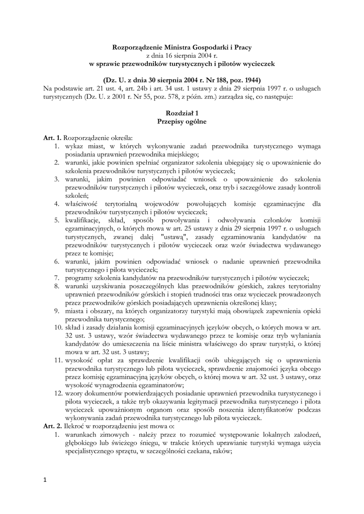 Rozporządzenie Ministra Gospodarki i Pracy z dnia 16 sierpnia 2004 r. w sprawie przewodników turystycznych i pilotów wycieczek (Dz. U. z dnia 30 sierpnia 2004 r. Nr 188, poz. 1944) Na podstawie art. 21 ust. 4, art. 24b i art. 34 ust. 1 ustawy z dnia 29 sierpnia 1997 r. o usługach turystycznych (Dz. U. z 2001 r. Nr 55, poz. 578, z późn. zm.) zarządza się, co następuje: Rozdział 1 Przepisy ogólne Art. 1. Rozporządzenie określa: 1. wykaz miast, w których wykonywanie zadań przewodnika turystycznego wymaga posiadania uprawnień przewodnika miejskiego; 2. warunki, jakie powinien spełniać organizator szkolenia ubiegający się o upowaŜnienie do szkolenia przewodników turystycznych i pilotów wycieczek; 3. warunki, jakim powinien odpowiadać wniosek o upowaŜnienie do szkolenia przewodników turystycznych i pilotów wycieczek, oraz tryb i szczegółowe zasady kontroli szkoleń; 4. właściwość terytorialną wojewodów powołujących komisje egzaminacyjne dla przewodników turystycznych i pilotów wycieczek; 5. kwalifikacje, skład, sposób powoływania i odwoływania członków komisji egzaminacyjnych, o których mowa w art. 25 ustawy z dnia 29 sierpnia 1997 r. o usługach turystycznych, zwanej dalej "ustawą", zasady egzaminowania kandydatów na przewodników turystycznych i pilotów wycieczek oraz wzór świadectwa wydawanego przez te komisje; 6. warunki, jakim powinien odpowiadać wniosek o nadanie uprawnień przewodnika turystycznego i pilota wycieczek; 7. programy szkolenia kandydatów na przewodników turystycznych i pilotów wycieczek; 8. warunki uzyskiwania poszczególnych klas przewodników górskich, zakres terytorialny uprawnień przewodników górskich i stopień trudności tras oraz wycieczek prowadzonych przez przewodników górskich posiadających uprawnienia określonej klasy; 9. miasta i obszary, na których organizatorzy turystyki mają obowiązek zapewnienia opieki przewodnika turystycznego; 10. skład i zasady działania komisji egzaminacyjnych języków obcych, o których mowa w art. 32 ust. 3 ustawy, wzór świadectwa wydawanego przez te komisje oraz tryb wyłaniania kandydatów do umieszczenia na liście ministra właściwego do spraw turystyki, o której mowa w art. 32 ust. 3 ustawy; 11. wysokość opłat za sprawdzenie kwalifikacji osób ubiegających się o uprawnienia przewodnika turystycznego lub pilota wycieczek, sprawdzenie znajomości języka obcego przez komisję egzaminacyjną języków obcych, o której mowa w art. 32 ust. 3 ustawy, oraz wysokość wynagrodzenia egzaminatorów; 12. wzory dokumentów potwierdzających posiadanie uprawnień przewodnika turystycznego i pilota wycieczek, a takŜe tryb okazywania legitymacji przewodnika turystycznego i pilota wycieczek upowaŜnionym organom oraz sposób noszenia identyfikatorów podczas wykonywania zadań przewodnika turystycznego lub pilota wycieczek. Art. 2. Ilekroć w rozporządzeniu jest mowa o: 1. warunkach zimowych - naleŜy przez to rozumieć występowanie lokalnych zalodzeń, głębokiego lub świeŜego śniegu, w trakcie których uprawianie turystyki wymaga uŜycia specjalistycznego sprzętu, w szczególności czekana, raków; 1 2. warunkach letnich - naleŜy przez to rozumieć stan, w którym nie występują czynniki atmosferyczne, o których mowa w pkt 1. Rozdział 2 Szkolenia dla przewodników turystycznych i pilotów wycieczek oraz ich kontrola Art. 3. 1. UpowaŜnienie do przeprowadzenia szkolenia przewodników turystycznych lub pilotów wycieczek wydaje na wniosek zainteresowanego podmiotu, zwanego dalej "wnioskodawcą", wojewoda, o którym mowa w art. 24 ust. 1 ustawy. 2. Wniosek, o którym mowa w ust. 1, zawiera: 1. wskazanie jednostki organizacyjnej lub osoby ubiegającej się o upowaŜnienie; 2. określenie zakresu szkolenia, które wnioskodawca zamierza prowadzić, w tym wskazanie: a. czy szkolenie ma mieć charakter podstawowy, czy uzupełniający, b. obszaru uprawnień, którego ma dotyczyć szkolenie przewodników turystycznych, z podaniem zasięgu regionu lub trasy turystycznej dla uprawnień przewodnika terenowego innych niŜ obszar całego województwa; 3. wskazanie, czy upowaŜnienie ma mieć charakter stały, czy jednorazowy; 4. oświadczenie, czy szkolenie będzie przeprowadzone w ramach prowadzonej działalności gospodarczej; 5. wskazanie kierownika szkolenia lub innej osoby upowaŜnionej do występowania wobec wojewody w sprawach związanych ze szkoleniem; 6. informację o dotychczasowych szkoleniach prowadzonych przez wnioskodawcę, jeŜeli wnioskodawca prowadził uprzednio szkolenia; 7. opis warunków szkolenia, w tym wskazanie miejsca odbywania wykładów i zajęć praktycznych, a takŜe określenie miejsca przechowywania dokumentacji szkolenia i archiwum wydanych dokumentów. 3. Do wniosku, o którym mowa w ust. 1, dołącza się: 1. szczegółowe programy szkolenia, zgodne z odpowiednimi wymaganiami programów, o których mowa w Art. 4; 2. wykaz kadry wykładowców i instruktorów realizujących zajęcia objęte programem szkolenia, z udokumentowaniem ich kwalifikacji w formie: a. odpisu dyplomu ukończenia studiów wyŜszych, b. zaświadczenia o posiadaniu praktyki uzasadniającej powierzenie obowiązków instruktora w ramach zajęć praktycznych, wydanego przez jednostkę powierzającą zainteresowanemu wykonywanie zadań przewodnika turystycznego lub pilota wycieczek lub przez stowarzyszenie zrzeszające przewodników turystycznych i pilotów wycieczek; 3. pozytywną opinię wojewody właściwego do przeprowadzenia egzaminu; 4. oświadczenia osób objętych wykazem, o którym mowa w pkt 2, potwierdzające zgodę na współpracę z wnioskodawcą w zakresie objętym wnioskiem; 5. wskazanie siedziby, w której wnioskodawca zamierza przechowywać dokumentację szkolenia i archiwum wydanych dokumentów; 6. wewnętrzny regulamin szkolenia, przedstawiany słuchaczom, określający w szczególności warunki potwierdzania udziału w zajęciach teoretycznych i praktyc
