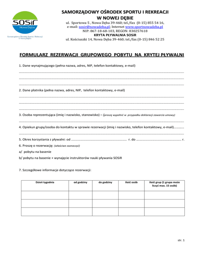SAMORZĄDOWY OŚRODEK SPORTU I REKREACJI W NOWEJ DĘBIE ul. Sportowa 5 , Nowa Dęba 39-460; tel./fax (0-15) 855 54 16, e-mail: [email protected]; Internet www.sportnowadeba.pl NIP: 867-18-68-103, REGON: 830257618 KRYTA PŁYWALNIA SOSiR ul. Kościuszki 14, Nowa Dęba 39-460; tel./fax (0-15) 846 52 25 FORMULARZ REZERWACJI GRUPOWEGO POBYTU NA KRYTEJ PŁYWALNI 1. Dane wynajmującego (pełna nazwa, adres, NIP, telefon kontaktowy, e-mail) .................................................................................................................................................................................. .................................................................................................................................................................................. .................................................................................................................................................................................. 2. Dane płatnika (pełna nazwa, adres, NIP, telefon kontaktowy, e-mail) .................................................................................................................................................................................. .................................................................................................................................................................................. .................................................................................................................................................................................. 3. Osoba reprezentująca (imię i nazwisko, stanowisko) – (proszę wypełnid w przypadku deklaracji zawarcia umowy) .................................................................................................................................................................................. 4. Opiekun grupy/osoba do kontaktu w sprawie rezerwacji (imię i nazwisko, telefon kontaktowy, e-mail)………... .................................................................................................................................................................................. 5. Okres korzystania z pływalni: od ............................................................ r. do ….............................................. r. 6. Proszę o rezerwację: (właściwe zaznaczyd) a/ pobytu na basenie b/ pobytu na basenie + wynajęcie instruktorów nauki pływania SOSiR 7. Szczegółowe informacje dotyczące rezerwacji: Dzieo tygodnia od godziny do godziny Ilośd osób Ilośd grup (1 grupa może liczyd max. 15 osób) str. 1 7a. Informacje na temat grup (proszę wypełnid w przypadku wynajęcia instruktorów nauki pływania SOSiR) l.p. Termin rezerwacji grupy Ilośd osób w grupie (1 grupa może liczyd max. 15 osób) Wiek dzieci w grupie * Poziom umiejętności pływackich w grupie Ilośd dzieci doskonalących umiejętności pływackie Uwagi Ilośd dzieci niepotrafiących pływad 1 2 3 4 5 6 *Kl.I-III Szkoły Podstawowej; Kl. IV.-VI Szkoły Podstawowej; Kl. I-III Gimnazjum; Szkoła Średnia; Inne 8. Sposób płatności: a/FAKTURA - przelew na konto bankowe w ciągu 14 dni/ 30 dni (właściwe zaznaczyć) od daty wystawienia faktury na koniec miesiąca kalendarzowego na podstawie ewidencji wejśd prowadzonej przez pracowników SOSiR, po podpisaniu umowy korzystania z pływalni lub po złożeniu zobowiązania terminowego uregulowania płatności (prosimy dołączyd do niniejszego formularza pismo przewodnie, zawierające dane wynajmującego/płatnika) b/ FAKTURA lub PARAGON (właściwe zaznaczyć) - gotówka w kasie każdorazowo przed rozpoczęciem zajęd. Uwaga: W przypadku wynajęcia instruktorów nauki pływania SOSiR podpisanie umowy jest konieczne. 9. Inne: Oświadczam, że zapoznałem/am się z Regulaminem korzystania z krytej pływalni przez grupy zorganizowane, cennikiem usług oraz warunkami korzystania z pływalni. Uwaga: Wstęp na halę basenową możliwy jest tylko w ogólnie przyjętym stroju kąpielowym, czepku pływackim (strój kąpielowy: dla kobiet jedno lub dwuczęściowy, dla mężczyzn kąpielówki przylegające do ciała). ……………………..…………................................. data, podpis i pieczęd osoby zgłaszającej rezerwację Wypełniony formularz należy wysład e-mailem: [email protected], faxem 0-15 855 54 16 lub dostarczyd osobiście na kasę krytej pływalni. Prosimy o wydruk obustronny. str. 2
