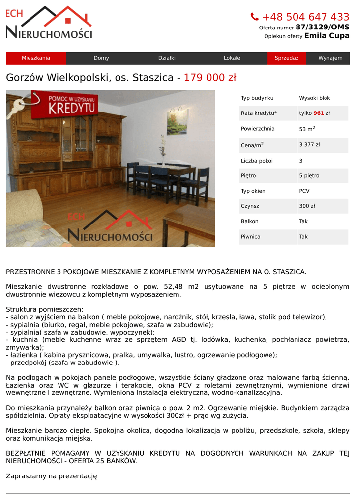 +48504647433 Ofertanumer87/3129/OMS OpiekunofertyEmilaCupa Mieszkania Domy Działki Lokale Sprzedaż Wynajem GorzówWielkopolski,os.Staszica-179000zł Typbudynku Wysokiblok Ratakredytu* tylko961zł Powierzchnia 53m2 Cena/m2 3377zł Liczbapokoi 3 Piętro 5piętro Typokien PCV Czynsz 300zł Balkon Tak Piwnica Tak PRZESTRONNE3POKOJOWEMIESZKANIEZKOMPLETNYMWYPOSAŻENIEMNAO.STASZICA. Mieszkanie dwustronne rozkładowe o pow. 52,48 m2 usytuowane na 5 piętrze w ocieplonym dwustronniewieżowcuzkompletnymwyposażeniem. Strukturapomieszczeń: -salonzwyjściemnabalkon(meblepokojowe,narożnik,stół,krzesła,ława,stolikpodtelewizor); -sypialnia(biurko,regał,meblepokojowe,szafawzabudowie); -sypialnia(szafawzabudowie,wypoczynek); - kuchnia (meble kuchenne wraz ze sprzętem AGD tj. lodówka, kuchenka, pochłaniacz powietrza, zmywarka); -łazienka(kabinaprysznicowa,pralka,umywalka,lustro,ogrzewaniepodłogowe); -przedpokój(szafawzabudowie). Napodłogachwpokojachpanelepodłogowe,wszystkieścianygładzoneorazmalowanefarbąścienną. Łazienka oraz WC w glazurze i terakocie, okna PCV z roletami zewnętrznymi, wymienione drzwi wewnętrzneizewnętrzne.Wymienionainstalacjaelektryczna,wodno-kanalizacyjna. Domieszkaniaprzynależybalkonorazpiwnicaopow.2m2.Ogrzewaniemiejskie.Budynkiemzarządza spółdzielnia.Opłatyeksploatacyjnewwysokości300zł+prądwgzużycia. Mieszkanie bardzo ciepłe. Spokojna okolica, dogodna lokalizacja w pobliżu, przedszkole, szkoła, sklepy orazkomunikacjamiejska. BEZPŁATNIE POMAGAMY W UZYSKANIU KREDYTU NA DOGODNYCH WARUNKACH NA ZAKUP TEJ NIERUCHOMOŚCI-OFERTA25BANKÓW. Zapraszamynaprezentację ul.MieszkaI-go2/3,66-400GorzówWlkp.,telefon:+48504647443,e-mail:[email protected]