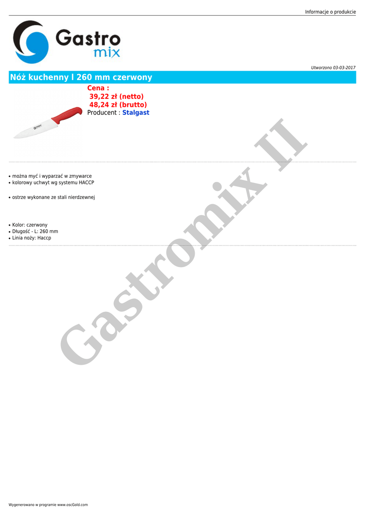 Informacje o produkcie Utworzono 03-03-2017 Nóż kuchenny l 260 mm czerwony Cena : 39,22 zł (netto) 48,24 zł (brutto) ● ● ● ostrze wykonane ze stali nierdzewnej Kolor: czerwony Długość - L: 260 mm Linia noży: Haccp G as tr o ● można myć i wyparzać w zmywarce kolorowy uchwyt wg systemu HACCP ix ● m ● II Producent : Stalgast Wygenerowano w programie www.oscGold.com