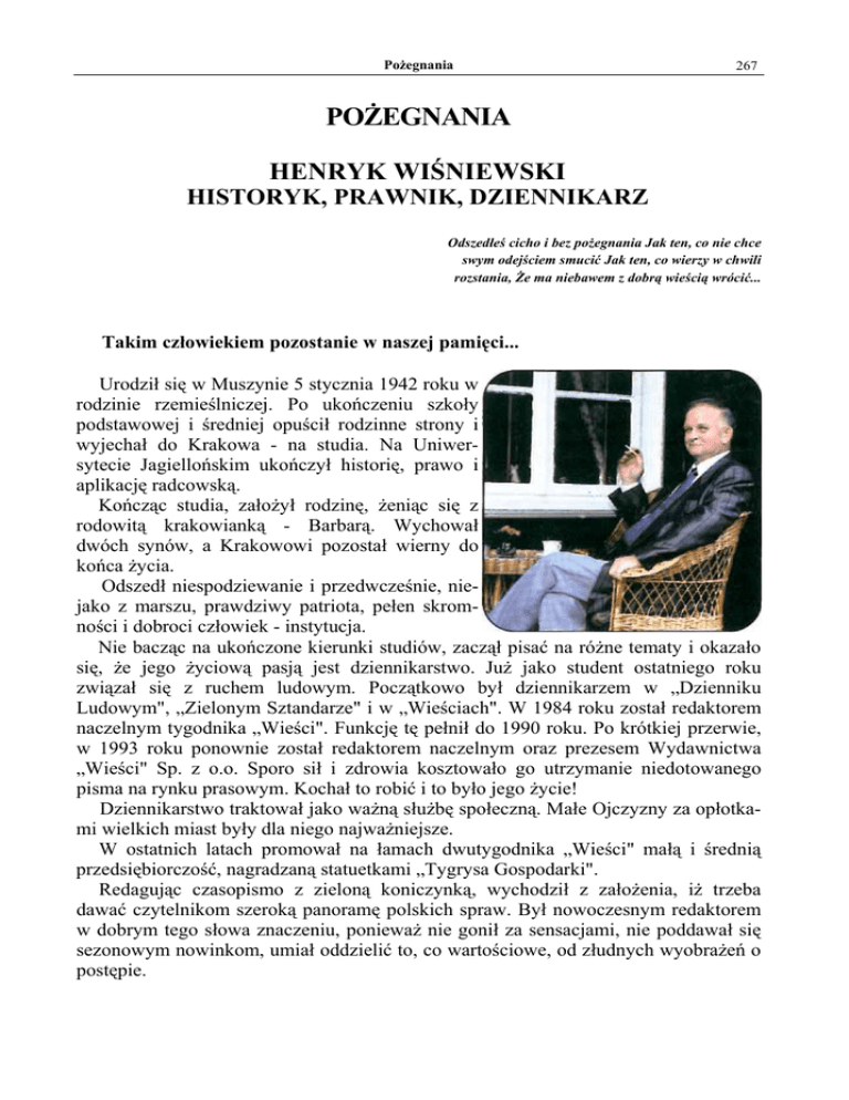 Pożegnania 267 POŻEGNANIA HENRYK WIŚNIEWSKI HISTORYK, PRAWNIK, DZIENNIKARZ Odszedłeś cicho i bez pożegnania Jak ten, co nie chce swym odejściem smucić Jak ten, co wierzy w chwili rozstania, Że ma niebawem z dobrą wieścią wrócić... Takim człowiekiem pozostanie w naszej pamięci... Urodził się w Muszynie 5 stycznia 1942 roku w rodzinie rzemieślniczej. Po ukończeniu szkoły podstawowej i średniej opuścił rodzinne strony i wyjechał do Krakowa - na studia. Na Uniwersytecie Jagiellońskim ukończył historię, prawo i aplikację radcowską. Kończąc studia, założył rodzinę, żeniąc się z rodowitą krakowianką - Barbarą. Wychował dwóch synów, a Krakowowi pozostał wierny do końca życia. Odszedł niespodziewanie i przedwcześnie, niejako z marszu, prawdziwy patriota, pełen skromności i dobroci człowiek - instytucja. Nie bacząc na ukończone kierunki studiów, zaczął pisać na różne tematy i okazało się, że jego życiową pasją jest dziennikarstwo. Już jako student ostatniego roku związał się z ruchem ludowym. Początkowo był dziennikarzem w „Dzienniku Ludowym", „Zielonym Sztandarze" i w „Wieściach". W 1984 roku został redaktorem naczelnym tygodnika „Wieści". Funkcję tę pełnił do 1990 roku. Po krótkiej przerwie, w 1993 roku ponownie został redaktorem naczelnym oraz prezesem Wydawnictwa „Wieści" Sp. z o.o. Sporo sił i zdrowia kosztowało go utrzymanie niedotowanego pisma na rynku prasowym. Kochał to robić i to było jego życie! Dziennikarstwo traktował jako ważną służbę społeczną. Małe Ojczyzny za opłotkami wielkich miast były dla niego najważniejsze. W ostatnich latach promował na łamach dwutygodnika „Wieści" małą i średnią przedsiębiorczość, nagradzaną statuetkami „Tygrysa Gospodarki". Redagując czasopismo z zieloną koniczynką, wychodził z założenia, iż trzeba dawać czytelnikom szeroką panoramę polskich spraw. Był nowoczesnym redaktorem w dobrym tego słowa znaczeniu, ponieważ nie gonił za sensacjami, nie poddawał się sezonowym nowinkom, umiał oddzielić to, co wartościowe, od złudnych wyobrażeń o postępie. 268 Pożegnania „Wieści" miały jasno i ściśle wytyczony kierunek. Prezentowały wszystkie oblicza prawdy - tej bardzo ważnej i tej codziennej, tej z przymrużeniem oka, a czasem nawet rubasznej, i tej zatroskanej, a mimo to starającej się żartować. Dzięki Henrykowi Wiśniewskiemu „Wieści" z uporem walczyły o zachowanie zdrowego rozsądku; jako dziennikarz wybrał najlepszą drogę przez życie, pracując z myślą 0 innych. Odszedł, pozostawiając po sobie wiele trafnych i wyważonych recenzji życia publicznego oraz wiele cennych publikacji z zakresu prawa, historii, rolnictwa, gospodarki, kultury, obyczajowości i innych dziedzin. W nocy z 20 na 21 listopada 2003 roku, po kolejnej edycji konkursu „Tygrys Gospodarki", Bóg powołał go do wieczności, obdarzając szczęściem wiecznym. Pochowany został 27 listopada na Cmentarzu Rakowickim. Cześć Jego pamięci. Rodzina Kraków, 25 maja 2004 roku WIKTOR BORZEMSKI (1916-2003) Wiktor Borzemski urodził się poza Muszyną, ale już w roku 1920 zamieszkał tu wraz z rodzicami i młodszym bratem Tadeuszem. Jego ojciec był leśniczym i znanym działaczem Strzelca. Wojenny los rzucił młodego Wiktora do Anglii, gdzie służył m.in. w 1. Polskiej Samodzielnej Brygadzie Spadochronowej, otrzymując w styczniu 1945 roku stopień kapitana. W roku 1944 ożenił się z Janet Robertson Morton, poznaną w czasie jednego z nalotów, nękających Wielką Brytanię. W roku 1951 państwo Bo-rzemscy, razem z dwójką malutkich dzieci, wyjechali do USA. Tyle lat poza Ojczyzną, poza Muszyną, nie osłabiło miłości do tej ziemi i tęsknoty pana Wiktora. Pisał listy 1 czekał niecierpliwie na parę słów z ukochanego miasta młodości. Utrzymywał kontakt korespondencyjny z panem Stefanem Małeckim oraz z redakcją Almanachu Muszyny, dokonywał wpłat na Fundusz Stypendialny. Oboje z żoną postanowili, że po śmierci spoczną na muszyńskim cmentarzu. Jego wspomnienia publikował Almanach Muszyny w 2000 roku. Pożegnania 269 JANINA JANICKA (1912 - 2003) Janina Janicka z domu Parylewicz, urodziła się w Muszynie w roku 1912. Wspominała, że była podobno pierwszym dzieckiem odebranym przez młodego lekarza, świeżo przybyłego do Muszyny - dra Seweryna Mściwujewskiego. Była córką sędziego, naczelnika muszyńskiego Sądu. W czasie I wojny światowej w domu państwa Parylewi-czów znalazł schronienie wuj pani Janiny, Bronisław Pieracki, współpracownik Józefa Piłsudskiego, późniejszy minister spraw wewnętrznych. Jako mała dziewczynka pani Janina Janicka brała udział w wielu uroczystościach państwowych i patriotycznych manifestacjach, wręczając kwiaty goszczącym w Muszynie i Krynicy osobistościom. Posadziła także drzewko, nazwane Dębem Wolności, które do dzisiaj przypomina czasy odzyskania niepodległości przez Rzeczypospolitą rosnąc spokojnie w Rynku, przed budynkiem muszyńskiej szkoły. Zmarła w Warszawie, gdzie spędziła ostatni okres życia, do końca z radością wspominając dziecinne lata, spędzone w słonecznej Muszynie. Była wierną czytelniczką Almanachu Muszyny, z którego redakcją pozostawała w serdecznych kontaktach. Bywała często w Muszynie, zarażając znajomych sympatią do naszego miasteczka.