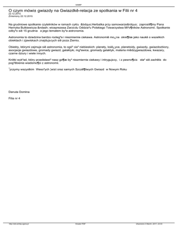 WiMBP O czym mówi± gwiazdy na Gwiazdkê-relacja ze spotkania w Filii nr 4 22.12.2010. Zmieniony 22.12.2010. Na grudniowe spotkanie czytelników w ramach cyklu „Herbatka przy samowarze” zaprosili¶my Pana Henryka Butkiewicza – wiceprezesa Zarz±du Oddzia³u Polskiego Towarzystwa Mi³o¶ników Astronomii. Spotkanie odby³o siê 15 grudnia a jego tematem by³a astronomia. Astronomia to dziedzina bardzo rozleg³a i niezmiernie ciekawa. Astronomiê mo¿na okre¶liæ jako naukê o wszelkich obiektach i zjawiskach znajduj±cych siê poza Ziemi±. Obiekty, którymi zajmuje siê astronomia, to ogó³ cia³ niebieskich: planety, ksiê¿yce, planetoidy, gwiazdy, gwiazdozbiory, asocjacje gwiazdowe, gromady gwiazd, galaktyki, mg³awice, gromady galaktyk, materia miêdzygwiazdowa, kwazary, czarne dziury i wiele innych. Krótki wyk³ad, który przedstawi³ nasz go¶æ by³ niezmiernie ciekawy i intryguj±cy, i z pewno¶ci± sta³ siê zachêt± do pog³êbienia wiadomo¶ci z astronomii. ¯yczymy wszystkim Weso³ych ¦wi±t oraz samych Szczê¶liwych Gwiazd w Nowym Roku Danuta Domina Filia nr 4 http://old.wimbp.zgora.pl Kreator PDF Utworzono 3 March, 2017, 23:33