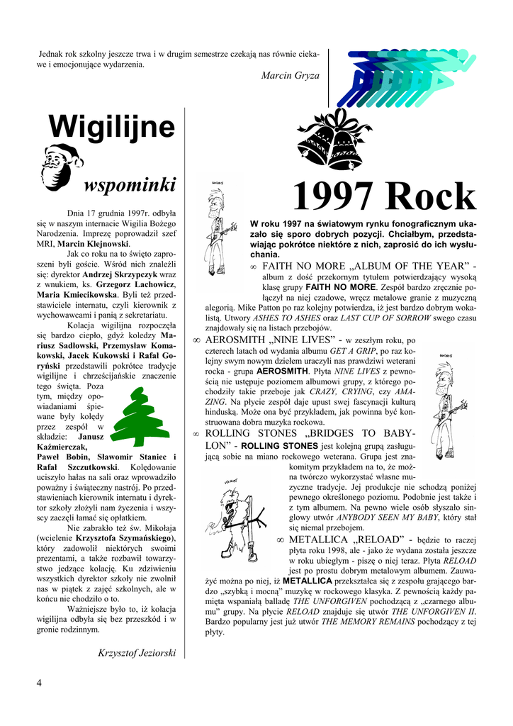 Jednak rok szkolny jeszcze trwa i w drugim semestrze czekają nas równie ciekawe i emocjonujące wydarzenia. Marcin Gryza Wigilijne wspominki Dnia 17 grudnia 1997r. odbyła się w naszym internacie Wigilia Bożego Narodzenia. Imprezę poprowadził szef MRI, Marcin Klejnowski. Jak co roku na to święto zaproszeni byli goście. Wśród nich znaleźli się: dyrektor Andrzej Skrzypczyk wraz z wnukiem, ks. Grzegorz Lachowicz, Maria Kmiecikowska. Byli też przedstawiciele internatu, czyli kierownik z wychowawcami i panią z sekretariatu. Kolacja wigilijna rozpoczęła się bardzo ciepło, gdyż koledzy Mariusz Sadłowski, Przemysław Komakowski, Jacek Kukowski i Rafał Goryński przedstawili pokrótce tradycje wigilijne i chrześcijańskie znaczenie tego święta. Poza tym, między opowiadaniami śpiewane były kolędy przez zespół w składzie: Janusz Kaźmierczak, Paweł Bobin, Sławomir Staniec i Rafał Szczutkowski. Kolędowanie uciszyło hałas na sali oraz wprowadziło poważny i świąteczny nastrój. Po przedstawieniach kierownik internatu i dyrektor szkoły złożyli nam życzenia i wszyscy zaczęli łamać się opłatkiem. Nie zabrakło też św. Mikołaja (wcielenie Krzysztofa Szymańskiego), który zadowolił niektórych swoimi prezentami, a także rozbawił towarzystwo jedzące kolację. Ku zdziwieniu wszystkich dyrektor szkoły nie zwolnił nas w piątek z zajęć szkolnych, ale w końcu nie chodziło o to. Ważniejsze było to, iż kolacja wigilijna odbyła się bez przeszkód i w gronie rodzinnym. Krzysztof Jeziorski 4 1997 Rock • • W roku 1997 na światowym rynku fonograficznym ukazało się sporo dobrych pozycji. Chciałbym, przedstawiając pokrótce niektóre z nich, zaprosić do ich wysłuchania. • FAITH NO MORE „ALBUM OF THE YEAR” album z dość przekornym tytułem potwierdzający wysoką klasę grupy FAITH NO MORE. Zespół bardzo zręcznie połączył na niej czadowe, wręcz metalowe granie z muzyczną alegorią. Mike Patton po raz kolejny potwierdza, iż jest bardzo dobrym wokalistą. Utwory ASHES TO ASHES oraz LAST CUP OF SORROW swego czasu znajdowały się na listach przebojów. AEROSMITH „NINE LIVES” - w zeszłym roku, po czterech latach od wydania albumu GET A GRIP, po raz kolejny swym nowym dziełem uraczyli nas prawdziwi weterani rocka - grupa AEROSMITH. Płyta NINE LIVES z pewnością nie ustępuje poziomem albumowi grupy, z którego pochodziły takie przeboje jak CRAZY, CRYING, czy AMAZING. Na płycie zespół daje upust swej fascynacji kulturą hinduską. Może ona być przykładem, jak powinna być konstruowana dobra muzyka rockowa. ROLLING STONES „BRIDGES TO BABYLON” - ROLLING STONES jest kolejną grupą zasługującą sobie na miano rockowego weterana. Grupa jest znakomitym przykładem na to, że można twórczo wykorzystać własne muzyczne tradycje. Jej produkcje nie schodzą poniżej pewnego określonego poziomu. Podobnie jest także i z tym albumem. Na pewno wiele osób słyszało singlowy utwór ANYBODY SEEN MY BABY, który stał się niemal przebojem. • METALLICA „RELOAD” - będzie to raczej płyta roku 1998, ale - jako że wydana została jeszcze w roku ubiegłym - piszę o niej teraz. Płyta RELOAD jest po prostu dobrym metalowym albumem. Zauważyć można po niej, iż METALLICA przekształca się z zespołu grającego bardzo „szybką i mocną” muzykę w rockowego klasyka. Z pewnością każdy pamięta wspaniałą balladę THE UNFORGIVEN pochodzącą z „czarnego albumu” grupy. Na płycie RELOAD znajduje się utwór THE UNFORGIVEN II. Bardzo popularny jest już utwór THE MEMORY REMAINS pochodzący z tej płyty.