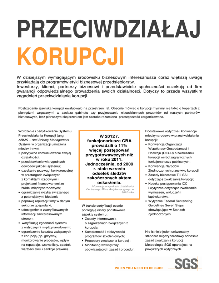 PRZECIWDZIAŁAJ KORUPCJI W dzisiejszym wymagającym środowisku biznesowym interesariusze coraz większą uwagę przykładają do programów etyki biznesowej przedsiębiorstw. Inwestorzy, klienci, partnerzy biznesowi i przedstawiciele społeczności oczekują od firm gwarancji odpowiedzialnego prowadzenia swoich działalności. Dotyczy to przede wszystkim zagadnień przeciwdziałania korupcji. Postrzeganie zjawiska korupcji ewaluowało na przestrzeni lat. Obecnie mówiąc o korupcji myślimy nie tylko o kopertach z pieniędzmi wręczanymi w zaciszu gabinetu czy przyjmowaniu niecodziennych prezentów od naszych partnerów biznesowych, lecz pierwszym skojarzeniem jest szeroko rozumiana przestępczość zorganizowana. Wdrożenie i certyfikowanie Systemu Przeciwdziałania Korupcji (ang. ABMS – Anti-Bribery Management System) w organizacji umożliwia między innymi: • pozytywne komunikowanie swojej działalności; • przedstawianie wiarygodnych dowodów jakości systemu; • uzyskanie przewagi konkurencyjnej w przetargach związanych z kontaktami rządowymi i projektami finansowanymi ze źródeł międzynarodowych; • ograniczanie ryzyka związanego z potencjalnymi błędami; • poprawę reputacji firmy w danym sektorze gospodarki; • udostępnienie zweryfikowanych informacji zainteresowanym stronom; • weryfikację zgodności systemu z wytycznymi międzynarodowymi; • ograniczenie kosztów związanych z korupcją (np. grzywny, monitorowanie procesów, wpływ na reputację, czarne listy, spadek wartości akcji i sankcje prawne). W 2012 r. funkcjonariusze CBA prowadzili o 11% więcej postępowań przygotowawczych niż w roku 2011. Jednocześnie, od 2009 r. stale wzrasta odsetek śledztw zakończonych aktem oskarżenia. Informacja o wynikach działalności Centralnego Biura Antykorupcyjnego w 2012 roku W trakcie certyfikacji ocenie podlegają cztery podstawowe aspekty systemu: • Zasady informowania o zagrożeniach związanych z korupcją; • Kompletność i efektywność programów szkoleniowych; • Procedury zwalczania korupcji; • Monitoring wewnętrzny obowiązujących zasad i procedur. Podstawowe wytyczne i konwencje międzynarodowe w przeciwdziałaniu korupcji: • Konwencja Organizacji Współpracy Gospodarczej i Rozwoju (OECD) o zwalczaniu korupcji wśród zagranicznych funkcjonariuszy publicznych; • Konwencja Narodów Zjednoczonych przeciwko korupcji; • Zasady biznesowe TI i SAI dotyczące zwalczania korupcji; • Kodeks postępowania ICC i wytyczne dotyczące zwalczania wymuszeń, wyłudzeń i łapówkarstwa; • Wytyczne Federal Sentencing Guidelines Seven Steps obowiązujące w Stanach Zjednoczonych. Nie istnieje jeden uniwersalny standard międzynarodowy odnośnie zasad zwalczania korupcji. Metodologia SGS oparta jest na powyższych wytycznych. WYBIERZ SGS NA PARTNERA SGS na całym świecie wspiera przedsiębiorstwa sektora państwowego i prywatnego w tworzeniu, wdrażaniu oraz certyfikacji systemów przeciwdziałania korupcji. Oferujemy szeroki wachlarz usług, wspierając naszych partnerów na etapie budowania systemu lub jego niezależnej oceny na zgodność z wytycznymi międzynarodowymi. Metodologia SGS została opracowana we współpracy z naszym partnerem w certyfikacji – ETHIC Intelligence, a następnie zweryfikowana przez Basel Institute of Governance. Umiejętności, zasoby i wiedza specjalistyczna naszych ekspertów umożliwiają przeprowadzenie profesjonalnej oceny mechanizmów zwalczania korupcji w każdej branży i organizacji. NASZE USŁUGI NASI PARTNERZY Etap budowania systemu: • wsparcie w przeprowadzeniu oraz udokumentowaniu analizy ryzyka dla zagrożeń korupcyjnych; • niezależny program oceny benchmarkingowej; • podnoszenie świadomości – rozbudowane programy szkoleń dla organizacji; • monitoring zewnętrzny wdrożonych systemów – niezależna ocena, identyfikacja możliwości doskonalenia. ETHIC Intelligence jest wiodącą agencją certyfikującą specjalizującą się w zwalczaniu korupcji. Certyfikaty ETHIC Intelligence są przyznawane przez komisję ETHIC Intelligence Certification Committee tworzoną przez międzynarodowych ekspertów w dziedzinie zwalczania korupcji i prania brudnych pieniędzy. Więcej informacji na stronie: www.ethic-intelligence.com. Certyfikacja Systemu Przeciwdziałania Korupcji: • certyfikacja na zgodność z normą BS10500:2011 (Specification for an anti-bribery management system - ABMS); • certyfikacja Ethic Intelligence (ETHIC Intelligence anti-corruption certification process) – prywatny program certyfikacji systemów przeciwdziałania korupcji. „Firmy powinny przeciwdziałać korupcji we wszystkich jej formach, w tym wymuszeniom oraz łapówkarstwu” UN Global Compact, Zasada 10 ABY DOWIEDZIEĆ SIĘ WIĘCEJ SKONTAKTUJ SIĘ Z NAMI: SGS Polska Sp. z o.o. ul. Bema 83, 01-233 Warszawa tel. +48 22 329 22 41 Katarzyna Ordyńska Business Development Manager Sustainability Services [email protected] Specjalistyczny instytut Basel Institute on Governance, prowadzący badania naukowe, opracowujący zasady, zatrudniający ekspertów specjalizujących się w dziedzinie zwalczania korupcji i prania brudnych pieniędzy oraz odzyskiwania zasobów. Więcej informacji na stronie: www.baselgovernance.org.