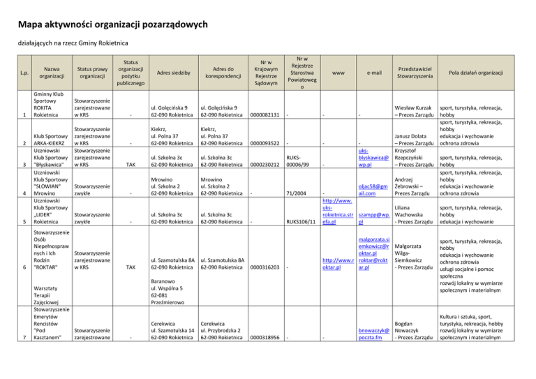 Mapa aktywności organizacji pozarządowych działających na rzecz Gminy Rokietnica L.p. 1 Nazwa organizacji Gminny Klub Sportowy ROKITA Rokietnica Status prawy organizacji Stowarzyszenie zarejestrowane w KRS Stowarzyszenie zarejestrowane w KRS Stowarzyszenie zarejestrowane w KRS 5 Klub Sportowy ARKA-KIEKRZ Uczniowski Klub Sportowy "Błyskawica" Uczniowski Klub Sportowy "SŁOWIAN" Mrowino Uczniowski Klub Sportowy „LIDER” Rokietnica 6 Stowarzyszenie Osób Niepełnospraw nych i Ich Stowarzyszenie Rodzin zarejestrowane "ROKTAR" w KRS 7 Warsztaty Terapii Zajęciowej Stowarzyszenie Emerytów Rencistów "Pod Stowarzyszenie Kasztanem" zarejestrowane 2 3 4 Stowarzyszenie zwykłe Stowarzyszenie zwykłe Status organizacji pożytku publicznego Nr w Krajowym Rejestrze Sądowym Nr w Rejestrze Starostwa Powiatoweg o Adres siedziby Adres do korespondencji - ul. Golęcińska 9 62-090 Rokietnica ul. Golęcińska 9 62-090 Rokietnica 0000082131 - - - Wiesław Kurzak – Prezes Zarządu - Kiekrz, ul. Polna 37 62-090 Rokietnica Kiekrz, ul. Polna 37 62-090 Rokietnica 0000093522 - - TAK ul. Szkolna 3c 62-090 Rokietnica ul. Szkolna 3c 62-090 Rokietnica 0000230212 RUKS00006/99 - uksblyskawica@ wp.pl Janusz Dolata – Prezes Zarządu Krzysztof Rzepczyński – Prezes Zarządu - Mrowino ul. Szkolna 2 62-090 Rokietnica Mrowino ul. Szkolna 2 62-090 Rokietnica oljac58@gm ail.com Andrzej Żebrowski – Prezes Zarządu - ul. Szkolna 3c 62-090 Rokietnica ul. Szkolna 3c 62-090 Rokietnica TAK ul. Szamotulska 8A 62-090 Rokietnica ul. Szamotulska 8A 62-090 Rokietnica - - 0000316203 71/2004 www e-mail Przedstawiciel Stowarzyszenia RUKS106/11 http://www. uksLiliana rokietnica.str szampp@wp. Wachowska efa.pl pl - Prezes Zarządu - malgorzata.si emkowicz@r oktar.pl http://www.r roktar@rokt oktar.pl ar.pl Małgorzata WilgaSiemkowicz - Prezes Zarządu Baranowo ul. Wspólna 5 62-081 Przeźmierowo - Cerekwica ul. Szamotulska 14 62-090 Rokietnica Cerekwica ul. Przybrodzka 2 62-090 Rokietnica 0000318956 - - Bogdan bnowaczyk@ Nowaczyk poczta.fm - Prezes Zarządu Pola działań organizacji sport, turystyka, rekreacja, hobby sport, turystyka, rekreacja, hobby edukacja i wychowanie ochrona zdrowia sport, turystyka, rekreacja, hobby sport, turystyka, rekreacja, hobby edukacja i wychowanie ochrona zdrowia sport, turystyka, rekreacja, hobby edukacja i wychowanie sport, turystyka, rekreacja, hobby edukacja i wychowanie ochrona zdrowia usługi socjalne i pomoc społeczna rozwój lokalny w wymiarze społecznym i materialnym Kultura i sztuka, sport, turystyka, rekreacja, hobby rozwój lokalny w wymiarze społecznym i materialnym L.p. 8 9 10 11 12 13 Nazwa organizacji Stowarzyszenie Lokalna Grupa Działania "Dolina Samy" Polski Związek Wędkarski Okręg w Poznaniu Koło nr 118 STERLET w Rokietnicy Rokietnickie Stowarzyszenie Rozwoju "Idea, Człowiek, Przyszłość" Wojewódzki Związek Pszczelarzy w Poznaniu Koło Pszczelarzy w Rokietnicy Związek Kombatantów Rzeczypospolit ej Polskiej i Więźniów Politycznych Koło Gminne Rokietnica Status prawy organizacji Stowarzyszenie zarejestrowane Stowarzyszenie zarejestrowane Stowarzyszenie zarejestrowane Stowarzyszenie zarejestrowane Status organizacji pożytku publicznego Adres siedziby Adres do korespondencji Cerekwica ul. Szamotulska 7 62-090 Rokietnica Cerekwica ul. Szamotulska 7 62-090 Rokietnica - ul. Szkolna 1 62-090 Rokietnica Kiekrz ul. Wakacyjna 23 62-090 Rokietnica - Os. Kalinowe 2B/8 62-090 Rokietnica Os. Kalinowe 2B/8 62-090 Rokietnica - ul. Golęcińska 1 62-090 Rokietnica ul. Golęcińska 1 62-090 Rokietnica - Nr w Krajowym Rejestrze Sądowym 0000314141 0000077054 0000383256 0000109872 Nr w Rejestrze Starostwa Powiatoweg o www e-mail Przedstawiciel Stowarzyszenia Pola działań organizacji rozwój lokalny w wymiarze społecznym i materialnym wparcie dla instytucji, organizacji pozarządowych i inicjatyw obywatelskich - http://www. dolinasamy.p biuro@dolin l asamy.pl Maciej Adamski - Prezes Zarządu - - pzwrokietnic [email protected] om Szczepan Tylkowski - Prezes Zarządu - kontakt@sto warzyszenierokietnica.pl Michał Cieciora - Prezes Zarządu sport, turystyka, rekreacja, hobby edukacja i wychowanie ochrona zdrowia kultura i sztuka sport, turystyka, rekreacja, hobby edukacja i wychowanie ochrona zdrowia rozwój lokalny w wymiarze społecznym i materialnym - Zdzisław Smól - Prezes Koła Rokietnica ochrona środowiska sprawy zawodowe, pracownicze, branżowe - - - Zgodnie z zawiadomieniem z dnia 17.01.2017 r. Związek Kombatantów Rzeczypospolitej Polskiej i Więźniów Politycznych Koło Gminne Rokietnica został rozwiązany z dniem 01.01.2017 r. Stowarzyszenie Sołtysów Województwa Wielkopolskieg o, Koło Gminne Rokietnica - - ul. Rolna 18 62-090 Rokietnica ul. Rolna 18 62-090 Rokietnica - - - - Józef Fudala Prezes Koła Gminnego Rokietnica kultura i sztuka sport, turystyka, rekreacja, hobby edukacja i wychowanie ochrona zdrowia ochrona środowiska rozwój lokalny w wymiarze społecznym i materialnym L.p. Nazwa organizacji 15 Wspólnota Ministrantów Parafialny Zespół Caritas Nr 288 przy Parafii pw. Chrystusa Króla w Rokietnicy 16 Jednostka Ochotniczej Straży Pożarnej w Rokietnicy 14 Status prawy organizacji Inna forma: Grupa przy Parafii Chrystusa Króla w Rokietnicy Organizacja powstała na mocy umowy PaństwoKościół Stowarzyszenie zarejestrowane , Związek Stowarzyszeń 17 Ochotnicza Straż Pożarna w Przybrodzie Stowarzyszenie zarejestrowane 18 Ochotnicza Straż Pożarna w Mrowinie Stowarzyszenie zarejestrowane Status organizacji pożytku publicznego Nr w Krajowym Rejestrze Sądowym Nr w Rejestrze Starostwa Powiatoweg o Adres siedziby Adres do korespondencji - ul. Szamotulska 30A 62-090 Rokietnica ul. Szamotulska 30A 62-090 Rokietnica - ul. Szamotulska 30A 62-090 Rokietnica ul. Szamotulska 30A 62-090 Rokietnica - ul. Szkolna 1 62-090 Rokietnica ul. Golęcińska 1 62-090 Rokietnica - Przybroda ul. Parkowa 4 62-090 Rokietnica Przybroda ul. Kaźmierska 18/4 62-090 R
