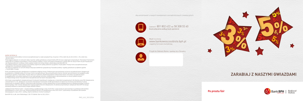 Aby porozmawiać o naszych rozwiązaniach oszczędnościowych i inwestycyjnych: 801 802 422 58 308 55 40 Zadzwoń: lub (koszt połączenia według taryfy operatora). Wejdź na stronę: www.bankowoscosobista.bph.pl i wypełnij formularz kontaktowy. Przyjdź do Oddziału Banku i spotkaj się z Doradcą. WAŻNE INFORMACJE: 1 Oprocentowanie dla środków na koncie oszczędnościowym w części powyżej 50 tys. zł wynosi 1,75% w skali roku do 18.12.2014 r., 1% w skali roku od 19.12.2014 r. 2 Przez pojęcie wpływów na rachunek należy rozumieć: wpłaty gotówkowe w kasach Banku BPH SA oraz w Agencjach Uniwersalnych i Placówkach Partnerskich Banku BPH SA, przelewy przychodzące z innych banków, przelewy z innych rachunków prowadzonych w Banku BPH SA, których Klient nie jest Posiadaczem lub Współposiadaczem, przelewy z tytułu wypłaty kredytu lub transzy kredytu udzielonego przez Bank BPH SA. 3 Za przelewy krajowe w walucie obcej oraz przelewy zagraniczne opłaty pobierane są zgodnie z Taryfą Opłat i Prowizji. Konto oszczędnościowe jest udostępniane na podstawie odrębnej Umowy. 4 Nie dotyczy przelewów na rachunki bieżące dotyczące działalności gospodarczej. Pozostałe przelewy i wypłaty gotówkowe są odpłatne zgodnie z Taryfą Opłat i Prowizji. Konto oszczędnościowe jest udostępniane na podstawie odrębnej Umowy. Preferencyjne oprocentowanie na koncie oszczędnościowym dostępne jest po podpisaniu w Oddziale aneksu do Umowy o konto oszczędnościowe. Oprocentowanie jest zmienne. Wartość oprocentowania nie uwzględnia opłat pobieranych zgodnie z Taryfą Opłat i Prowizji. Klient ma możliwość założenia/posiadania maksymalnie dwóch rachunków oszczędnościowych (z uwzględnieniem rachunków wspólnych), w tym tylko jednego rachunku z preferencyjnym oprocentowaniem w ramach pakietu korzyści do Maksymalnego Konta: Pracowite Konto Oszczędnościowe lub Sezam Oszczędzam Plus. ZARABIAJ Z NASZYMI GWIAZDAMI Informacje o poszczególnych ubezpieczeniowych funduszach kapitałowych znajdują się w materiałach przygotowanych dla Klientów przez PKO Ubezpieczenia i Generali Życie T.U. S.A., dostępnych na stronach internetowych towarzystw. Środki zgromadzone na lokacie są chronione przez Bankowy Fundusz Gwarancyjny na zasadach ogólnych. Natomiast środki finansowe z umowy ubezpieczenia na życie podlegają gwarancji Ubezpieczeniowego Funduszu Gwarancyjnego. Treść Umowy Ubezpieczenia regulują Ogólne Warunki Ubezpieczenia. W zakresie proponowanych ubezpieczeń Bank BPH SA stosuje standardy określone w rekomendacji Związku Banków Polskich. „Najlepsze konto Premium 2014” – laureat rankingu opublikowanego w dniu 24.03.2014 r. przez money.pl, opracowanego na podstawie ofert banków obowiązujących w marcu 2014 roku. Ranking bankier.pl dla kont VIP opublikowany w dniu 29.07.2014 r., opracowany na podstawie ofert banków obowiązujących w lipcu 2014 r. według „Raportu Bankier.pl o kontach osobistych”. Bank BPH SA, ul. płk. Jana Pałubickiego 2, 80-175 Gdańsk. Stan na 18.11.2014 r. PKO_ULK_18112014 Po prostu fair Chcesz skorzystać z atrakcyjnie oprocentowanego konta oszczędnościowego? Załóż konto osobiste – Maksymalne Konto oraz otwórz Pracowite Konto Oszczędnościowe z preferencyjnym oprocentowaniem dla posiadaczy Maksymalnego Konta. Wolisz konto czy lokatę? A może chcesz skorzystać z obu sposobów na zysk? ZARABIAJ 5% NA LOKACIE NA 6 MIESIĘCY Z JEDNORAZOWĄ INWESTYCJĄ W UBEZPIECZENIOWE FUNDUSZE KAPITAŁOWE LUB 3% NA KONCIE OSZCZĘDNOŚCIOWYM DLA ŚRODKÓW DO 50 TYS. ZŁ I Z MAKSYMALNYM KONTEM. KORZYŚCI Z POSIADANIA PRACOWITEGO KONTA OSZCZĘDNOŚCIOWEGO WRAZ Z MAKSYMALNYM KONTEM PRACOWITE KONTO OSZCZĘDNOŚCIOWE + MAKSYMALNE KONTO min. kwota do ulokowania: 1000 zł > brak opłaty za prowadzenie konta w danym miesiącu, jeśli > brak opłat za otwarcie i prowadzenie >wpłaty i wypłaty środków w dowolnym momencie, > brak opłat naliczanych przez Bank BPH za wypłatę gotówki kartą bez utraty naliczonych odsetek (przy wypłatach gotówkowych pobierana jest opłata zgodnie z Taryfą Opłat i Prowizji) >dwa przelewy w miesiącu bez opłat, jeżeli są realizowane na inne konto w Banku BPH, np. na Maksymalne Konto4 w poprzednim miesiącu kalendarzowym zapewnisz wpływy na rachunek w wysokości minimum 7500 zł. W przypadku braku wymaganych wpływów miesięczna opłata za prowadzenie konta wyniesie 14,99 zł (do 31.12.2014 r.), a od stycznia 2015 r. 19,99 zł Szukasz wyższego zysku i lubisz inwestować? Wybierz sześciomiesięczną lokatę 5% z jednorazową, bezterminową inwestycją w ubezpieczeniowe fundusze kapitałowe w formie ubezpieczenia na życie, z którą możesz budować własną strategię inwestycyjną i zwiększać szansę na zysk. 2 do konta ze wszystkich bankomatów w Polsce i na świecie >brak opłat za przelewy krajowe w złotych 3 wykonywane w Placówkach Banku, przez Internet lub telefon >pakiet usług Assistance: domowego, samochodowego i medycznego, a także ubezpieczenie w podróży oraz usługi concierge – bez dodatkowych opłat > indywidualna opieka Osobistego Doradcy Jeśli wolisz tradycyjne sposoby oszczędzania i stały zysk – otwórz Pracowite Konto Oszczędnościowe oraz konto osobiste – Maksymalne Konto. Zyskasz nie tylko atrakcyjne oprocentowanie środków do 50 tys. zł w wysokości 3% w skali roku1, ale także wiele dodatkowych korzyści związanych z posiadaniem Maksymalnego Konta, które w 2014 roku zostało laureatem wielu rankingów w kategorii kont prestiżowych i VIP. JAK DZIAŁA LOKATA 5% Z INWESTYCJĄ W UBEZPIECZENIOWY FUNDUSZ KAPITAŁOWY LOKATA 5% > preferencyjne oprocentowanie dla posiadaczy Maksymalnego Konta – 3% w skali roku dla środków w części do 50 tys. zł włącznie1 Lokata 5% z inwestycją składa się z rachunku terminowej lokaty oszczędnościowej na 6 miesięcy oraz indywidualnej umowy ubezpieczenia na życie z ubezpieczeniowym funduszem kapitałowym z wpłatą jedn
