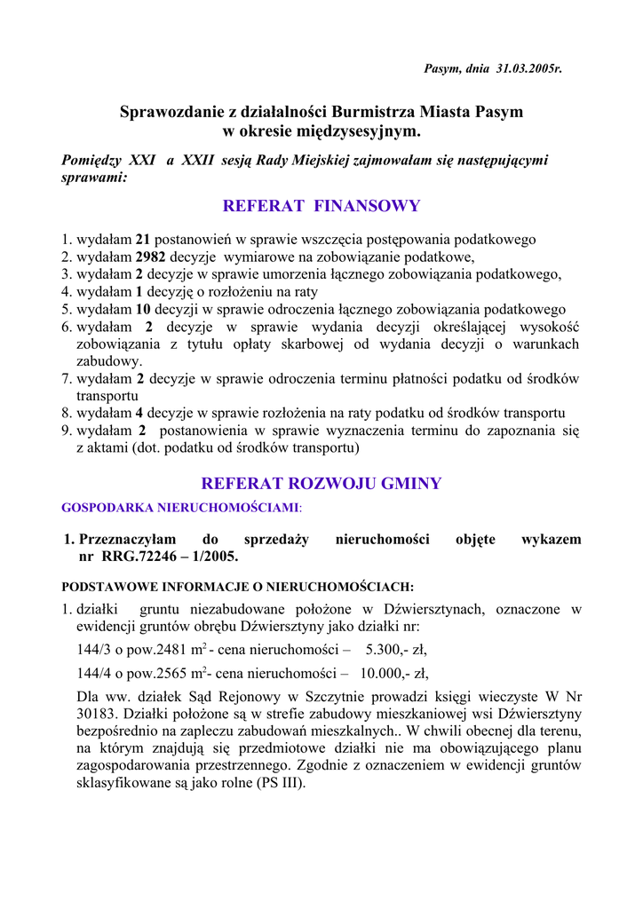 Pasym, dnia 31.03.2005r. Sprawozdanie z działalności Burmistrza Miasta Pasym w okresie międzysesyjnym. Pomiędzy XXI a XXII sesją Rady Miejskiej zajmowałam się następującymi sprawami: REFERAT FINANSOWY 1. wydałam 21 postanowień w sprawie wszczęcia postępowania podatkowego 2. wydałam 2982 decyzje wymiarowe na zobowiązanie podatkowe, 3. wydałam 2 decyzje w sprawie umorzenia łącznego zobowiązania podatkowego, 4. wydałam 1 decyzję o rozłożeniu na raty 5. wydałam 10 decyzji w sprawie odroczenia łącznego zobowiązania podatkowego 6. wydałam 2 decyzje w sprawie wydania decyzji określającej wysokość zobowiązania z tytułu opłaty skarbowej od wydania decyzji o warunkach zabudowy. 7. wydałam 2 decyzje w sprawie odroczenia terminu płatności podatku od środków transportu 8. wydałam 4 decyzje w sprawie rozłożenia na raty podatku od środków transportu 9. wydałam 2 postanowienia w sprawie wyznaczenia terminu do zapoznania się z aktami (dot. podatku od środków transportu) REFERAT ROZWOJU GMINY GOSPODARKA NIERUCHOMOŚCIAMI: 1. Przeznaczyłam do sprzedaży nr RRG.72246 – 1/2005. nieruchomości objęte wykazem PODSTAWOWE INFORMACJE O NIERUCHOMOŚCIACH: 1. działki gruntu niezabudowane położone w Dźwiersztynach, oznaczone w ewidencji gruntów obrębu Dźwiersztyny jako działki nr: 144/3 o pow.2481 m2 - cena nieruchomości – 5.300,- zł, 144/4 o pow.2565 m2- cena nieruchomości – 10.000,- zł, Dla ww. działek Sąd Rejonowy w Szczytnie prowadzi księgi wieczyste W Nr 30183. Działki położone są w strefie zabudowy mieszkaniowej wsi Dźwiersztyny bezpośrednio na zapleczu zabudowań mieszkalnych.. W chwili obecnej dla terenu, na którym znajdują się przedmiotowe działki nie ma obowiązującego planu zagospodarowania przestrzennego. Zgodnie z oznaczeniem w ewidencji gruntów sklasyfikowane są jako rolne (PS III). Na działce nr 144/4 istnieje możliwość wybudowania budynku mieszkalnego, po uzyskaniu decyzji o warunkach zabudowy. Sprzedaż jej nastąpi w trybie przetargu. Działka oznaczona nr 144/3 przeznaczona jest do zbycia na poprawienie warunków zagospodarowania nieruchomości przyległej oznaczonej nr 20/2. 2. Działka gruntu niezabudowana położona we wsi Łysa Góra, oznaczona w ewidencji gruntów obrębu Elganowo jako nr: 179/4 o pow. 209m2 – cena nieruchomości – 2.700,-zł, Sąd Rejonowy w Szczytnie dla ww. działki prowadzi księgę wieczystą KW Nr 30311. Powyższa działka położona jest w strefie rekreacyjnej wsi nad jeziorem Sasek Wielki. W chwili obecnej dla terenu, na którym znajduje się przedmiotowa działka nie ma obowiązującego planu zagospodarowania przestrzennego. Przedmiotowa działka przeznaczona jest do zbycia na poprawę warunków zagospodarowania nieruchomości przyległej zabudowanej budynkiem rekreacyjnym, oznaczonej nr ewidencyjnym działki 181/24. 3. Działka gruntu zabudowana budynkiem letniskowym położona w Pasymiu, oznaczona w ewidencji gruntów obrębu nr 1 miasta Pasym jako nr 283 o pow. 526 m2, będąca w użytkowaniu wieczystym Mariana i Danuty Nowickich. Budynek letniskowy stanowi odrębny od gruntu przedmiot własności Państwa Mariana i Danuty Nowickich. Sąd Rejonowy w Szczytnie dla ww. działki prowadzi księgę wieczystą KW Nr 15193. Wartość prawa własności działki wynosi – 13.276,-zł Wartość prawa wieczystego użytkowania działki wynosi – 8.884,-zł Opłata za przekształcenie prawa wieczystego użytkowania w prawo własności wynosi – 4.392,-zł Powyższa działka znajduje się w kompleksie działek położonych w sąsiedztwie ośrodka wypoczynkowego Kalwa, na obszarze przeznaczonym dotychczas na cele rekreacyjne. W chwili obecnej dla terenu, na którym znajdują się przedmiotowa działka nie ma obowiązującego planu zagospodarowania przestrzennego. Przedmiotowa działka przeznaczona jest do zbycia na rzecz użytkownika wieczystego. 4. Działki gruntu niezabudowane położone we wsi Leleszki gmina Pasym, oznaczone w ewidencji gruntów obrębu Leleszki jako nr: 162/1 o pow.1100 m2 – cena nieruchomości – 4.800,-zł 162/3 o pow. 100 m2 – cena nieruchomości – 300, zł Sąd Rejonowy w Szczytnie dla ww. działek prowadzi księgi wieczyste KW Nr: 30180, 28100. Działka oznaczona nr 162/1 położona jest na zapleczu zabudowań siedliska wiejskiego i przeznaczona jest na cele rolne. Działka oznaczona nr 162/3 stanowi drogę dojazdową do działki nr 162/1. Obecnie droga ta nie jest urządzona (obszar użytkowany jest na cele siedliskowe), została jedynie wytyczona geodezyjnie w terenie. W chwili obecnej dla terenu, na którym znajdują się przedmiotowe działki nie ma obowiązującego planu zagospodarowania przestrzennego. Przedmiotowe działki przeznaczone są do zbycia na poprawienie warunków zagospodarowania nieruchomości przyległej. 2. DOKONAŁAM SPRZEDAŻY NIERUCHOMOŚCI : Działki gruntu położonej w Pasymiu przy zbiegu ulic Sportowej i Tadeusza Kościuszki, oznaczonej nr geodezyjnym 28/2 o pow. 3206 m2 w trybie przetargu, za cenę 48.500,-zł Rozpatrzyłam 1 warunkową umowę notarialną na sprzedaż nieruchomości położonej w Leleszkach. Nie skorzystałam z prawa pierwokupu. 4. PODZIAŁY I ROZGRANICZENIA Wydałam 1 decyzję zatwierdzającą podział nieruchomości położonej w Pasymiu, stanowiącej własność Państwa Aleksandry i Bogdana Rudzińskich. PLANOWANIE PRZESTRZENNE I INWESTYCJE INWESTYCJE 1. opracowany został projekt budowlany na przebudowę budynku po szkole w Grzegrzółkach na lokale socjalne, 14.03.2005r. złożyłam wniosek do Starostwa Powiatowego w Szczytnie o wydanie pozwolenia na budowę. 2. rozpoczęłam opracowanie specyfikacji istotnych warunków zamówienia na budowę sieci wodociągowej z pompownią Pasym- Grzegrzółki- Elganowo Wydałam: 2 decyzje ustalające wysokość opłaty z tytułu wzrostu wartości nieruchomości po uchwaleniu miejscowych planów zagospodarowania przestrzennego. Wysokość opłat wynosi 9 990 zł . 2