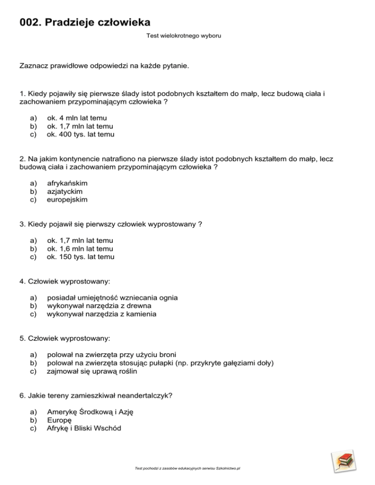 002. Pradzieje człowieka Test wielokrotnego wyboru Zaznacz prawidłowe odpowiedzi na każde pytanie. 1. Kiedy pojawiły się pierwsze ślady istot podobnych kształtem do małp, lecz budową ciała i zachowaniem przypominającym człowieka ? a) b) c) ok. 4 mln lat temu ok. 1,7 mln lat temu ok. 400 tys. lat temu 2. Na jakim kontynencie natrafiono na pierwsze ślady istot podobnych kształtem do małp, lecz budową ciała i zachowaniem przypominającym człowieka ? a) b) c) afrykańskim azjatyckim europejskim 3. Kiedy pojawił się pierwszy człowiek wyprostowany ? a) b) c) ok. 1,7 mln lat temu ok. 1,6 mln lat temu ok. 150 tys. lat temu 4. Człowiek wyprostowany: a) b) c) posiadał umiejętność wzniecania ognia wykonywał narzędzia z drewna wykonywał narzędzia z kamienia 5. Człowiek wyprostowany: a) b) c) polował na zwierzęta przy użyciu broni polował na zwierzęta stosując pułapki (np. przykryte gałęziami doły) zajmował się uprawą roślin 6. Jakie tereny zamieszkiwał neandertalczyk? a) b) c) Amerykę Środkową i Azję Europę Afrykę i Bliski Wschód Test pochodzi z zasobów edukacyjnych serwisu Szkolnictwo.pl 7. Neandertalczyk: a) b) c) posiadł umiejętność rozniecania ognia prowadził życie stadne chował członków grupy w grobach 8. Kiedy pojawił się neandertalczyk? a) b) c) ok. 1 mln lat temu ok. 400 tys. lat temu ok. 150 tys. lat temu 9. Neandertalczyk: a) b) c) stosował zapory rzeczne jako pierwszy zaczął stosować pułapki podczas polowania mierzył ok. 165 cm. wzrostu 10. Co oznacza słowo homo sapiens: a) b) c) człowiek właściwy człowiek wyprostowany człowiek rozumny 11. Homo sapiens: a) b) c) zajmował się uprawą roślinności utrzymywał się głównie z polowania polował na mamuty 12. Homo sapiens: a) b) c) posługiwał się łukiem posiadał umiejętność wytapiania metali zamieszkiwał jaskinie 13. Homo sapiens: a) b) c) jako pierwszy zaczął stosować broń podczas polowania pozostawił po sobie malowidła naskalne zajmował się połowem ryb 14. Homo sapiens: a) b) potrafił oswajać zwierzęta zajmował się hodowlą Test pochodzi z zasobów edukacyjnych serwisu Szkolnictwo.pl c) prowadził półosiadły tryb życia 15. Homo sapiens: a) b) c) nie prowadził osiadłego trybu życia prowadził stadne życie gromadził i przechowywał żywność 16. Przejście z półosiadłego w osiadły trybu życia: a) b) c) spowodowało rozwój budownictwa wymusiło na ludziach gromadzenie żywności było jedną z przyczyn bogacenia się niektórych osób w grupie 17. Kiedy powstały pierwsze osady ? a) b) c) ok. 150 tys. lat temu ok. 45 tys. lat temu ok. 7000 lat temu 18. Osiadły tryb życia: a) b) c) przyczynił się do rozwoju technik upraw spowodował wprowadzenie koczowniczego trybu życia był przyczyną wzrostu liczby ludności 19. Kiedy poznano technikę wytopu metali ? a) b) c) ok. 45 tys. lat temu ok 15 tys. lat temu ok. 8000 lat temu 20. Mieszkańcy jakich terenów, jako jedni z pierwszych poznali technikę wytopu metali ? a) b) c) Dalekiego Wschodu Kaukazu Morza Egejskiego 21. Która umiejętność najbardziej zrewolucjonizowała życie człowieka ? a) b) c) obróbka kamienia obróbka żelaza produkcja brązu 22. Kiedy w Europie poznano technikę wytapiania brązu ? Test pochodzi z zasobów edukacyjnych serwisu Szkolnictwo.pl a) b) c) ok. 6000 lat temu ok. 3000 lat p.n.e. ok. 3000 lat temu 23. Która z epok przyniosła początki metalurgii ? a) b) c) epoka kamienia epoka żelaza epoka brązu 24. Co przyczyniło się do powstawania pierwszych państw ? a) b) c) osiadły tryb życia pojawienie się wodzów wojny między plemionami 25. W której epoce rzemieślnicy przestali zajmować się rolnictwem ? a) b) c) w epoce kamienia w epoce brązu w epoce żelaza Test pochodzi z zasobów edukacyjnych serwisu Szkolnictwo.pl