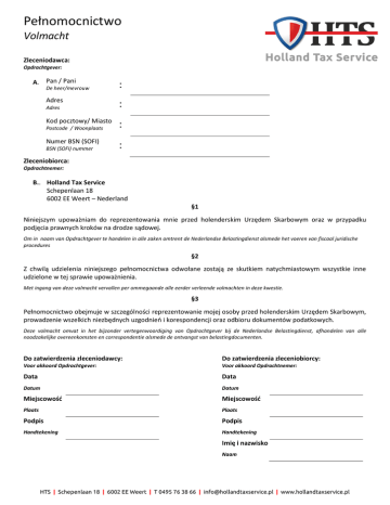 Pełnomocnictwo Volmacht Zleceniodawca: Opdrachtgever: A. Pan / Pani : Adres : De heer/mevrouw Adres Kod pocztowy/ Miasto Postcode / Woonplaats Numer BSN (SOFI) BSN (SOFI) nummer : : Zleceniobiorca: Opdrachtnemer: B.. Holland Tax Service Schepenlaan 18 6002 EE Weert – Nederland §1 Niniejszym upoważniam do reprezentowania mnie przed holenderskim Urzędem Skarbowym oraz w przypadku podjęcia prawnych kroków na drodze sądowej. Om in naam van Opdrachtgever te handelen in alle zaken omtrent de Nederlandse Belastingdienst alsmede het voeren van fiscaal juridische procedures §2 Z chwilą udzielenia niniejszego pełnomocnictwa odwołane zostają ze skutkiem natychmiastowym wszystkie inne udzielone w tej sprawie upoważnienia. Met ingang van deze volmacht vervallen per ommegaande alle eerder verleende volmachten in deze kwestie. §3 Pełnomocnictwo obejmuje w szczególności reprezentowanie mojej osoby przed holenderskim Urzędem Skarbowym, prowadzenie wszelkich niezbędnych uzgodnień i korespondencji oraz odbioru dokumentów podatkowych. Deze volmacht omvat in het bijzonder vertegenwoordiging van Opdrachtgever bij de Nederlandse Belastingdienst, afhandelen van alle noodzakelijke overeenkomsten en correspondentie alsmede de ontvangst van belastingdocumenten. Do zatwierdzenia zleceniodawcy: Do zatwierdzenia zleceniobiorcy: Voor akkoord Opdrachtgever: Voor akkoord Opdrachtnemer: Data Data Datum Datum Miejscowość Miejscowość Plaats Plaats Podpis Podpis Handtekening Handtekening Imię i nazwisko Naam HTS | Schepenlaan 18 | 6002 EE Weert | T 0495 76 38 66 | [email protected] | www.hollandtaxservice.pl