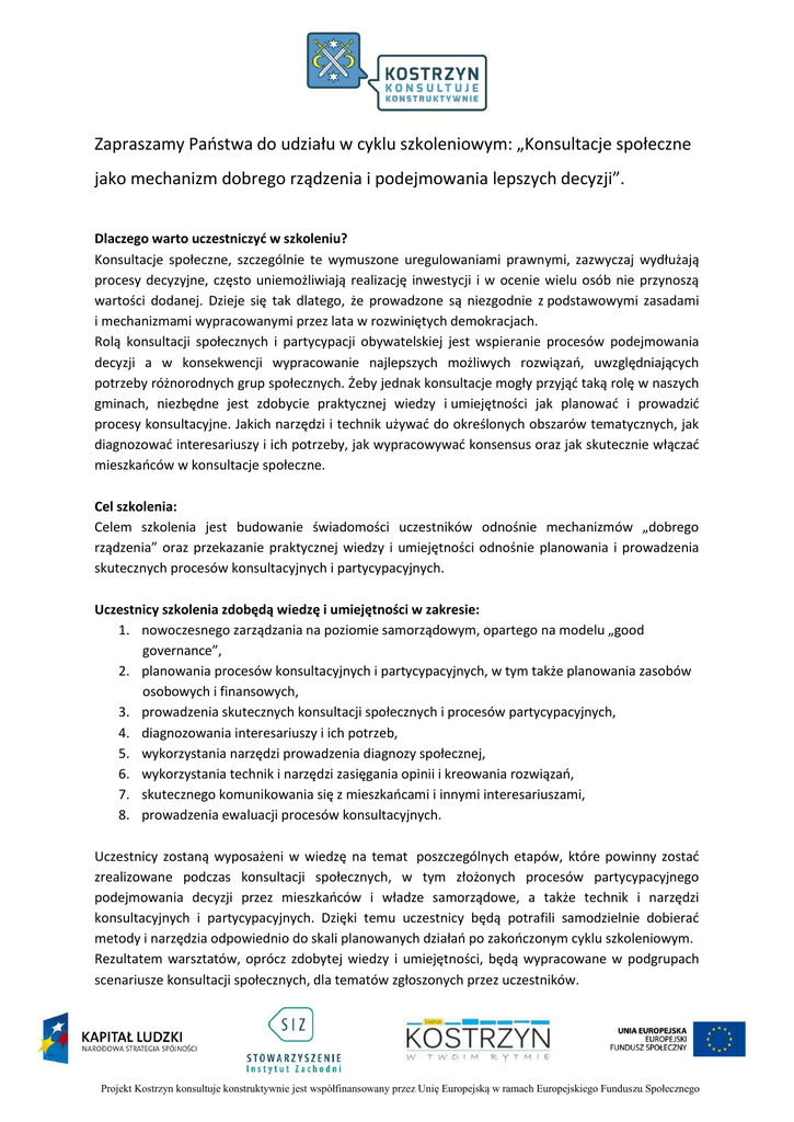 Zapraszamy Państwa do udziału w cyklu szkoleniowym: „Konsultacje społeczne jako mechanizm dobrego rządzenia i podejmowania lepszych decyzji”. Dlaczego warto uczestniczyć w szkoleniu? Konsultacje społeczne, szczególnie te wymuszone uregulowaniami prawnymi, zazwyczaj wydłużają procesy decyzyjne, często uniemożliwiają realizację inwestycji i w ocenie wielu osób nie przynoszą wartości dodanej. Dzieje się tak dlatego, że prowadzone są niezgodnie z podstawowymi zasadami i mechanizmami wypracowanymi przez lata w rozwiniętych demokracjach. Rolą konsultacji społecznych i partycypacji obywatelskiej jest wspieranie procesów podejmowania decyzji a w konsekwencji wypracowanie najlepszych możliwych rozwiązań, uwzględniających potrzeby różnorodnych grup społecznych. Żeby jednak konsultacje mogły przyjąć taką rolę w naszych gminach, niezbędne jest zdobycie praktycznej wiedzy i umiejętności jak planować i prowadzić procesy konsultacyjne. Jakich narzędzi i technik używać do określonych obszarów tematycznych, jak diagnozować interesariuszy i ich potrzeby, jak wypracowywać konsensus oraz jak skutecznie włączać mieszkańców w konsultacje społeczne. Cel szkolenia: Celem szkolenia jest budowanie świadomości uczestników odnośnie mechanizmów „dobrego rządzenia” oraz przekazanie praktycznej wiedzy i umiejętności odnośnie planowania i prowadzenia skutecznych procesów konsultacyjnych i partycypacyjnych. Uczestnicy szkolenia zdobędą wiedzę i umiejętności w zakresie: 1. nowoczesnego zarządzania na poziomie samorządowym, opartego na modelu „good governance”, 2. planowania procesów konsultacyjnych i partycypacyjnych, w tym także planowania zasobów osobowych i finansowych, 3. prowadzenia skutecznych konsultacji społecznych i procesów partycypacyjnych, 4. diagnozowania interesariuszy i ich potrzeb, 5. wykorzystania narzędzi prowadzenia diagnozy społecznej, 6. wykorzystania technik i narzędzi zasięgania opinii i kreowania rozwiązań, 7. skutecznego komunikowania się z mieszkańcami i innymi interesariuszami, 8. prowadzenia ewaluacji procesów konsultacyjnych. Uczestnicy zostaną wyposażeni w wiedzę na temat poszczególnych etapów, które powinny zostać zrealizowane podczas konsultacji społecznych, w tym złożonych procesów partycypacyjnego podejmowania decyzji przez mieszkańców i władze samorządowe, a także technik i narzędzi konsultacyjnych i partycypacyjnych. Dzięki temu uczestnicy będą potrafili samodzielnie dobierać metody i narzędzia odpowiednio do skali planowanych działań po zakończonym cyklu szkoleniowym. Rezultatem warsztatów, oprócz zdobytej wiedzy i umiejętności, będą wypracowane w podgrupach scenariusze konsultacji społecznych, dla tematów zgłoszonych przez uczestników. Projekt Kostrzyn konsultuje konstruktywnie jest współfinansowany przez Unię Europejską w ramach Europejskiego Funduszu Społecznego Scenariusz warsztatów Warsztaty opierać się będą na połączeniu teorii konsultacji społecznych z praktycznym, równoległym zastosowaniem metodologii konsultacji i technik partycypacyjnych. Uczestniczki i uczestnicy warsztatów będą mogli poznać w praktyce i przetestować poszczególne narzędzia. Warsztaty zostały podzielone na 3 dwudniowe moduły. Każdy moduł będzie składać się z części teoretycznej, zaprezentowanej w praktycznej i ciekawej formie oraz pracy warsztatowej w podgrupach. Uczestnicy będą poznawać narzędzia i techniki konsultacyjne w praktyce na przygotowanych przykładach. Moduł I Podczas tego modułu uczestnicy dowiedzą się jakie jest znaczenie i rola konsultacji w rozwijających się demokracjach, jak wyglądają procesy partycypacyjne i konsultacyjne, z jakich składają się etapów. Szczegółowo omówiony zostanie etap Diagnozy, Komunikacji i Ewaluacji. W podgrupach zostaną przygotowane scenariusze Moduł II Podczas tego modułu uczestnicy dowiedzą się szczegółowo jak zaplanować i przeprowadzić etap Zasięgania opinii oraz Informacji zwrotnej. Przetestują kilka technik konsultacyjnych w praktyce oraz przygotują scenariusze dla wybranych tematów w omawianych etapach procesów konsultacyjnych. Zaprezentowane zostaną najczęściej popełniane błędy w konsultacjach społecznych. Moduł III Podczas tego modułu uczestnicy dowiedzą się jak planować zasoby osobowe, materialne i finansowe procesów konsultacyjnych, jakie regulacje prawne wymuszają konsultacje społeczne i dlaczego, jakie zasady obowiązują w konsultacjach. Przedstawione zostaną dobre praktyki z Polski i ze świata w zakresie procesów konsultacyjnych i partycypacyjnych oraz dodatkowo jak budować strategie rozwoju gmin razem z mieszkańcami. W podgrupach uczestnicy przygotują scenariusze dla wybranych tematów w zakresie planowania zasobów. Szkolenia będą odbywały się w Leśnym Ośrodku Szkoleniowym w Puszczykowie, w terminach: I moduł - 25-26 kwietnia 2014 r. II moduł - 16-17 maja 2014 r. III moduł - 06-07 czerwca 2014 r. Projekt Kostrzyn konsultuje konstruktywnie jest współfinansowany przez Unię Europejską w ramach Europejskiego Funduszu Społecznego Ramowy harmonogram jednego zjazdu w ramach szkolenia: Dzień I 10.00 – 11.30 zajęcia 11.30 – 11.45 przerwa kawowa 11.45 – 13.00 zajęcia 13.00 – 14.30 przerwa obiadowa 14.30 – 16.00 zajęcia 16.00 – 16.15 przerwa kawowa 16.15 – 18.30 zajęcia 19.00 … kolacja Dzień II 8.00 – 9.00 śniadanie 9.00 – 10.30 zajęcia 10.30 – 10.45 przerwa kawowa 10.45 – 12.15 zajęcia 12.15 – 12.30 przerwa kawowa 12.30 – 14.00 zajęcia 14.00 … obiad i zakończenie warsztatów Informacja o organizacji prowadzącej szkolenie: Pracownia Zrównoważonego Rozwoju (PZR) to organizacja pozarządowa (fundacja), której misją jest wspieranie samorządów i biznesu w zarządzaniu strategicznym, którego podstawą jest zrównoważony rozwój i społeczna odpowiedzialność. Fundacja realizuje projekty ba