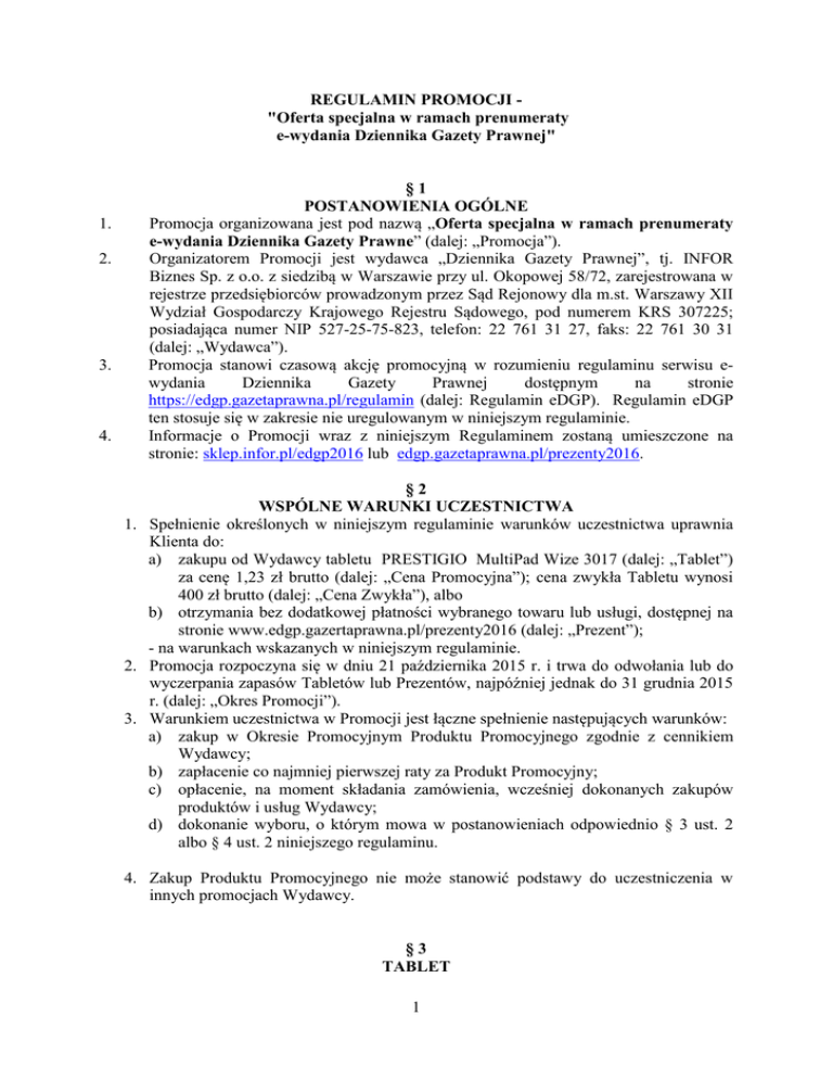 REGULAMIN PROMOCJI "Oferta specjalna w ramach prenumeraty e-wydania Dziennika Gazety Prawnej" 1. 2. 3. 4. §1 POSTANOWIENIA OGÓLNE Promocja organizowana jest pod nazwą „Oferta specjalna w ramach prenumeraty e-wydania Dziennika Gazety Prawne” (dalej: „Promocja”). Organizatorem Promocji jest wydawca „Dziennika Gazety Prawnej”, tj. INFOR Biznes Sp. z o.o. z siedzibą w Warszawie przy ul. Okopowej 58/72, zarejestrowana w rejestrze przedsiębiorców prowadzonym przez Sąd Rejonowy dla m.st. Warszawy XII Wydział Gospodarczy Krajowego Rejestru Sądowego, pod numerem KRS 307225; posiadająca numer NIP 527-25-75-823, telefon: 22 761 31 27, faks: 22 761 30 31 (dalej: „Wydawca”). Promocja stanowi czasową akcję promocyjną w rozumieniu regulaminu serwisu ewydania Dziennika Gazety Prawnej dostępnym na stronie https://edgp.gazetaprawna.pl/regulamin (dalej: Regulamin eDGP). Regulamin eDGP ten stosuje się w zakresie nie uregulowanym w niniejszym regulaminie. Informacje o Promocji wraz z niniejszym Regulaminem zostaną umieszczone na stronie: sklep.infor.pl/edgp2016 lub edgp.gazetaprawna.pl/prezenty2016. §2 WSPÓLNE WARUNKI UCZESTNICTWA 1. Spełnienie określonych w niniejszym regulaminie warunków uczestnictwa uprawnia Klienta do: a) zakupu od Wydawcy tabletu PRESTIGIO MultiPad Wize 3017 (dalej: „Tablet”) za cenę 1,23 zł brutto (dalej: „Cena Promocyjna”); cena zwykła Tabletu wynosi 400 zł brutto (dalej: „Cena Zwykła”), albo b) otrzymania bez dodatkowej płatności wybranego towaru lub usługi, dostępnej na stronie www.edgp.gazertaprawna.pl/prezenty2016 (dalej: „Prezent”); - na warunkach wskazanych w niniejszym regulaminie. 2. Promocja rozpoczyna się w dniu 21 października 2015 r. i trwa do odwołania lub do wyczerpania zapasów Tabletów lub Prezentów, najpóźniej jednak do 31 grudnia 2015 r. (dalej: „Okres Promocji”). 3. Warunkiem uczestnictwa w Promocji jest łączne spełnienie następujących warunków: a) zakup w Okresie Promocyjnym Produktu Promocyjnego zgodnie z cennikiem Wydawcy; b) zapłacenie co najmniej pierwszej raty za Produkt Promocyjny; c) opłacenie, na moment składania zamówienia, wcześniej dokonanych zakupów produktów i usług Wydawcy; d) dokonanie wyboru, o którym mowa w postanowieniach odpowiednio § 3 ust. 2 albo § 4 ust. 2 niniejszego regulaminu. 4. Zakup Produktu Promocyjnego nie może stanowić podstawy do uczestniczenia w innych promocjach Wydawcy. §3 TABLET 1 1. 2. 3. 1. 2. 3. 4. 1. 2. 3. 4. Produktem Promocyjnym w rozumieniu niniejszego paragrafu jest pełna prenumerata na 18 miesięcy na pełnopłatne elektroniczne wydanie „Dziennika Gazety Prawnej”. Dodatkowym warunkiem skorzystania z Promocji w zakresie Tabletu jest zadeklarowanie na stronie www.edgp.gazetaprawna.pl/prezenty2016 lub sklep.infor.pl/edgp2016 chęci zakupu Tabletu za Cenę Promocyjną. W przypadku nie dojścia do skutku, wygaśnięcia lub odstąpienia od umowy o prenumeratę, klient jest zobowiązany do zwrotu Tabletu Wydawcy, zaś Wydawca jest zobowiązany do zwrotu klientowi uiszczonej przez niego ceny za Tablet. Jeżeli jednak Wydawca odstąpił od umowy z powodu zwłoki klienta w płatności, klient jest zobowiązany do zapłaty różnicy między Ceną Promocyjną a Ceną Zwykłą Tabletu. §4 PREZENTY Produktem Promocyjnym w rozumieniu niniejszego paragrafu jest pełna prenumerata na 12 miesięcy na pełnopłatne elektroniczne wydanie „Dziennika Gazety Prawnej”. Dodatkowym warunkiem skorzystania z Promocji w zakresie Prezentu jest zadeklarowanie na stronie www.edgp.gazetaprawna.pl/prezenty2016 lub sklep.infor.pl/edgp2016 chęci odbioru wybranego Prezentu. W przypadku nie dojścia do skutku, wygaśnięcia lub odstąpienia od umowy o prenumeratę, klient jest zobowiązany do zwrotu Prezentu Wydawcy. Wybrane prezenty prenumeratorzy otrzymają pocztą w ciągu 30 dni od zaksięgowania wpłaty za prenumeratę u Wydawcy. §5 REKLAMACJA I GWARANCJA ODNOŚNIE TABLETU Tablet zostanie wysłany pocztą w ciągu 30 dni od daty zaksięgowania wpłaty za prenumeratę u Wydawcy. Po otrzymaniu przesyłki klient winien dokładnie sprawdzić paczkę i otrzymany Tablet i o ewentualnych usterkach niezwłocznie poinformować Wydawcę. Jeżeli otrzymany tablet transportu posiada wady, Prenumerator powinien zgłosić usterkę za pośrednictwem infolini tzw. Biuro Obsługi Klienta PRESTIGIO , z której może korzystać za pomocą bezpłatnego numeru 00800-491-1662. Połączenia są bezpłatne z telefonów stacjonarnych, ale możliwe jest naliczanie opłat przez operatorów sieci komórkowych. Dostępny jest także numer (+48)-22116-8076; opłata naliczana jest zgodnie z taryfą operatora. Więcej informacji na ten temat można uzyskać pod adresem strony internetowej: http://www.prestigio.pl/support. Reklamacje gwarancyjne produktów marki PRESTIGIO , będą realizowane przez firmę FIXIT w systemie „doorto-door”. Pełna informację na temat zasad działania sytemu door-to-door można otrzymać pod adresem strony internetowej: http://www.asbis.pl/door-to-door.cfm We wszelkich sprawach związanych z rękojmią Tabletów lub Prezentów , klient może się kontaktować z Działem Obsługi Klienta INFOR PL S.A. wskazanym w § 1 ust. 2 Regulaminu eDGP. Gwarancji na Tablety udziela firma FIXIT na warunkach przez niego określonych. W sprawach związanych z gwarancją Tabletów, klient powinien zgłosić się do Biura Obsługi Klienta PRESTIGIO, telefonicznie za pomocą numeru 00800-491-1662 (bezpłatne z telefonów stacjonarnych) lub numeru (+48) 22116-8076 (opłata naliczana 2 zgodnie z taryfą operatora). Więcej informacji na ten temat można uzyskać pod adresem strony internetowej: http://www.prestigio.pl/support. 3