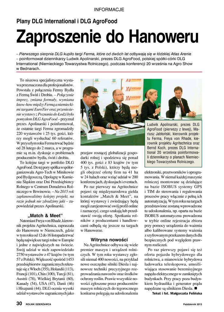 informacje Plany DLG International i DLG AgroFood Zaproszenie do Hanoweru – Pierwszego sierpnia DLG kupiło targi Ferma, które od dwóch lat odbywają się w łódzkiej Atlas Arenie – poinformował dziennikarzy Ludwik Apolinarski, prezes DLG AgroFood, polskiej spółki-córki DLG International (Niemieckiego Towarzystwa Rolniczego), podczas konferencji 20 września na Agro Show w Bednarach. To niszowa specjalistyczna wystawa przeznaczona dla profesjonalistów. Powstała z połączenia Fermy Bydła z Fermą Świń i Drobiu. – Połączenie imprez, zmiana formuły, wymiana know-how między Fermą a niemieckimi targami EuroTier oraz przeniesienie wystawy z Poznania do Łodzi było pomysłem DLG AgroFood – przyznał prezes Apolinarski i poinformował, że ostatnie targi Ferma zgromadziły 220 wystawców i 25 tys. gości, którzy mogli wysłuchać 60 referatów. W przyszłym roku Ferma trwać będzie od 28 lutego do 2 marca, a w programie są m.in. dyskusje o problemach producentów bydła, świń i drobiu. To kolejne targi w portfolio DLG AgroFood. Do tej pory spółka współorganizowała Agro-Tech w Minikowie pod Bydgoszczą, Opolagrę w Kamieniu Śląskim oraz Dni Przedsiębiorcy Rolnego w Centrum Doradztwa Rolniczego w Brwinowie. – Na 2015 rok zaplanowaliśmy kolejny projekt, na razie jednak nie zdradzimy jaki – zapowiedział prezes Apolinarski. „Match & Meet” Natomiast Freya von Rhade, kierownik projektu Agritechnica, zapraszała do Hanoweru w Niemczech, gdzie w tym roku od 12 do 16 listopada trwać będą największe targi rolne w Europie i jedne z największych na świecie. Swój udział w nich zapowiedziało 2750 wystawców z 47 krajów (w tym 57 z Polski). Większość spośród 1453 przedsiębiorstw zagranicznych rekrutuje się z Włoch (355), Holandii (113), Francji (101), Chin (100), Turcji (81), Austrii (78), Wielkiej Brytanii (60), Kanady (54), USA (47), Danii (46) i Hiszpanii (44). DLG ocenia wysoki udział wystawców zagranicznych jako 30 ROLNIK DZIERŻAWCA przejaw rosnącej globalizacji gospodarki rolnej i spodziewa się ponad 400 tys. gości z 83 krajów (w tym 5 tys. z Polski), którzy będą mogli obejrzeć ofertę firm na 41 ha w 24 halach oraz wziąć udział w 200 konferencjach, dyskusjach i eventach. Po raz pierwszy na Agritechnice pojawi się międzynarodowa giełda kontaktów „Match & Meet”, na której wystawcy i zwiedzający będą mogli zarejestrować swój profil online i zaznaczyć, czego szukają lub przedstawić swoją ofertę. Spotkania rolników z producentami i handlowcami odbędą się jeszcze na targach w Hanowerze. Witryna nowości Na Agritechnice odbywa się wiele premier maszyn i urządzeń rolniczych. W tym roku wystawcy zgłosili niemal 400 nowości, na przykład nowe oszczędne silniki Diesla i najnowsze techniki precyzyjnego rozprowadzania nawozów oraz środków ochrony roślin. Prawie wszystkie nowości zgłoszone przez producentów maszyn rolniczych do tegorocznego konkursu polegają na udoskonaleniu Ludwik Apolinarski, prezes DLG AgroFood (pierwszy z lewej), Mariusz Jabłoński, kierownik projektu Ferma, Freya von Rhade, kierownik projektu Agritechnica oraz Bernd Koch, prezes DLG International 20 września poinformowali dziennikarzy o planach Niemieckiego Towarzystwa Rolniczego. elektroniki, przetworników i oprogramowania. W niemal każdej maszynie rolniczej montowane są działające na bazie ISOBUS systemy GPS i TIM do sterowania i regulowania procesów pracy włącznie z pełną ich automatyzacją. W tym roku na targach przedstawione zostaną wprowadzone tu udoskonalenia, np. oparta na bazie ISOBUS automatyczna prowadzona w trybie online rejestracja zbioru przy pomocy urządzenia do ważenia albo kalibrowane systemy ważenia z szyfrowanym przekazem danych dla bezpiecznych pod względem prawnym rozliczeń. Po raz pierwszy pojawi się też oferta pojazdu hybrydowego dla rolnictwa, a mianowicie hybrydowa ładowarka teleskopowa, umożliwiająca stosowanie bezemisyjnego napędu elektrycznego w zamkniętych budynkach. Przy pracy poza budynkiem hydraulika i generator prądu napędzane są silnikiem Diesla. n Tekst i fot. Małgorzata Felińska Październik 2013