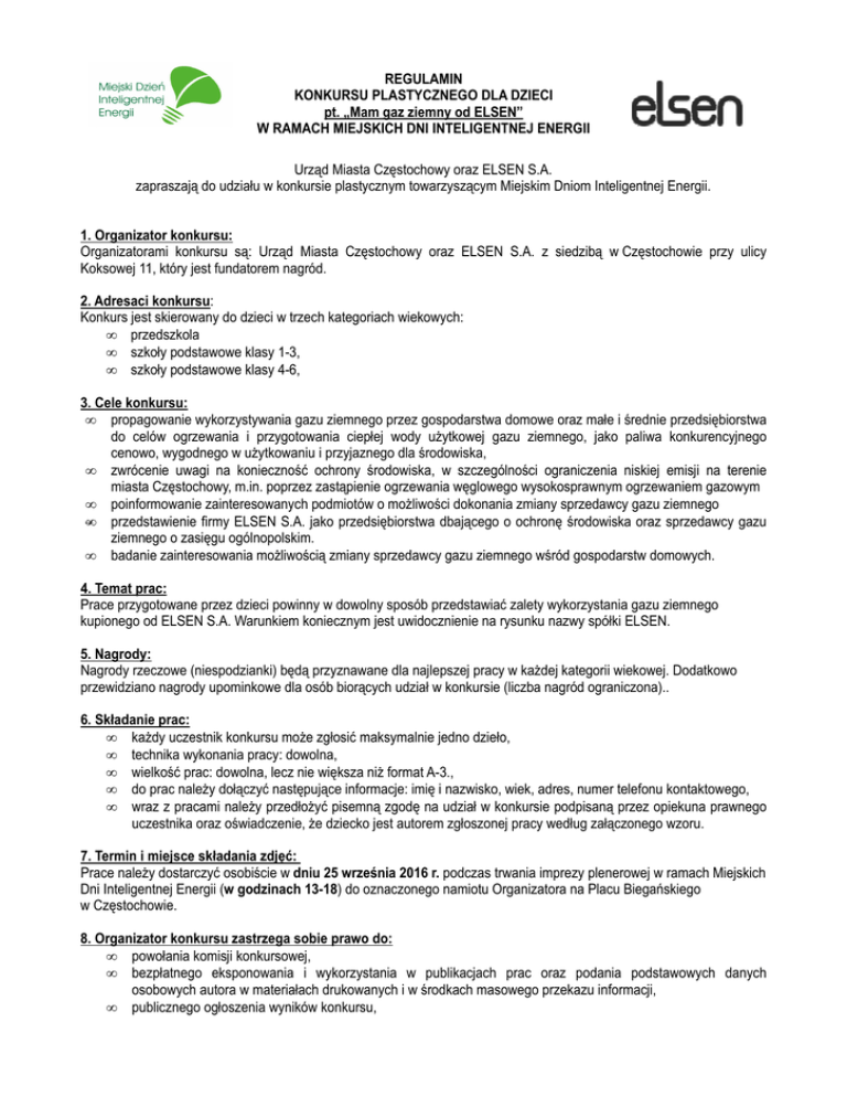 REGULAMIN KONKURSU PLASTYCZNEGO DLA DZIECI pt. „Mam gaz ziemny od ELSEN” W RAMACH MIEJSKICH DNI INTELIGENTNEJ ENERGII Urząd Miasta Częstochowy oraz ELSEN S.A. zapraszają do udziału w konkursie plastycznym towarzyszącym Miejskim Dniom Inteligentnej Energii. 1. Organizator konkursu: Organizatorami konkursu są: Urząd Miasta Częstochowy oraz ELSEN S.A. z siedzibą w Częstochowie przy ulicy Koksowej 11, który jest fundatorem nagród. 2. Adresaci konkursu: Konkurs jest skierowany do dzieci w trzech kategoriach wiekowych: • przedszkola • szkoły podstawowe klasy 1-3, • szkoły podstawowe klasy 4-6, 3. Cele konkursu: • propagowanie wykorzystywania gazu ziemnego przez gospodarstwa domowe oraz małe i średnie przedsiębiorstwa do celów ogrzewania i przygotowania ciepłej wody użytkowej gazu ziemnego, jako paliwa konkurencyjnego cenowo, wygodnego w użytkowaniu i przyjaznego dla środowiska, • zwrócenie uwagi na konieczność ochrony środowiska, w szczególności ograniczenia niskiej emisji na terenie miasta Częstochowy, m.in. poprzez zastąpienie ogrzewania węglowego wysokosprawnym ogrzewaniem gazowym • poinformowanie zainteresowanych podmiotów o możliwości dokonania zmiany sprzedawcy gazu ziemnego • przedstawienie firmy ELSEN S.A. jako przedsiębiorstwa dbającego o ochronę środowiska oraz sprzedawcy gazu ziemnego o zasięgu ogólnopolskim. • badanie zainteresowania możliwością zmiany sprzedawcy gazu ziemnego wśród gospodarstw domowych. 4. Temat prac: Prace przygotowane przez dzieci powinny w dowolny sposób przedstawiać zalety wykorzystania gazu ziemnego kupionego od ELSEN S.A. Warunkiem koniecznym jest uwidocznienie na rysunku nazwy spółki ELSEN. 5. Nagrody: Nagrody rzeczowe (niespodzianki) będą przyznawane dla najlepszej pracy w każdej kategorii wiekowej. Dodatkowo przewidziano nagrody upominkowe dla osób biorących udział w konkursie (liczba nagród ograniczona).. 6. Składanie prac: • każdy uczestnik konkursu może zgłosić maksymalnie jedno dzieło, • technika wykonania pracy: dowolna, • wielkość prac: dowolna, lecz nie większa niż format A-3., • do prac należy dołączyć następujące informacje: imię i nazwisko, wiek, adres, numer telefonu kontaktowego, • wraz z pracami należy przedłożyć pisemną zgodę na udział w konkursie podpisaną przez opiekuna prawnego uczestnika oraz oświadczenie, że dziecko jest autorem zgłoszonej pracy według załączonego wzoru. 7. Termin i miejsce składania zdjęć: Prace należy dostarczyć osobiście w dniu 25 września 2016 r. podczas trwania imprezy plenerowej w ramach Miejskich Dni Inteligentnej Energii (w godzinach 13-18) do oznaczonego namiotu Organizatora na Placu Biegańskiego w Częstochowie. 8. Organizator konkursu zastrzega sobie prawo do: • powołania komisji konkursowej, • bezpłatnego eksponowania i wykorzystania w publikacjach prac oraz podania podstawowych danych osobowych autora w materiałach drukowanych i w środkach masowego przekazu informacji, • publicznego ogłoszenia wyników konkursu, • • • • • dokonywania zmian w terminarzu konkursu, dowolnego podziału nagród, dowolnej interpretacji prac, werdykt komisji konkursowej jest ostateczny i nie podlega odwołaniu, zgłoszone do konkursu prace przechodzą na własność organizatora. 9. Termin rozstrzygnięcia konkursu i wręczenia nagród: Nagrodzone zostaną najlepsze, zdaniem Organizatora, prace w każdej kategorii wiekowej. Dodatkowo, dla pierwszych 15 osób (w każdej kategorii wiekowej), które zgłoszą swoje prace na konkurs w miejscu i terminie określonym w pkt 7 niniejszego Regulaminu przewidziano nagrody upominkowe. Organizator ogłosi wyniki konkursu na stronach internetowych www.czestochowa.pl oraz www.elsen.pl oraz poinformuje zwycięzców telefonicznie o miejscu i terminie wręczenia nagród głównych. 10. Nagrody i wyróżnienia dla laureatów zostały ufundowane przez ELSEN S.A. 11. Nadesłanie prac jest jednoznaczne z akceptacją niniejszego regulaminu. 12. Ostateczna interpretacja zapisów regulaminu należy do Organizatora konkursu. 13. Informacje o regulaminie: Niniejszy regulamin jest dostępny w wersji elektronicznej na stronach internetowych: http://www.czestochowa.pl, http://www.elsen.pl oraz http://www.czestochowa.energiaisrodowisko.pl Załącznik do regulaminu konkursu plastycznego dla dzieci pt. „Mam gaz ziemny od ELSEN” DANE OSOBOWE UCZESTNIKA KONKURSU: Imię i nazwisko: ............................................................................................................................................ Adres zamieszkania: ............................................................................................................................................ tel. kontaktowy: ........................................................ OŚWIADCZENIE Wyrażam zgodę na udział mojego dziecka ............................................................................................................... (imię i nazwisko) oświadczam, że zapoznałam/em się z regulaminem Konkursu plastycznego dla dzieci pt. „Mam gaz ziemny od ELSEN” i akceptuję jego treść. Zgłoszona do Konkursu praca, jest autorstwa mojego dziecka oraz nie była kiedykolwiek publikowana przez osoby trzecie i jest wolna od jakichkolwiek praw osób trzecich. Wyrażam zgodę na przetwarzanie moich danych osobowych w celach wynikających z regulaminu Konkursu, zgodnie z ustawą z dnia 29 sierpnia 1997 roku o ochronie danych osobowych (Dz. U. z 2002, Nr 101, poz. 926 z późn. zm.). ....................................................... (data i odręczny podpis) PROSIMY WYPEŁNIĆ CZYTELNIE, DRUKOWANYMI LITERAMI I ODRĘCZNIE PODPISAĆ