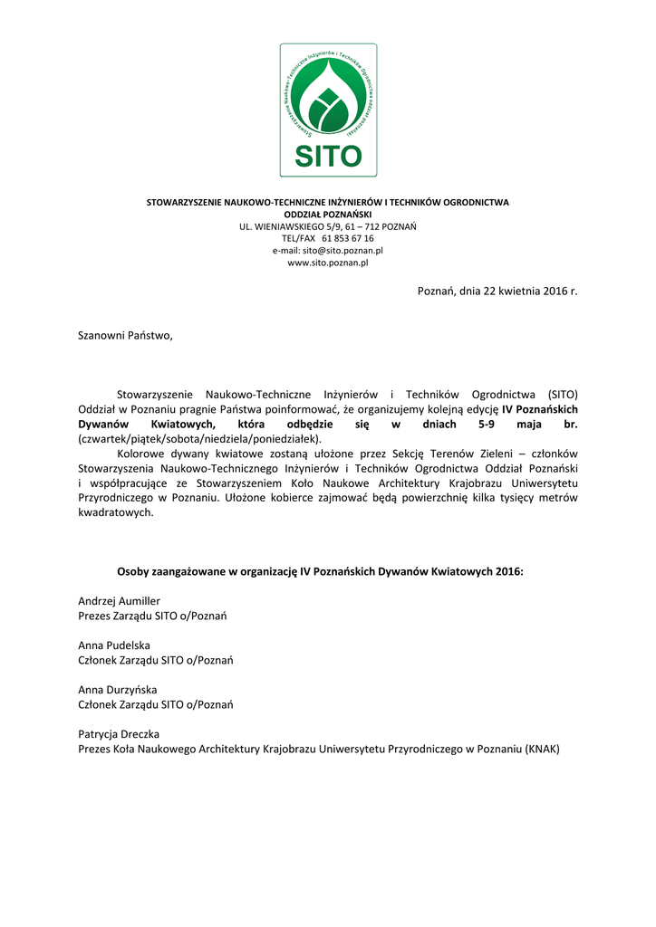 STOWARZYSZENIE NAUKOWO-TECHNICZNE INŻYNIERÓW I TECHNIKÓW OGRODNICTWA ODDZIAŁ POZNAŃSKI UL. WIENIAWSKIEGO 5/9, 61 – 712 POZNAŃ TEL/FAX 61 853 67 16 e-mail: [email protected] www.sito.poznan.pl Poznań, dnia 22 kwietnia 2016 r. Szanowni Państwo, Stowarzyszenie Naukowo-Techniczne Inżynierów i Techników Ogrodnictwa (SITO) Oddział w Poznaniu pragnie Państwa poinformować, że organizujemy kolejną edycję IV Poznańskich Dywanów Kwiatowych, która odbędzie się w dniach 5-9 maja br. (czwartek/piątek/sobota/niedziela/poniedziałek). Kolorowe dywany kwiatowe zostaną ułożone przez Sekcję Terenów Zieleni – członków Stowarzyszenia Naukowo-Technicznego Inżynierów i Techników Ogrodnictwa Oddział Poznański i współpracujące ze Stowarzyszeniem Koło Naukowe Architektury Krajobrazu Uniwersytetu Przyrodniczego w Poznaniu. Ułożone kobierce zajmować będą powierzchnię kilka tysięcy metrów kwadratowych. Osoby zaangażowane w organizację IV Poznańskich Dywanów Kwiatowych 2016: Andrzej Aumiller Prezes Zarządu SITO o/Poznań Anna Pudelska Członek Zarządu SITO o/Poznań Anna Durzyńska Członek Zarządu SITO o/Poznań Patrycja Dreczka Prezes Koła Naukowego Architektury Krajobrazu Uniwersytetu Przyrodniczego w Poznaniu (KNAK) Wytyczenie figur IV Poznańskich Dywanów Kwiatowych według projektu powierzyliśmy: Anna Pudelska Członek Zarządu SITO o/Poznań Mateusz Łusiak Mateusz Chorzępa Pragniemy nadmienić, że w dniu 22 kwietnia br. został rozstrzygnięty konkurs na realizację projektu IV Poznańskich Dywanów Kwiatowych 2016. Zwyciężył projekt Pani Anny Zacharek z Brzegu Dolnego, absolwentki Architektury Krajobrazu Uniwersytetu Przyrodniczego we Wrocławiu. Wytyczenie (specyfikacja) do projektu IV Poznańskich Dywanów Kwiatowych będą skrzypce, pięciolinia, klucz wiolinowy, logotyp Miasta Poznania, logotyp SITO o/Poznań, logotyp VEOLIA Energia Poznań S.A. Tegoroczne Poznańskie Dywany Kwiatowe będą nawiązywały do wielkiego wydarzenia kulturalnego w Poznaniu - 13. Międzynarodowego Konkursu Lutniczego im. Henryka Wieniawskiego oraz XV Międzynarodowego Konkursu Skrzypcowego im. Henryka Wieniawskiego. Podczas tworzenia „IV Poznańskich Dywanów Kwiatowych” nie tylko mieszkańcy naszego miasta i województwa ale i turyści z kraju oraz zagranicy, będą mogli podziwiać kolorowe kobierce ułożone z setek tysięcy główek tulipanów w postaci różnych figur. Kobierce powstaną w samym sercu Poznania i zostaną ułożone w parku Adama Mickiewicza na powierzchni trawnikowej przed Teatrem Wielkim im. Stanisława Moniuszki zachwycając oglądających. IV Poznańskie Dywany Kwiatowe jako wydarzenie kulturalne ożywią i uatrakcyjnią centrum Poznania na odcinku traktu Królewsko Cesarskiego z takimi obiektami jak Kościół Najświętszego Zbawiciela, Collegium Maius, Teatr Wielki im. Stanisława Moniuszki, Zamek Cesarski z Centrum Kultury Zamek, Pomnik Poznańskiego Czerwca 1956 roku, Pomnik Adama Mickiewicza, Collegium Minus i Aula Uniwersytecka z Salą Koncertową Filharmonii Poznańskiej im Tadeusza Szeligowskiego i Aula Nova. Przy życzliwości władz miasta Poznania może ono na stałe wpisać się na przyszłość w kalendarz imprez godnych zauważenia. IV Poznańskie Dywany Kwiatowe pozwalają oglądającym na zapoznanie się z mało znaną formą dekoracji miasta, a jednocześnie przybliżą różnorodność tulipanów. Powyższe wydarzenie jest doskonałą propozycją dla mieszkańców i turystów dając możliwość zbliżenia się do natury, poprawy samopoczucia, co jest jednym z aspektów szeroko propagowanej w ostatnim czasie hortiterapii. Pragniemy nadmienić, że tak jak w latach ubiegłych, IV Poznańskie Dywany Kwiatowe 2016 zostały objęte Patronatem Honorowym Marszałka Województwa Wielkopolskiego Marka Woźniaka i Prezydenta Miasta Poznania Jacka Jaśkowiaka. Materiał Kwiatowy IV Poznańskich Dywanów Kwiatowych dostarczają Państwo Barbara i Michał Szymanowscy Specjalistyczne Gospodarstwo Ogrodnicze w Gołuskach. Wsparcia finansowego udzieliła firma Veolia Energia Poznań S.A. IV Poznańskim Dywanom będzie towarzyszyć XX Wystawa Tulipanów, której uroczyste otwarcie odbędzie się w holu Auli Uniwersytetu im. Adama Mickiewicza w Poznaniu w dniu 6 maja br. Kompozycję z kwiatów zostaną ułożone przez florystów – członków Stowarzyszenia Naukowo-Technicznego Inżynierów i Techników Ogrodnictwa Oddział Poznański oraz współpracującą ze Stowarzyszeniem Sekcją Florystyczną Koło Naukowego Ogrodników Wydziału Ogrodnictwa i Architektury Krajobrazu Uniwersytetu Przyrodniczego w Poznaniu. Tegoroczną XX Wystawę Tulipanów będą realizowały: Andrzej Aumiller Prezes Zarządu SITO o/Poznań dr hab. Agnieszka Krzymińska Wiceprezes SITO o/Poznań Anna Durzyńska Członek Zarządu SITO o/Poznań Luiza Dawidowicz Członek Zarządu SITO o/Poznań Monika Bartkowiak Członek Zarządu SITO o/Poznań Maria Matuszczak Członek Zarządu SITO o/Poznań Jednocześnie pragniemy Państwa zaprosić na konferencję prasową IV Poznańskich Dywanów Kwiatowych 2016, która odbędzie się w dniu 5 maja (czwartek) o godzinie 12.00 w Federacji Stowarzyszeń NOT ul. Wieniawskiego 5/9 Sala nr 117 (I piętro). Mamy wielką nadzieję, że przyłączą się Państwo do naszej inicjatywy. Z wyrazami szacunku, Oddziału Poznańskiego SITO mgr inż. Andrzej Aumiller STOWARZYSZENIE NAUKOWO-TECHNICZNE INŻYNIERÓW I TECHNIKÓW OGRODNICTWA ODDZIAŁ POZNAŃSKI UL. WIENIAWSKIEGO 5/9, 61 – 712 POZNAŃ TEL/FAX 61 853 67 16 e-mail: [email protected] www.sito.poznan.pl Poznań, dnia 22 kwietnia 2016 r. Szanowni Państwo, Stowarzyszenie Naukowo-Techniczne Inżynierów i Techników Ogrodnictwa (SITO) Oddział w Poznaniu pragnie Państwa poinformować, że organizujemy kolejną edycję IV Poznańskich Dywanów Kwiatowych, która odbędzie się w dniach 5-9 maja br. (czwartek/piątek/sobota/niedziela/poniedziałek). Kolorowe dywany kwiatowe zosta