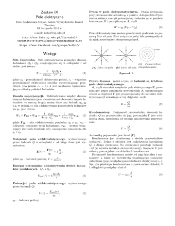 Zestaw IX Pole elektryczne Ewa Kądzielawa-Major, Adam Wyrzykowski, Kamil Ziemian 19 listopada 2013 r. e-mail: [email protected] Praca w polu elektrostatycznym. Praca wykonana przy przenoszeniu ładunku q0 z punktu A do punktu B jest równa różnicy energii potencjalnej ładunku q0 w punkcie końcowym B i początkowym A, czyli W “ q0 pVB ´ VA q . (6) Pole elektrostatyczne można przedstawić graficznie za pomocą linii sił pola (linii natężenia pola) lub prostopadłych do nich powierzchni ekwipotencjalnych. http://www.fais.uj.edu.pl/dla-szkol/ warsztaty-z-fizyki/szkoly-ponadgimnazjalne https://www.facebook.com/groups/kolkof/ Wstęp Siła Coulomba. Siła oddziaływania pomiędzy dwoma ładunkami Q1 i Q2 , znajdującymi się w odległości r od siebie, jest równa: F“ 1 Q1 Q2 r , 4πε0 εr r2 r (1) (a) Linie sił pola (c) Powierzchnie (b) Linie sił pola ekwipotencjalne Rysunek 1 gdzie ε0 – przenikalność elektryczna próżni, εr – względna Prawo Gaussa mówi o tym, że ładunki są źródłem przenikalność elektryczna ośrodka wypełniającego przepola elektrostatycznego. strzeń (dla próżni εr “ 1), r jest wektorem reprezentuΦ, czyli strumień natężenia pola elektrycznego E, przejącym różnicę położeń ładunków. nikający przez zamkniętą powierzchnię S, ograniczającą obszar o objętości V jest proporcjonalny do ładunku elekZasada superpozycji. Oddziaływanie między dwoma trycznego Q zawartego w tej objętości, czyli: danymi ładunkami jest niezależne od obecności innych łaQ dunków, to znaczy, że gdy mamy dane trzy ładunki q1 , q2 (7) Φ“ . i q3 w próżni, to siła oddziaływania pozostałych ładunków ε0 na q1 , jest równa: Kondensatory. Pojemność przewodnika: stosunek ła1 q1 q3 1 q1 q2 r ` r , (2) F1 “ F12 ` F13 “ dunku Q na przewodniku do jego potencjału V jest wiel12 13 3 3 4πε0 r12 4πε0 r13 kością stałą, niezależną od stopnia naładowania przewodgdzie F12 – siła oddziaływania pomiędzy q1 a q2 , r12 – nika. odległość pomiędzy tymi ładunkami, r12 – wektor wskaQ C“ . (8) zujący kierunek działania siły, analogiczne oznaczenia dla V q1 i q3 . Jednostką pojemności jest farad [F]. Kondensator jest zbudowany z dwóch przewodników Natężenie pola elektrostatycznego wytworzonego (okładek). Jedna z okładek jest naładowana ładunkiem przez ładunek Q w odległości r od niego dane jest wyQ, a druga uziemiona. Na uziemionej powstaje ładunek rażeniem: ´Q (w wyniku indukcji eletrostatycznej). Napięcie U jest Fprq Q Eprq “ “ k 2, (3) różnicą potencjałów na okładkach kondesatora. q0 r Pojemność kondensatora zależy od jego kształtu i rozmiarów, a także od dielektryka znajdującego pomiędzy 1 gdzie q0 – ładunek próbny, k “ 4πε0 εr . okładkami (jego względnej przenikalności elektrycznej εr ). Np. dla płaskiego kondensatora o powierzchni okładek S Energia potencjalna oddziaływania dwóch ładuni odległości pomiędzy nimi d: ków punktowych Q1 i Q2 : S Q1 Q2 C “ ε0 εr . (9) Epot prq “ k . (4) d r Potencjał pola elektrostatycznego wytworzonego przez ładunek Q: V prq “ q0 – ładunek próbny. Epot prq , q0 (5) Pytania wstępne Zadania nieobliczeniowe Zadanie 5 [NZzF, 126] Pytanie 1 Spotyka się niekiedy stwierdzenie, że linie sił pola elektrostatycznego to linie, po których porusza się ładunek próbny umieszczony w tym polu. Czy to stwierdzenie jest poprawne? Ile razy większa jest praca wykonana w polu eletrostatycznym między punktami A i B po drodze 1 od tej wykonanej po drodze 2? Zadanie 6 [NzzF, 147] Pytanie 2 Rysunek 2 Jaka będzie pojemność zastępcza układu trzech kondensatorów połączonych szeregowo (a), a jaka połączonych równolegle (b)? Półkulista czasza naładowane jest ze stałą gęstością powierzchniową δ. Wykaż, że płaszczyzna „zamykająca” czaszę jest ekwipotencjalna. Zadanie 7 [NZzF, roz.1, zad. 59] W jednorodnej kuli wykonano sferyczną wnękę, której środek nie pokrywa się ze środkiem kuli. Wy(a) Połączenie szeregowe kazać, że pole sił ciężkości wytwarzane przez tę bryłę jest wewnątrz (b) Połączenie równoległe wnęki jednorodne. Uwaga. W kursie szkoły średniej Rysunek 3 poprzestaje się często na opisie poRysunek 5 la grawitacyjnego w otoczeniu masy punktowej (lub kuli ze sferycznie Pytanie 3 symetrycznym rozkładem masy). Rozpatrzmy jednorodną Weźmy przewodnik o dowolnym kształcie znajdujący się kulę o masie M , promieniu R i gęstości ρ. Weźmy dowolną w zewnętrznym polu elektrostatycznym. Co możemy po- powierzchnię kulistą (sferę) o promieniu r ď R współśrodwiedzieć o natężeniu pola wewnątrz przewodnika? Jakie kową z naszą kulą. Z prawa Gaussa dla pola grawitacyjjest natężenie w pobliżu powierzchni przewodnika? Jaki nego (i symetrii) mamy: jest potencjał na jego powierzchni i w środku? 1 Φg “ m, (10) 4πG Pytanie 4 m - masa zawarta wewnątrz sfery. 1 4 4 4πr2 ρ “ πr3 g Ñ gprq “ Gπρr, 4πG 3 3 Układ przewodników składa się z metalowej kuli o promieniu R1 i metalowej powłoki o wewnętrznym promieniu R2 i zewnętrznym R3 . Przed otoczeniem kuli powłoką wprowadzono na nią ładunek dodatni Q. Uzupełnij tabelę: stąd: gprq “ g0 (11) gdzie g0 – natężenie na powierzchni kulio masie M . Zadanie 8 [XXX OF, etap wstępny] Rysunek 4 Przedziały dla odległości od środka kuli r 0 ď r ď R1 R1 ă r ă R2 R2 ă r ă R3 R3 ă r r , R Natężenie pola elektrostatycznego Jaki jest potencjał w punktach: A, B, C? Jak będzie wyglądała powyższa tabela w przypadku, gdy powłoka jest uziemiona? Dokładnie wśrodku nienaładowanego kondensatora spoczywa ładunek punktowy. Czy położenie ładunku jest położeniem równowagi trwałej? (Należy uwzględnić tylko oddziaływanie elektrostatyczne). Zadania obliczeniowe Uwaga: ż xdx “ ln x ` C, Zadanie 9 [g-OF, 8.9] W jednorodnym polu elektrycznym o natężeniu E umieszczono jednorodną kulę meta