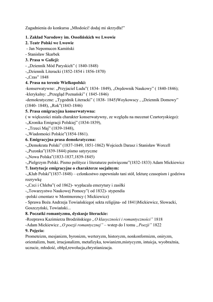 Zagadnienia do konkursu „Młodości! dodaj mi skrzydła!” 1. Zakład Narodowy im. Ossolińskich we Lwowie 2. Teatr Polski we Lwowie - Jan Nepomucen Kamiński - Stanisław Skarbek 3. Prasa w Galicji: - „Dziennik Mód Paryskich” ( 1840-1848) -„Dziennik Literacki (1852-1854 i 1856-1870) -„Czas” 1848 4. Prasa na terenie Wielkopolski: -konserwatywne: „Przyjaciel Ludu”( 1834- 1849), „Orędownik Naukowy” ( 1840-1846); -klerykalny: „Przegląd Poznański” ( 1845-1846) -demokratyczne: „Tygodnik Literacki” ( 1838- 1845)Woykowscy , „Dziennik Domowy” (1840- 1848), „Rok”(1843-1846) 5. Prasa emigracyjna konserwatywna: ( w większości miała charakter konserwatywny, ze względu na mecenat Czartoryskiego): -„Kronika Emigracji Polskiej” (1834-1839), - „Trzeci Maj” (1839-1848), -„Wiadomości Polskie”(1854-1861). 6. Emigracyjna prasa demokratyczna: -„Demokrata Polski” (1837-1849, 1851-1862) Wojciech Darasz i Stanisław Worcell -„Pszonka”(1839-1844) pismo satyryczne -„Nowa Polska”(1833-1837,1839-1845) -„Pielgrzym Polski. Pismo polityce i literaturze poświęcone”(1832-1833) Adam Mickiewicz 7. Instytucje emigracyjne o charakterze socjalnym: -„Klub Polski”(1837-1848) – czlonkostwo zapewniało tani stół, lekturę czasopism i godziwa rozrywkę -„Czci i Chleba”( od 1862)- wyplacala emerytury i zasiłki -„Towarzystwo Naukowej Pomocy”( od 1832)- stypendia -polski cmentarz w Montmorency ( Mickiewicz) - Sprawa Boża Andrzeja Towiańskiego( sekta religijna- od 1841)Mickiewicz, Slowacki, Goszczyński, Towiański... 8. Poczatki romantyzmu, dyskusje literackie: -Rozprawa Kazimierza Brodzińskiego „O klasyczności i romantyczności” 1818 -Adam Mickiewicz „O poezji romantycznej” – wstep do I tomu „Poezji” 1822 9. Pojęcia: Prometeizm, mesjanizm, byronizm, werteryzm, historyzm, nonkonformizm, oniryzm, orientalizm, bunt, irracjonalizm, metafizyka, towianizm,mistycyzm, intuicja, wyobrażnia, uczucie, młodość, obłęd,rewolucja,chrystianizacja. Literatura romantyzmu: 10. Kazimierz Delavigne „Warszawianka” 11. Zygmunt Krasiński- życie i twórczość ( „Nie-Boska komedia”) 12. Cyprian Kamil Norwid- życie i twórczość („ Moja piosnka II”, „Fortepian Szopena”, „Coś ty Atenom zrobił, Sokratesie...”) 13. Aleksander Fredro – życie i twórczość („Zemsta”, „Śluby panieńskie”) 14. Liryka okresu międzypowstaniowego ( Bohdan Zaleski,Teofil Lenartowicz, Gustaw Ehrenberg,Władysław Syrokomla) 15. Powieść ludowa – Józef Ignacy Kraszewski ( „Chata za wsią”, „Jemioła”, „Historia kołka w płocie”) 16. Epistolografia epoki romantyzmu ( Juliusz Słowacki, Adam Mickiewicz) 17. Juliusz Słowacki ( zagadnienia): 1. Kto o pierwszych tomach poezji Słowackiego powiedział: „Jest to gmach piękną architekturą stawiony, jak wzniosły kościół – ale Boga w nim nie ma”? 2. W 1836 r. Słowacki wyrusza w trwającą ponad rok podróż. Wymień 3 najważniejsze miejsca podróży. 3. Romantyczna podróż Słowackiego znalazła swe odbicie w późniejszych utworach. Wymień 3 tytuły utworów zainspirowanych podróżą. 4. Podaj tytuł utworu Słowackiego z tzw. okresu mistycznego. Na czym polegał ten okres twórczości? 5. Słowacki jest autorem arcydzieła romantycznej epistolografii. Kto jest głównym adresatem listów Słowackiego? 6. Gatunkiem najchętniej uprawianym przez młodego Słowackiego jest powieść poetycka. Podaj przynajmniej jeden tytuł utworu należącego do tego gatunku. 7. Podaj tytuł poematu dygresyjnego, którego autorem jest Juliusz Słowacki. Podaj cechy tego gatunku. 8. Jeden z utworów Słowackiego jest najważniejszym przykładem stylizacji biblijnej w polskiej literaturze romantycznej. Podaj tytuł utworu i omów jego tematykę. 9. Jaką rolę w życiu i twórczości Juliusza Słowackiego odegrała Andrzej Towiański? 10. Z którego utworu J. Słowackiego pochodzi cytat: „Chodzi mi o to, aby język giętki Powiedział wszystko, co pomyśli głowa;” 11. Z którego utworu J. Słowackiego pochodzi cytat: „Lecz zaklinam – niech żywi nie tracą nadziei I przed narodem niosą oświaty kaganiec; A kiedy trzeba – na śmierć idą po kolei, Jak kamienie przez Boga rzucane na szaniec...” 18. Adam Mickiewicz ( zagadnienia): 1. Biografia literacka Adama Mickiewicza. 2. Ballady: „Świteź”, „Romantyczność” i inne do wyboru ( przeczytać ballady, definicja ballady, cechy ballady ). 3. „Sonety krymskie” ( przeczytać „Stepy akermańskie”, definicja sonetu, ogólne informacje na temat Sonetów krymskich ). 4. „Dziady” ( przeczytać „Dziady” cz. II, ogólne informacje na temat wszystkich części „Dziadów” ). 5. „Reduta Ordona”(przeczytać wiersz, kontekst historyczny utworu). 6. „Pan Tadeusz” ( przeczytać „Inwokację”, opracowanie lektury, definicja epopei narodowej ). 7. Liryka miłosna A. Mickiewicza ( przeczytać wiersze: „Do M”, „Niepewność” ). 8. Liryki lozańskie ( przeczytać wiersze: „Nad wodą wielką i czystą”, „Polały się łzy” ). 9. Bajki A. Mickiewicz ( przeczytać bajkę „Przyjaciele” i inne do wyboru ). Autorzy zagadnień do powtórki: Aneta Kufel, Ewa Baszak, Bożena Blansjaar Życzymy miłej lektury!